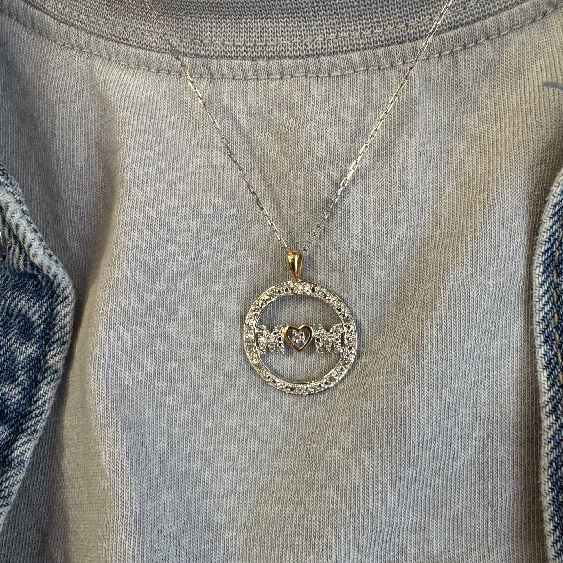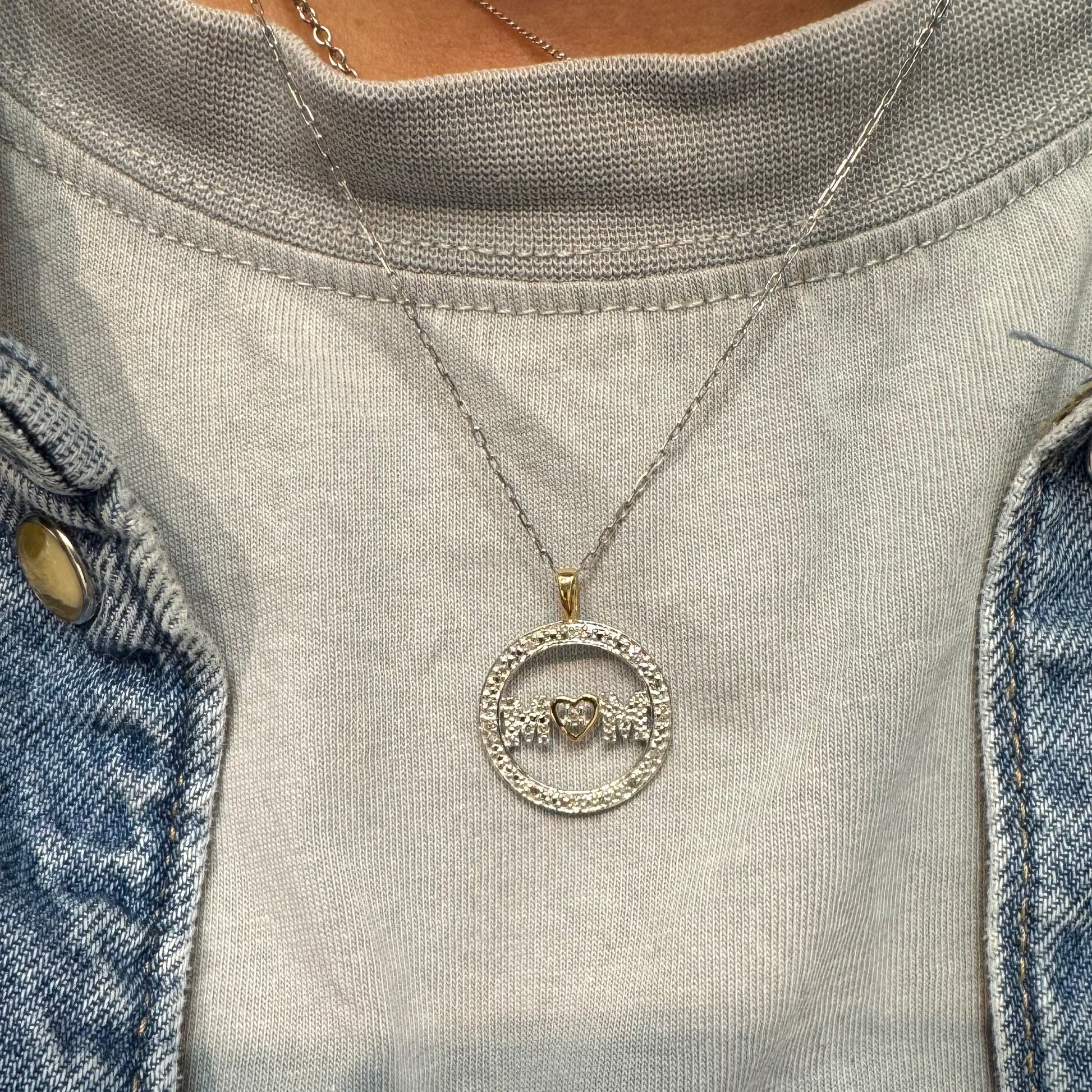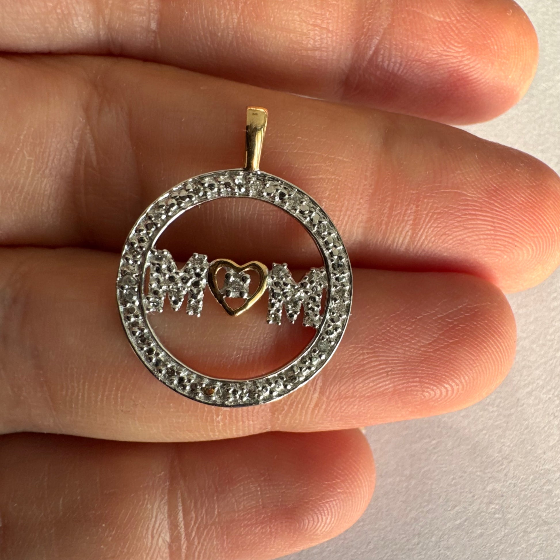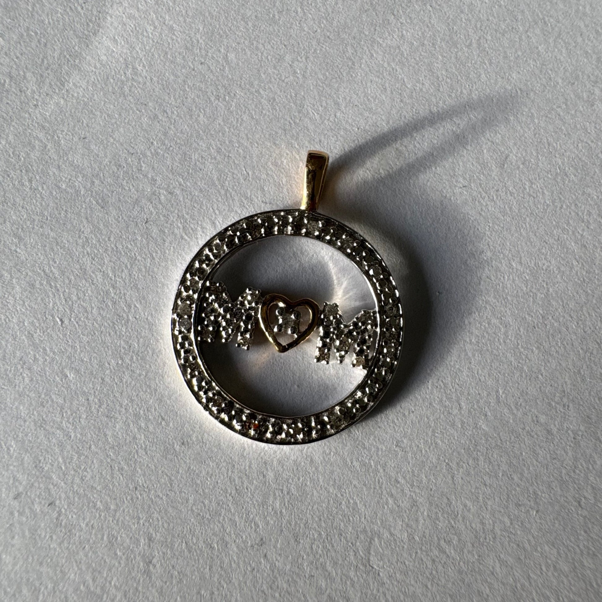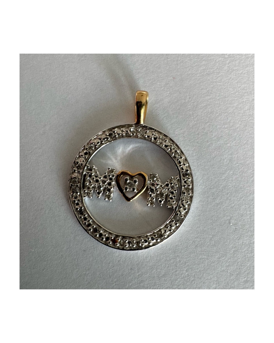 במרכזו כיתוב MOM משובץ יהלומים ולב זהב קטן שמחבר בין האותיות.