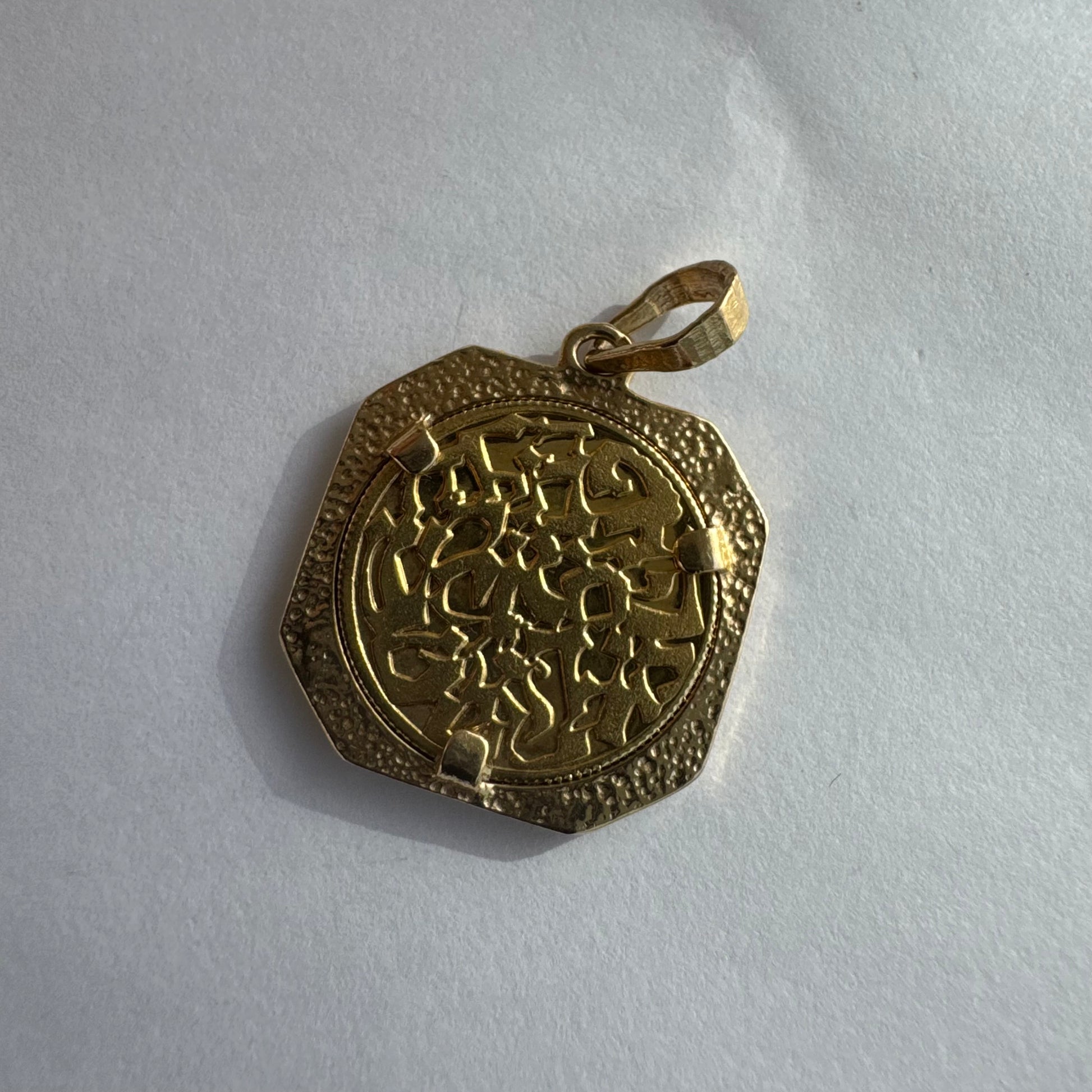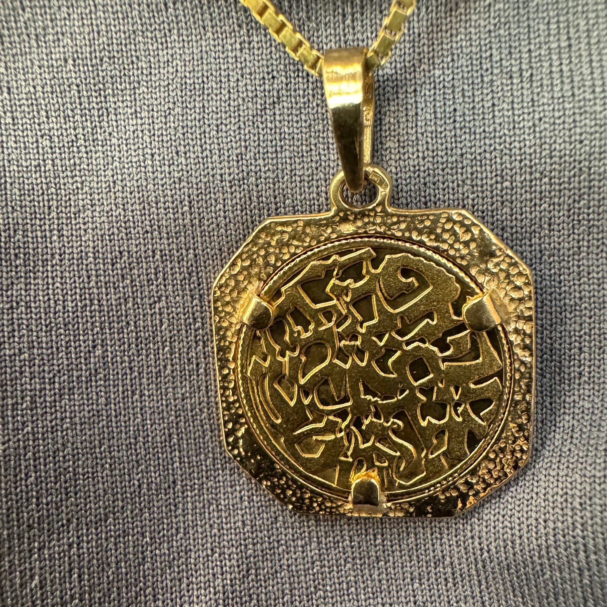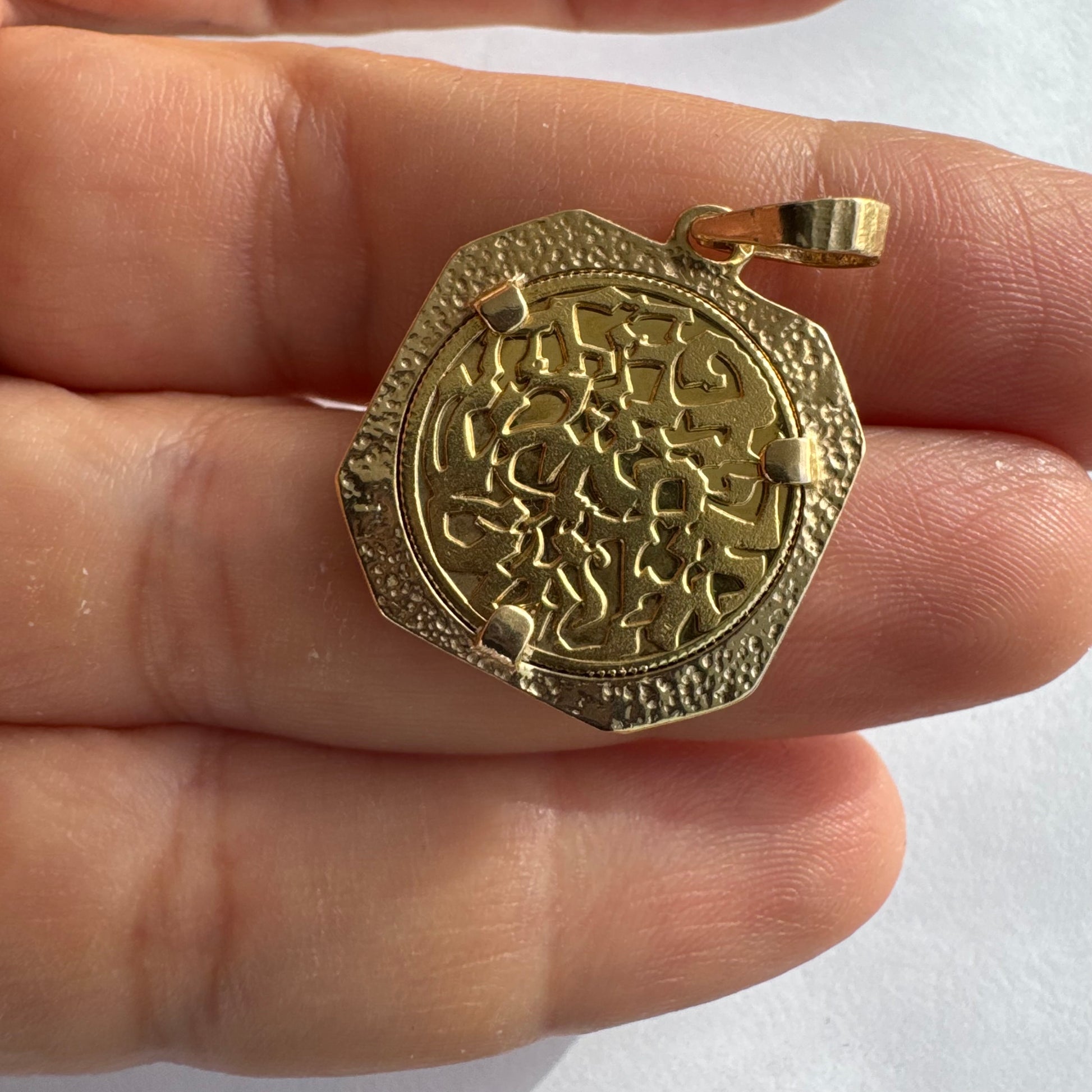 לתליון מסגרת מתומנת המעניקה לו מראה וינטג’י ועל־זמני גימור מט־מבריק משתלב עם עבודת חריטה מדויקת, היוצרת תכשיט בעל עומק ומשמעות.