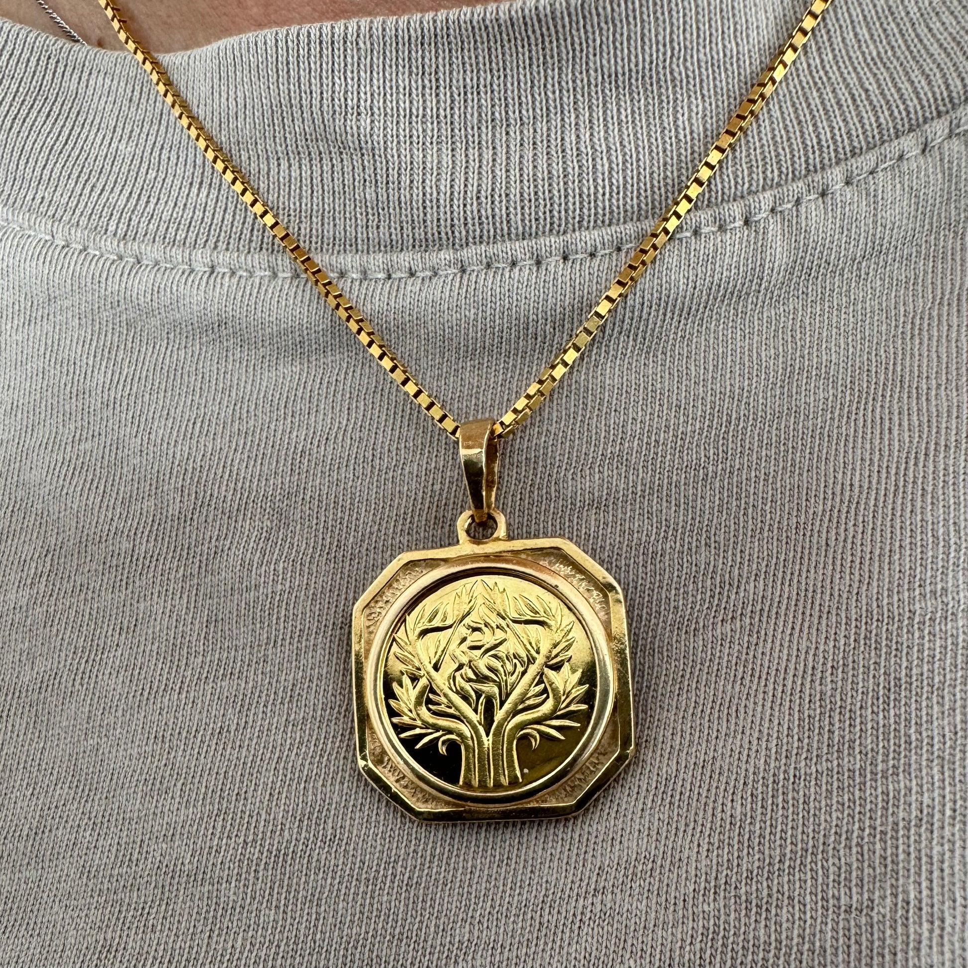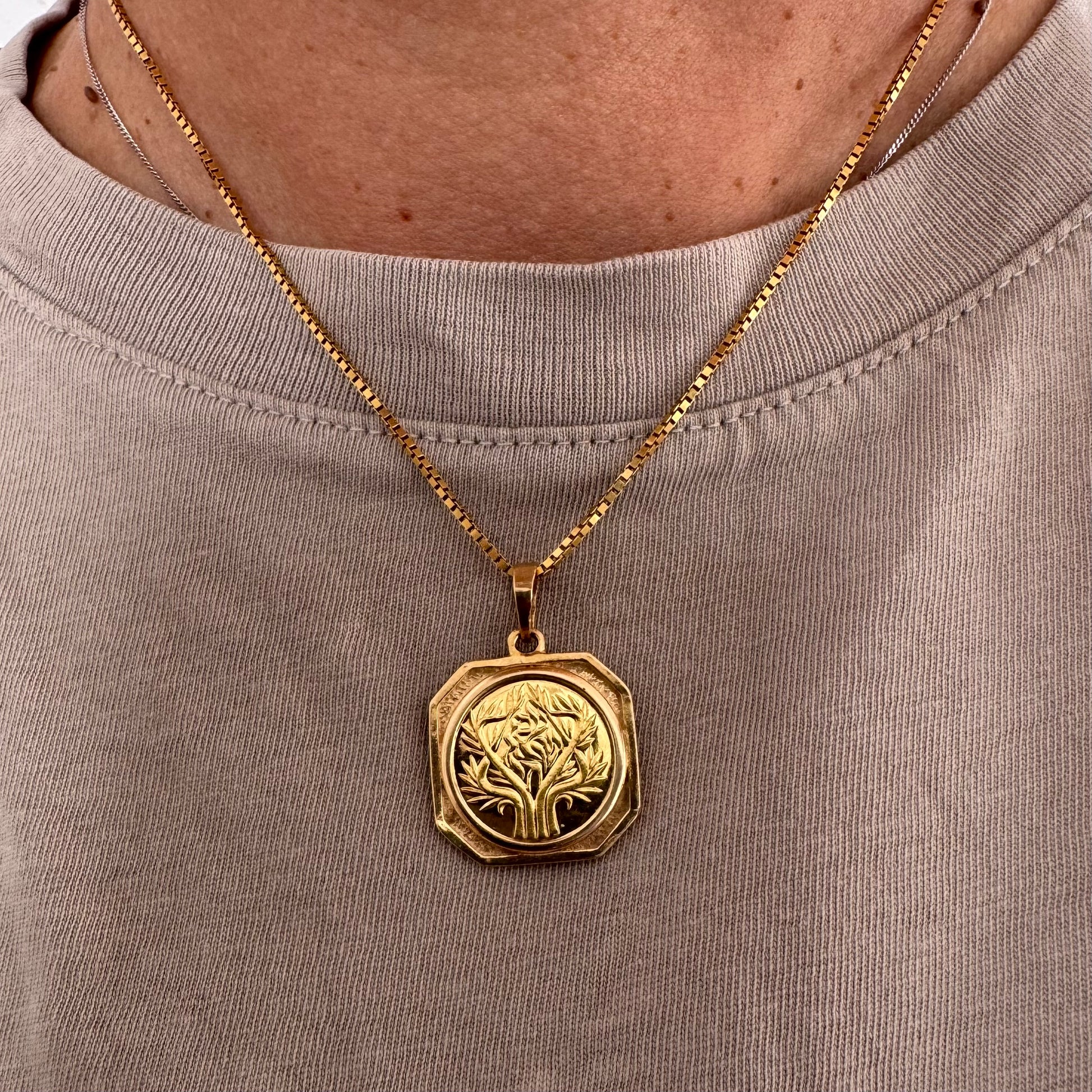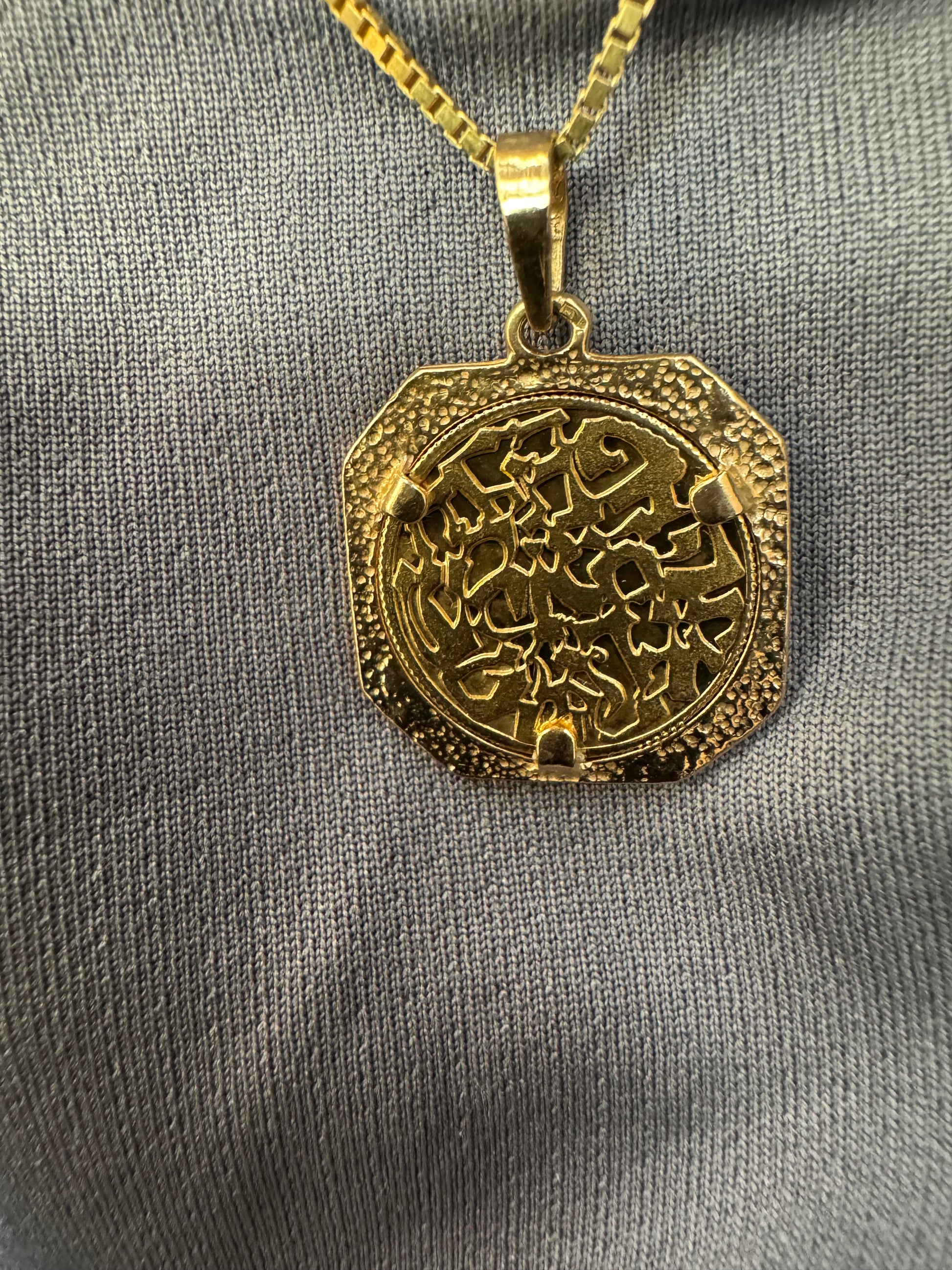 לתליון מסגרת מתומנת המעניקה לו מראה וינטג’י ועל־זמני גימור מט־מבריק משתלב עם עבודת חריטה מדויקת, היוצרת תכשיט בעל עומק ומשמעות.