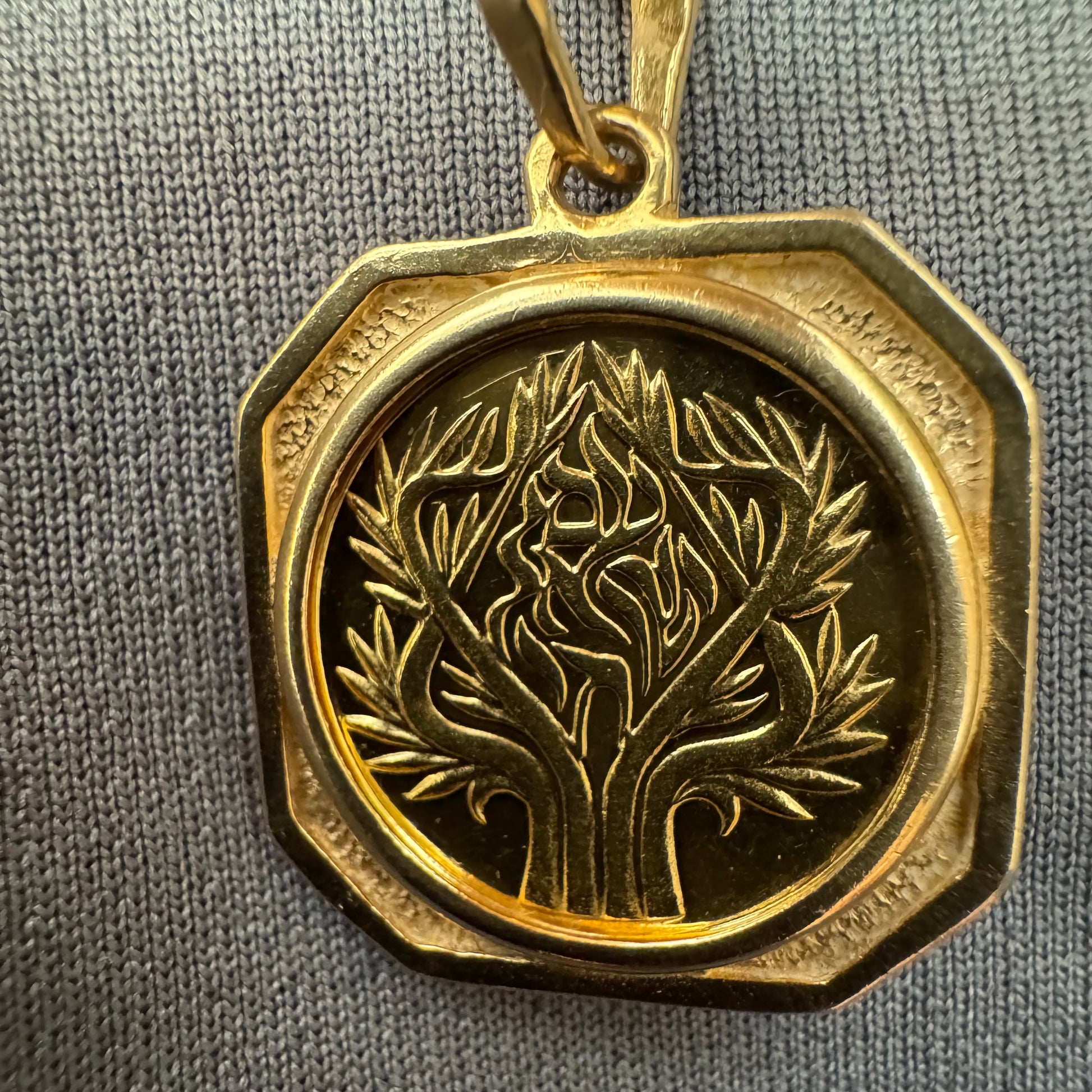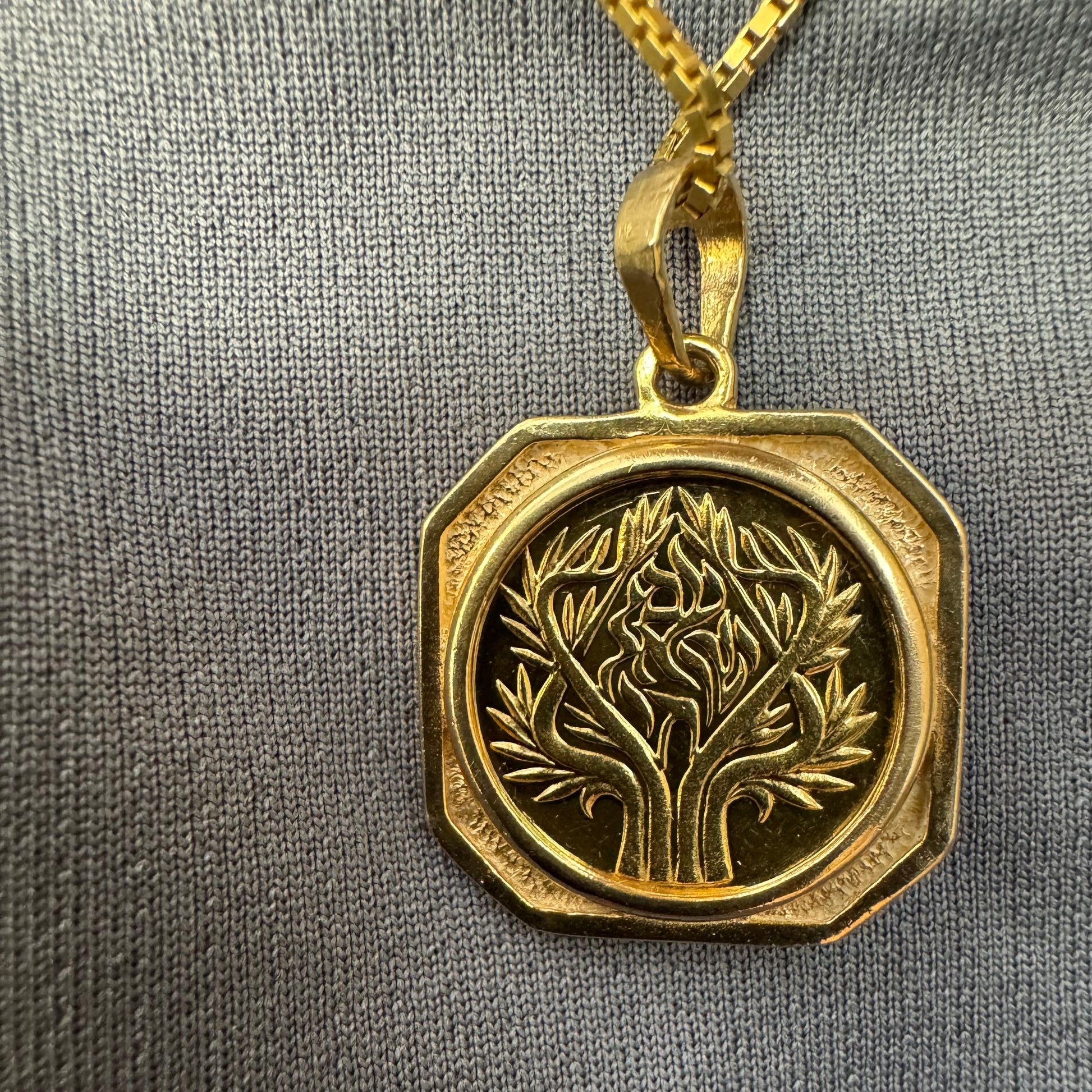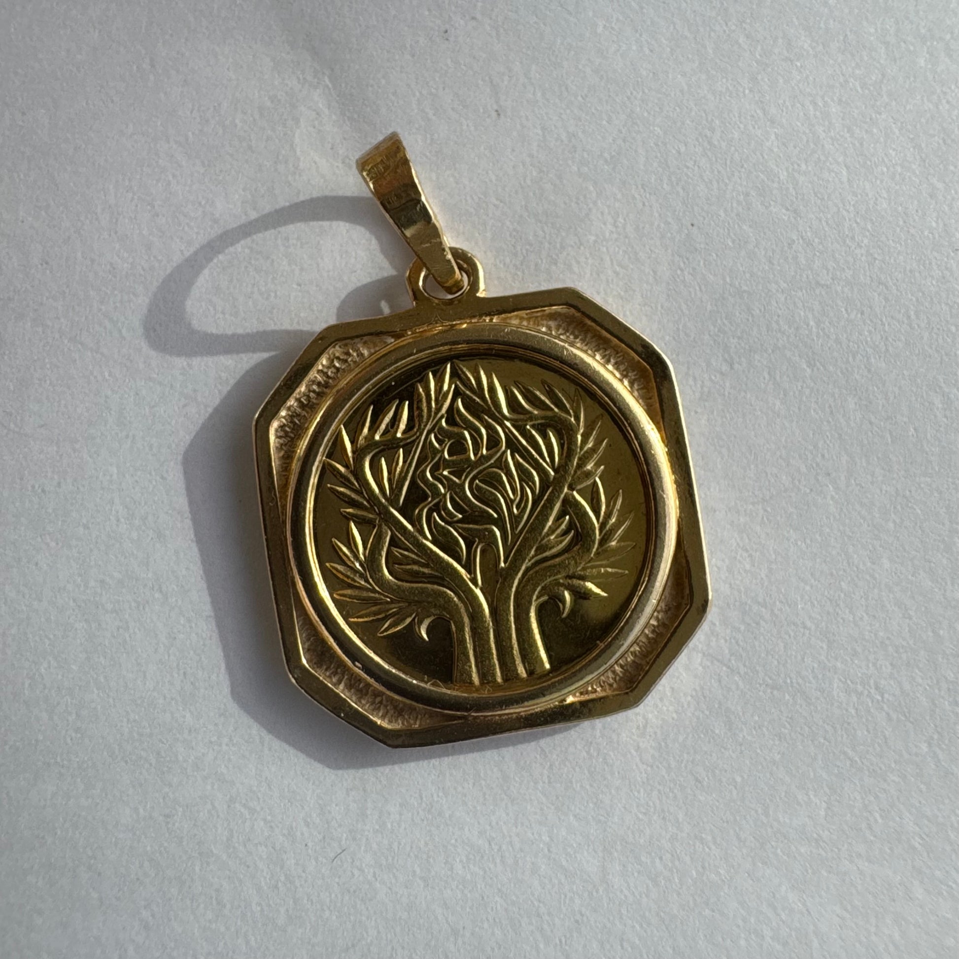תליון זהב צהוב 14 קראט בעיצוב קלאסי עם נוכחות סמלית חזקה. במרכז התליון חריטה עדינה של עץ חיים, סמל לצמיחה, חיבור ושפע וכיתוב ״שמע ישראל״ ובצד השני אותיות ה-א״ב.
