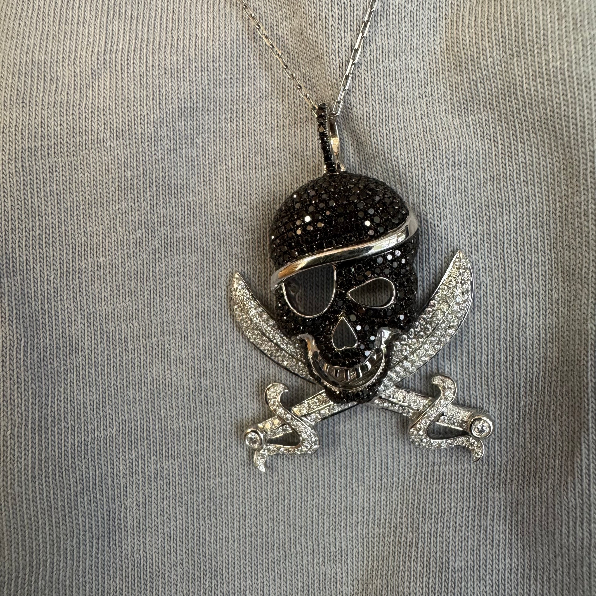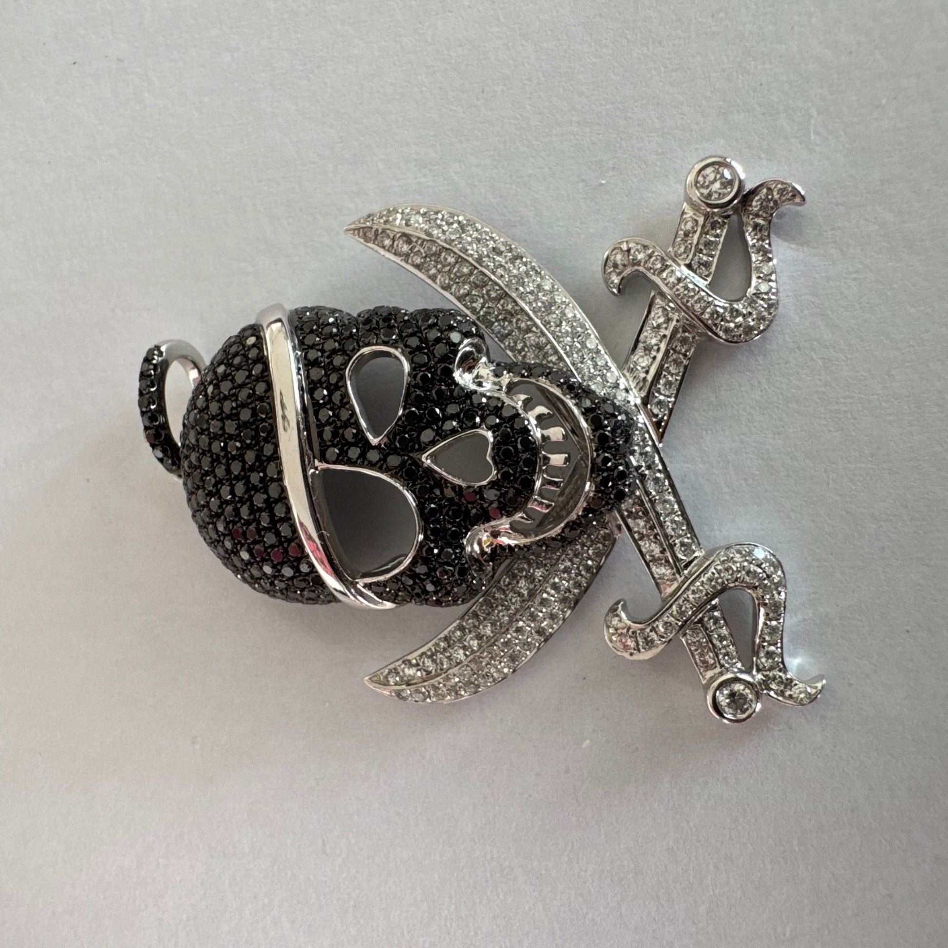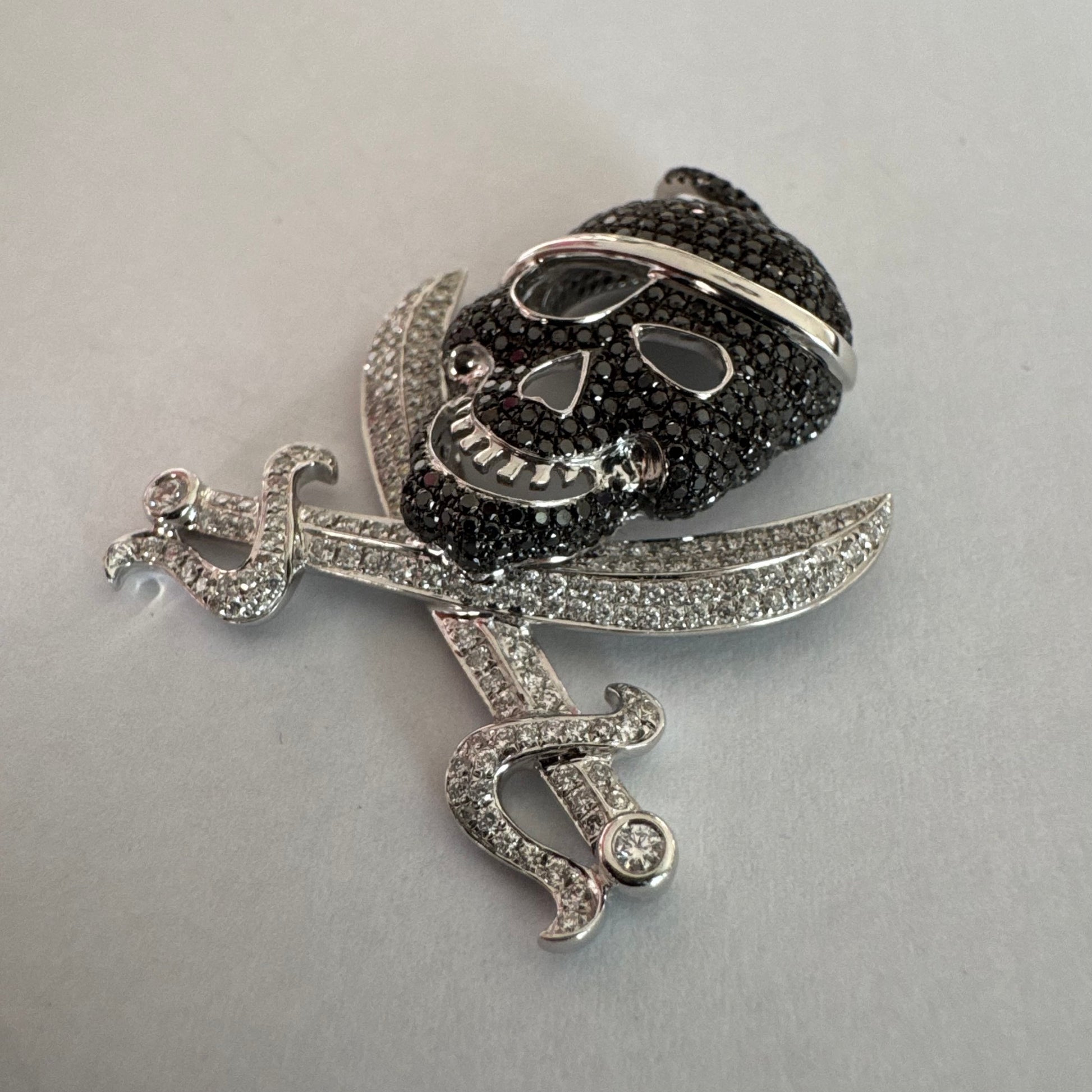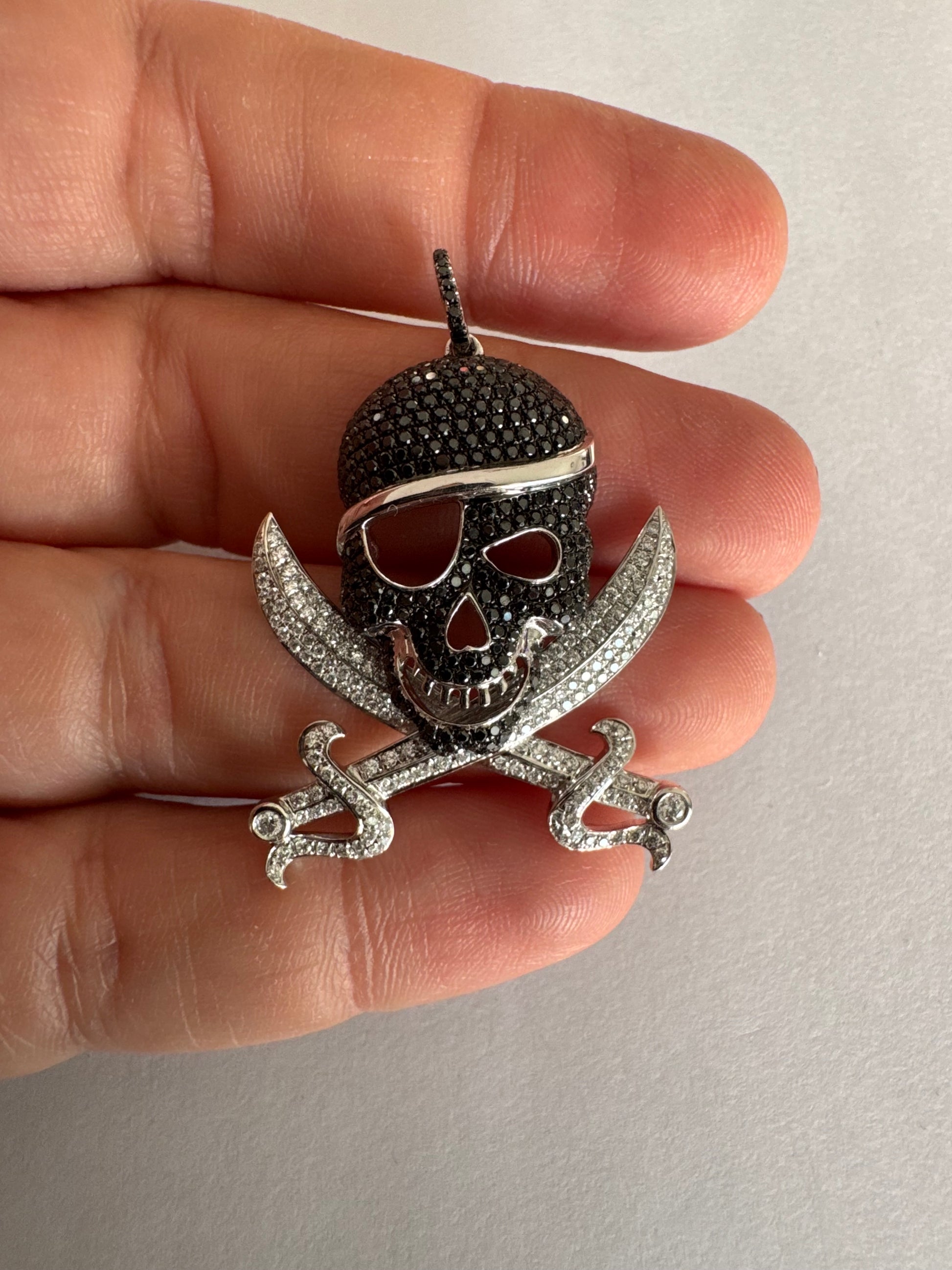 תליון זהב 14 קראט בצורת גולגולת/פיראט משובץ יהלומים לבנים ויהלומים שחורים בשיבוץ פאבה צפוף.
