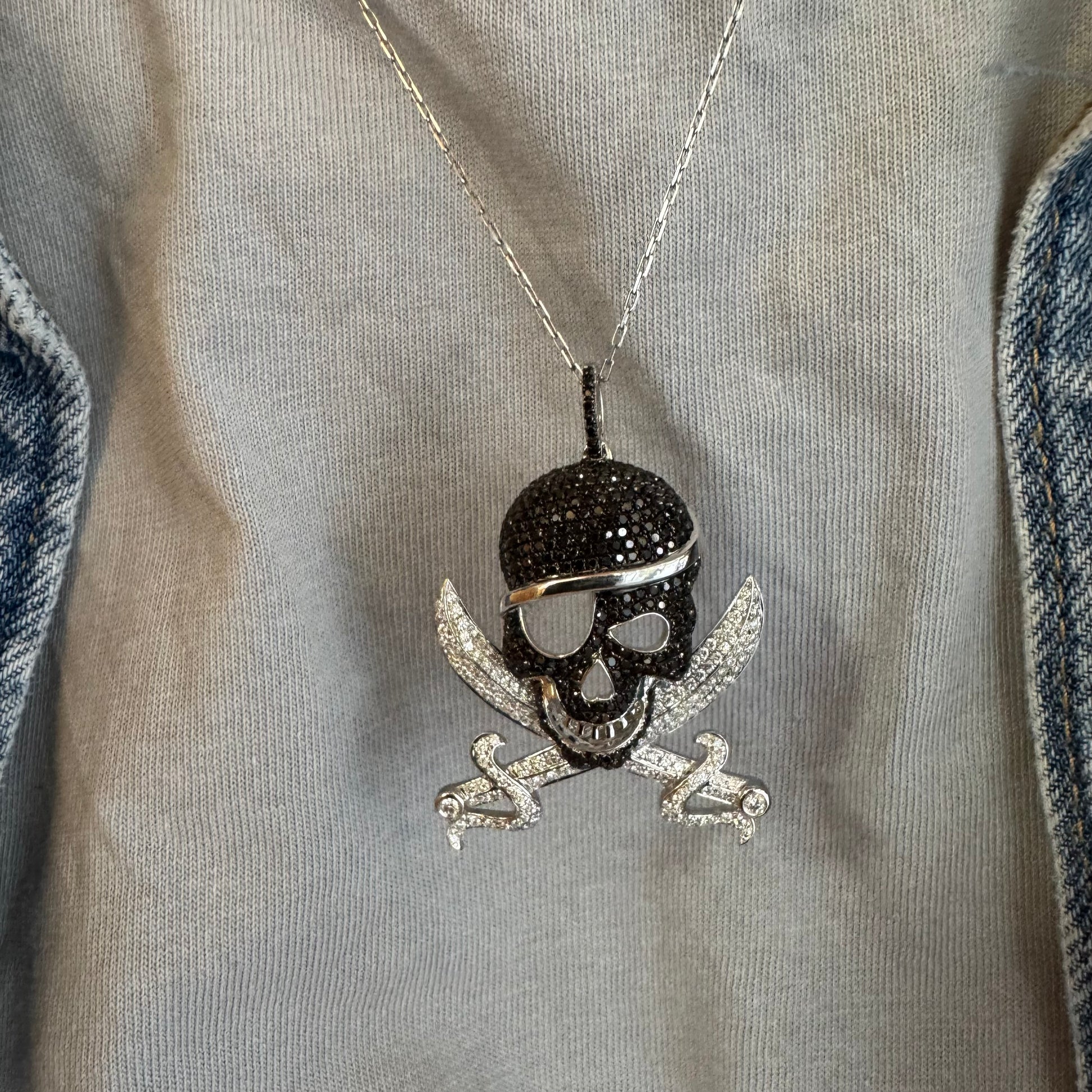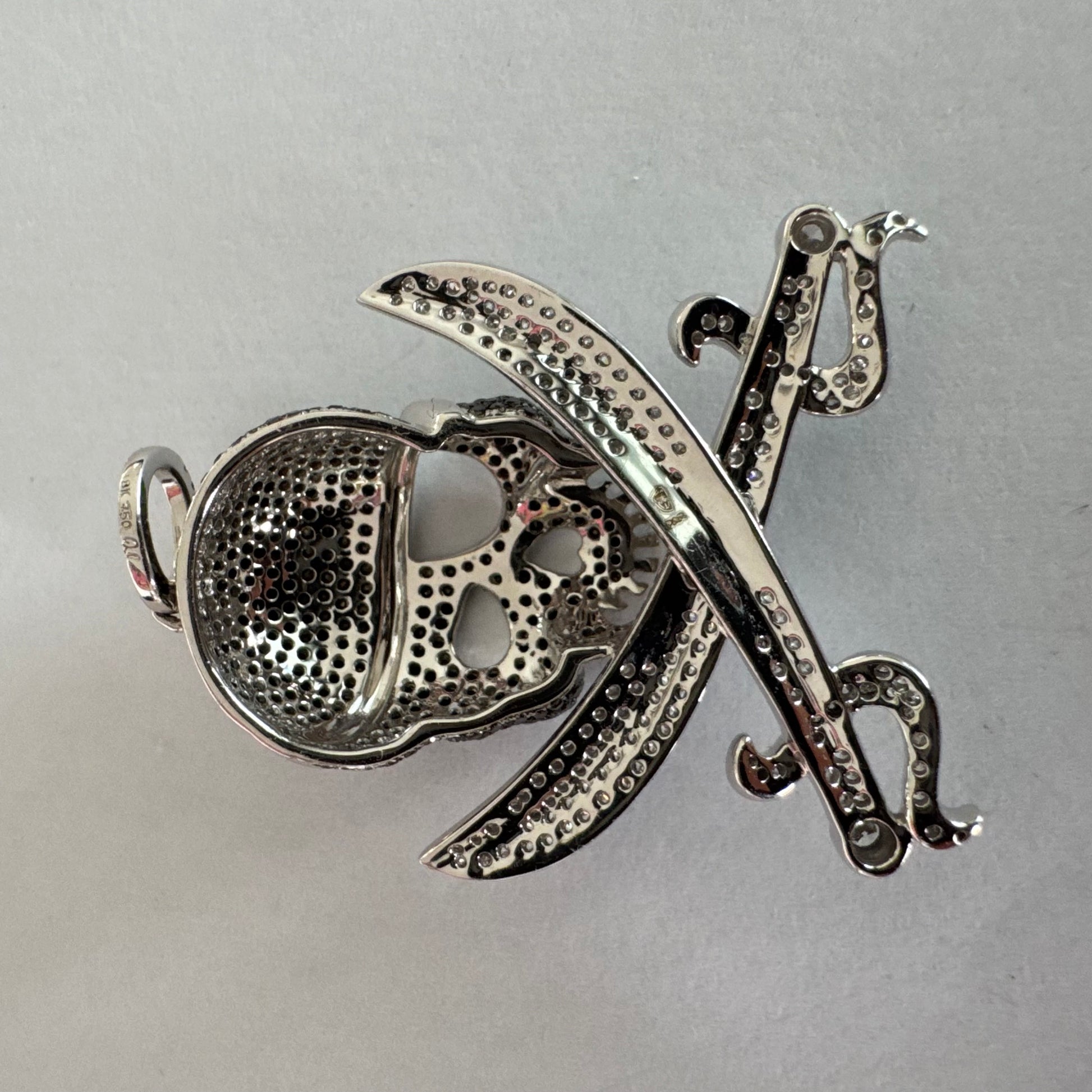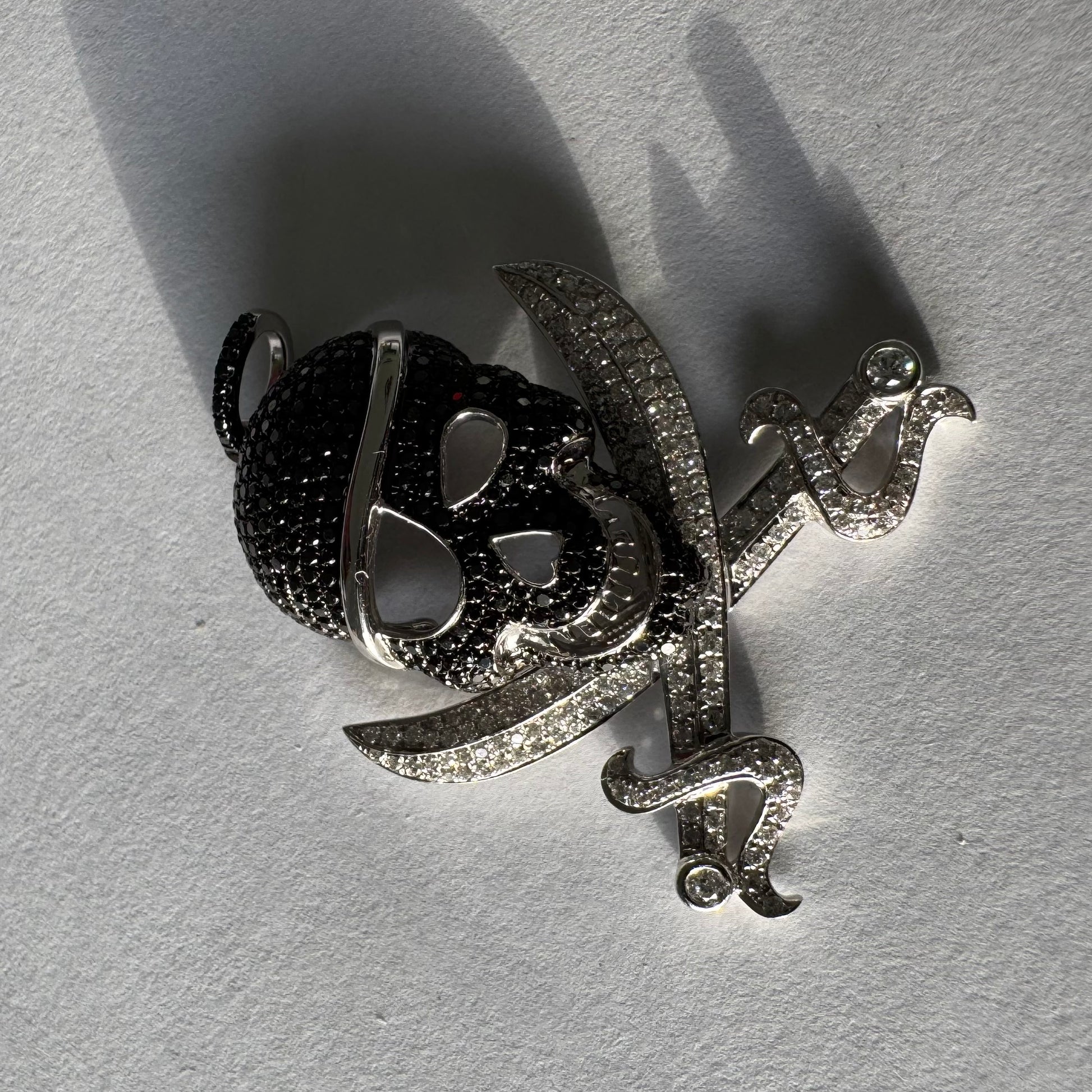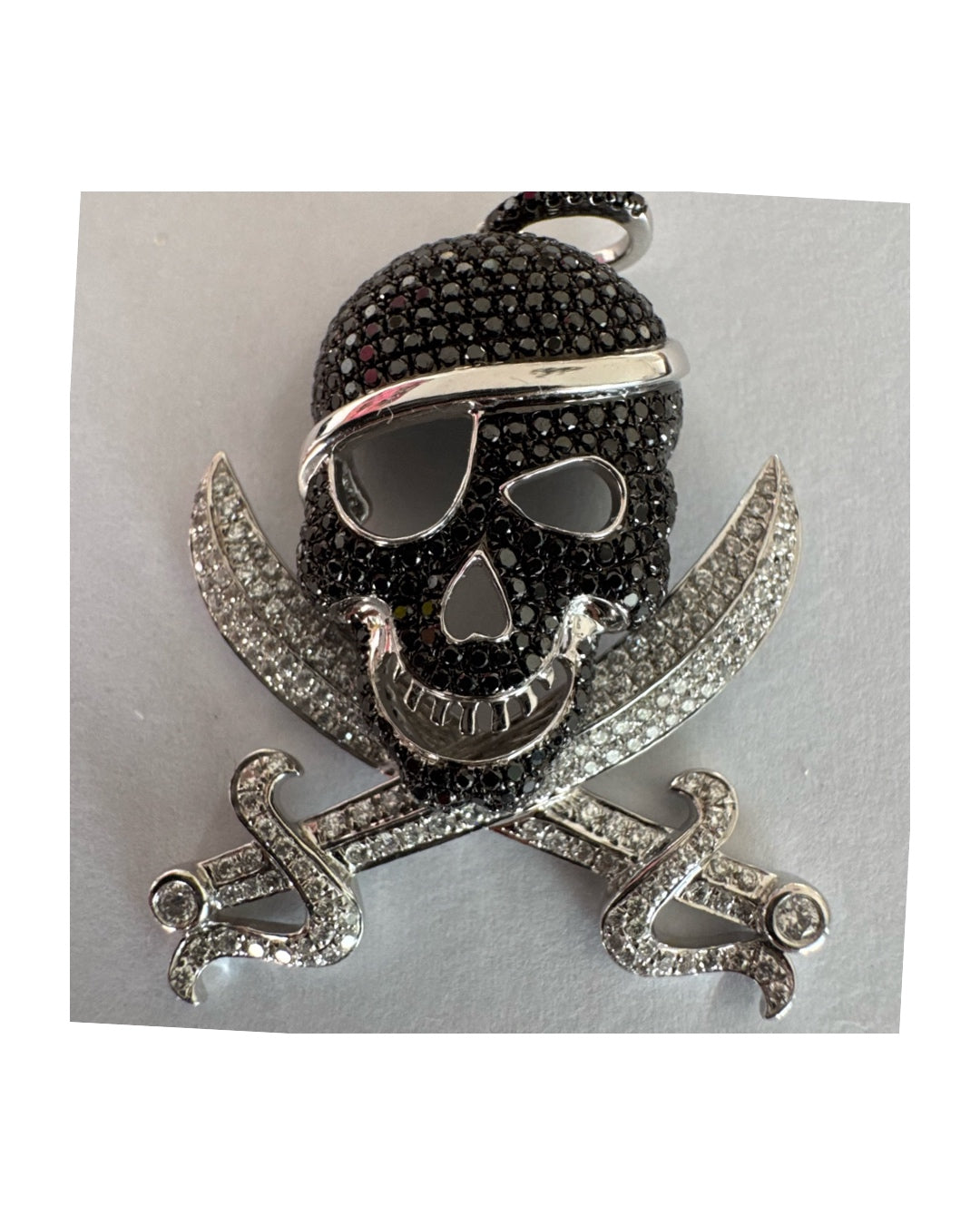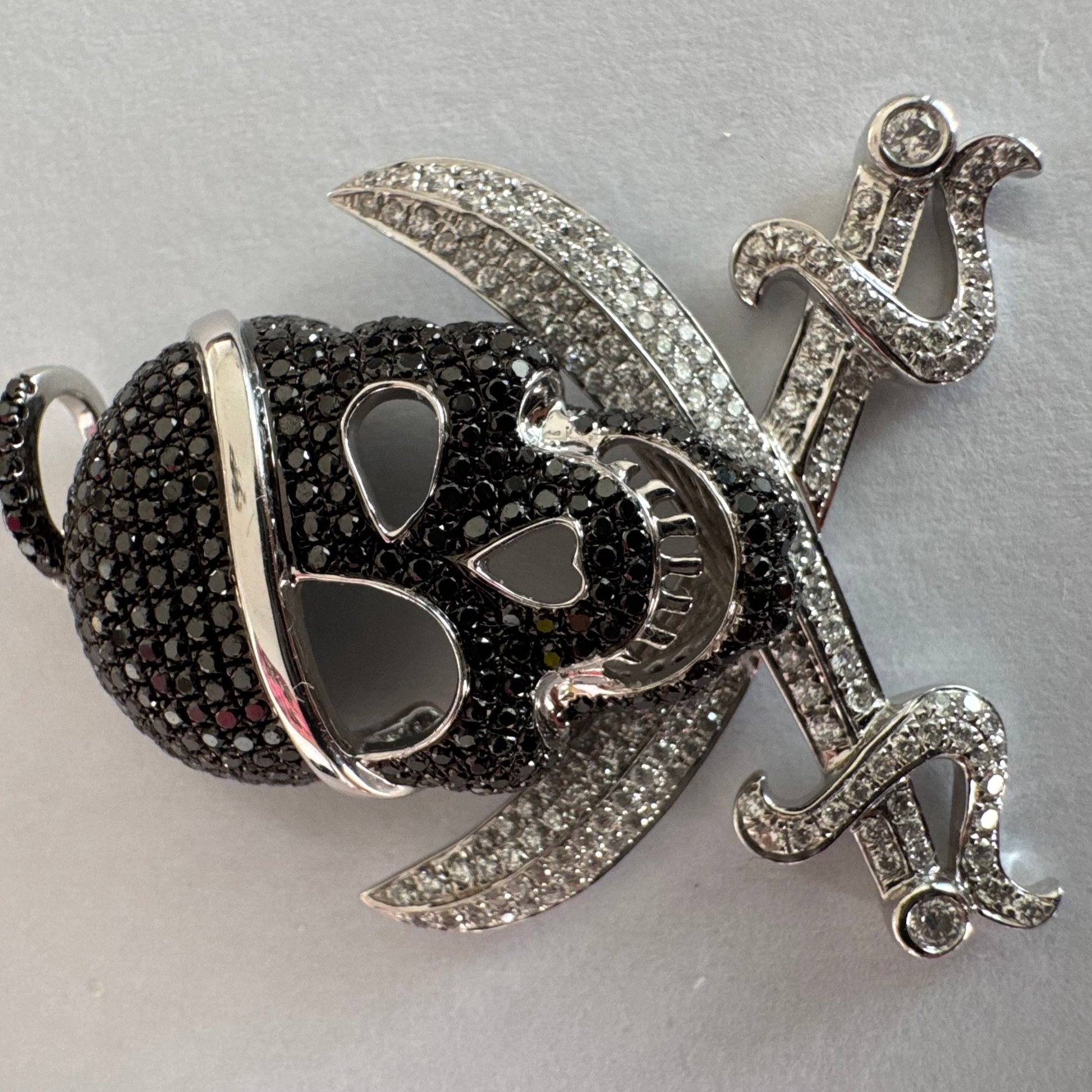 תליון זהב 14 קראט בצורת גולגולת/פיראט משובץ יהלומים לבנים ויהלומים שחורים בשיבוץ פאבה צפוף.