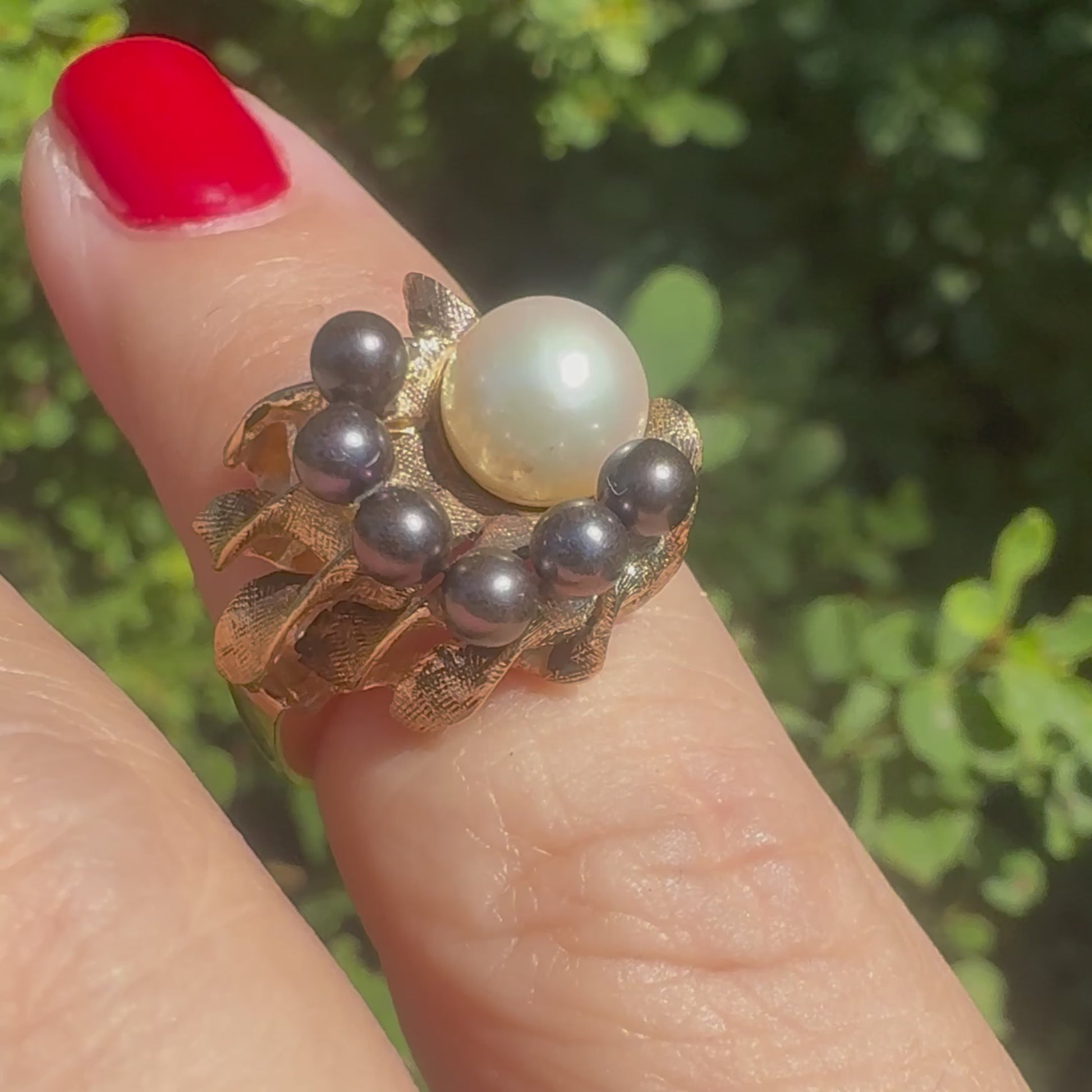 טבעת זהב צהוב 14 קראט, ייחודית ומרשימה במרקם עשיר, משובצת פנינה לבנה זוהרת במרכז המוקפת במעגל עדין של פנינים שחורות.