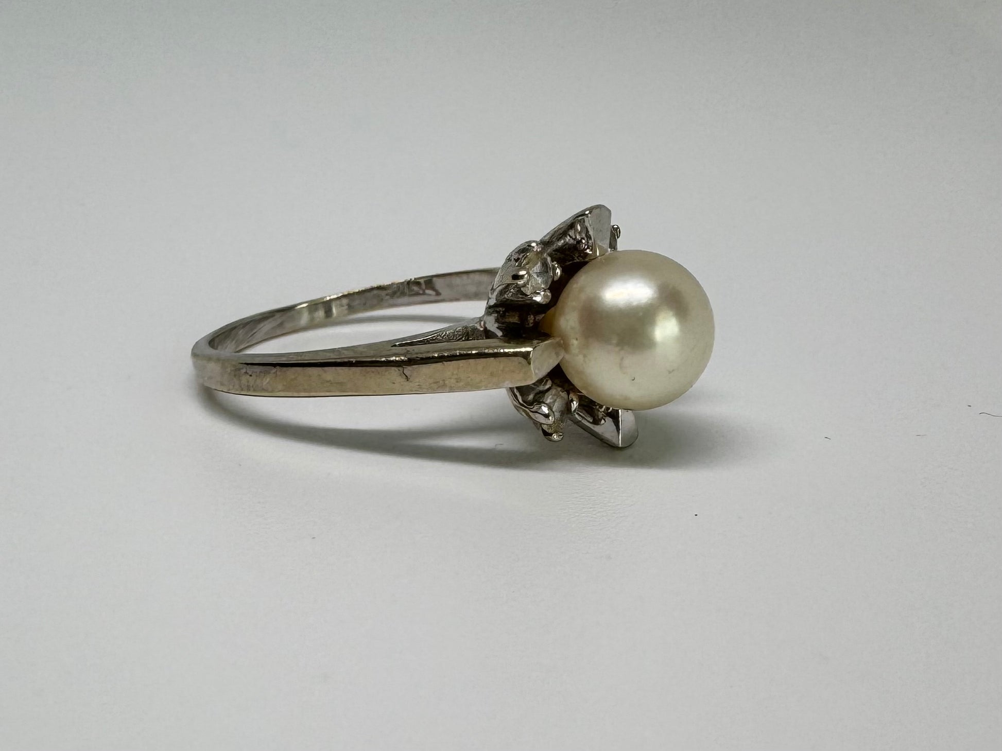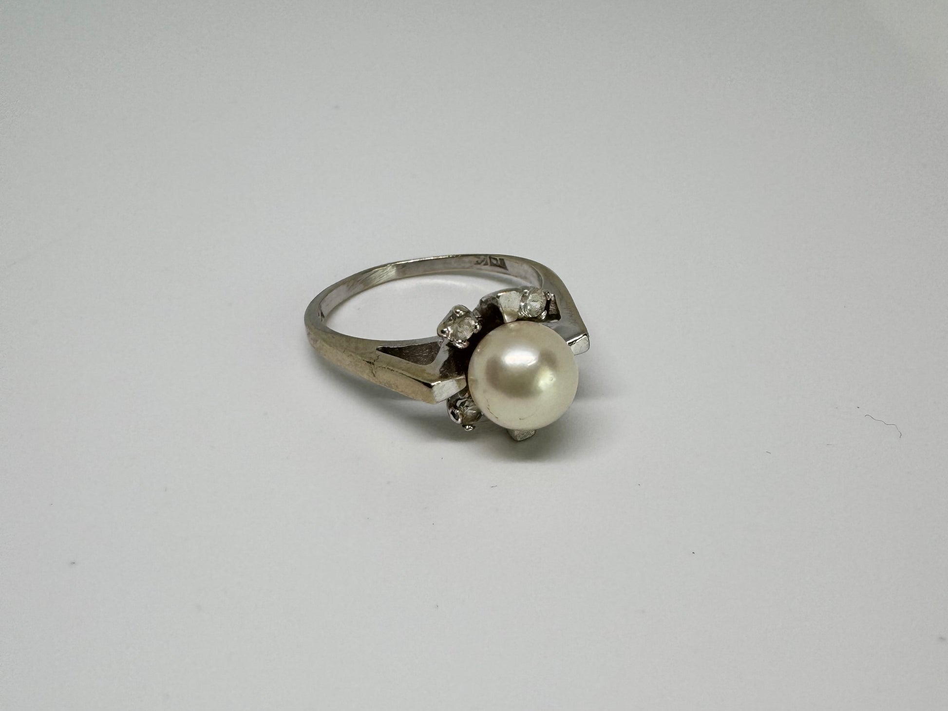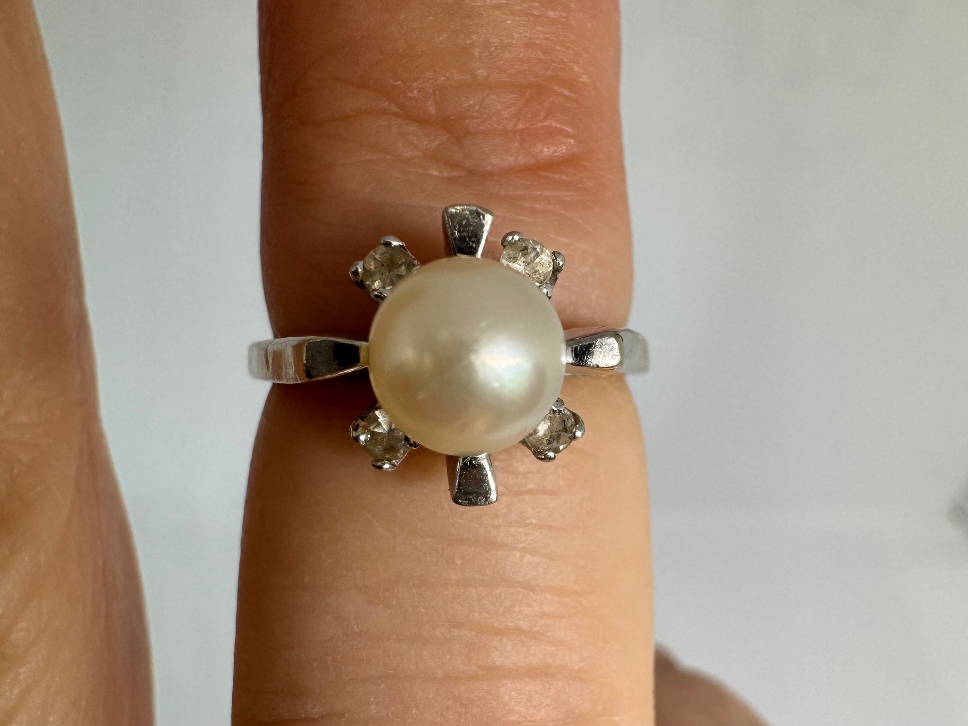 טבעת זהב לבן 10 קראט משובצת פנינה עגולה ויהלומים