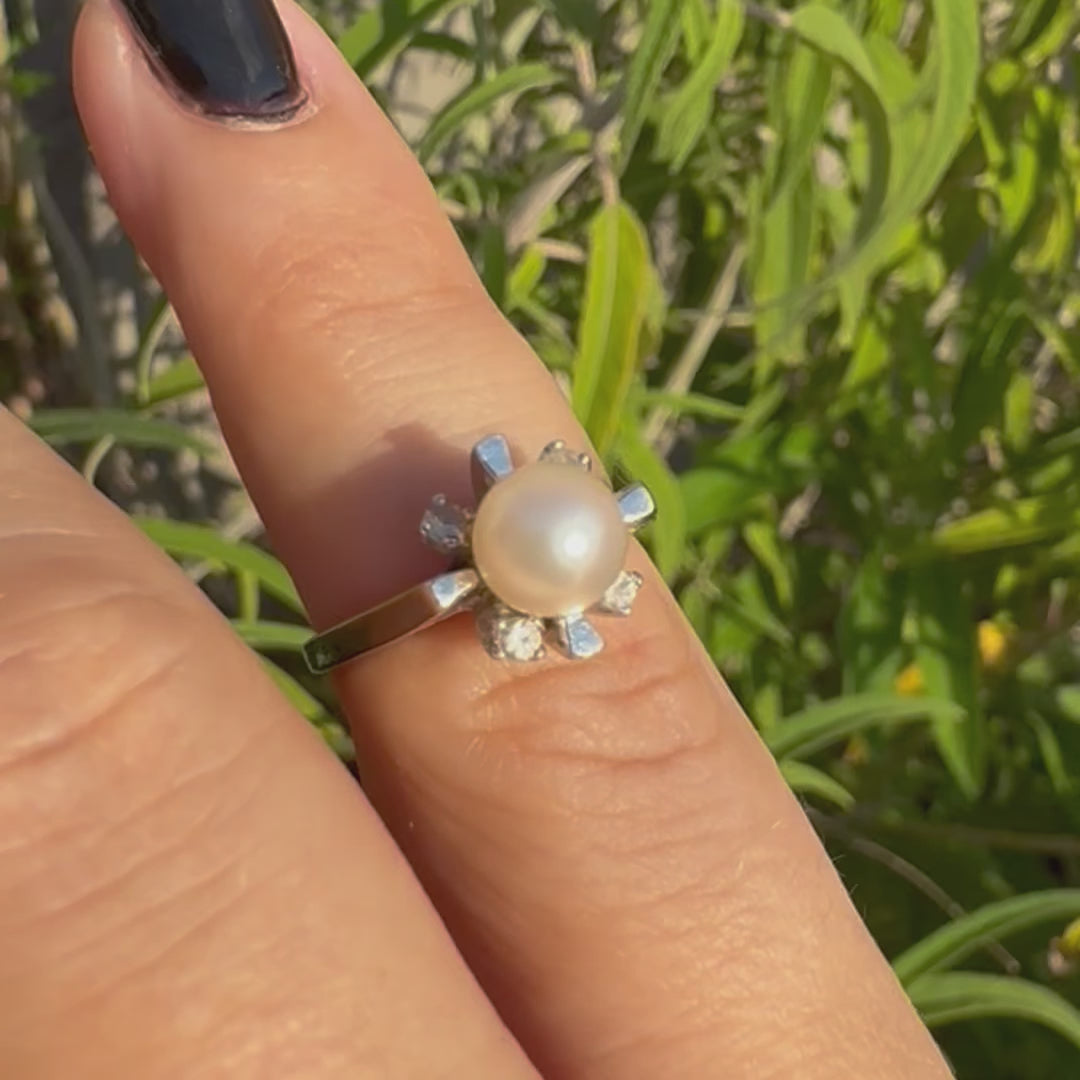 טבעת זהב לבן 10 קראט משובצת פנינים ויהלומים