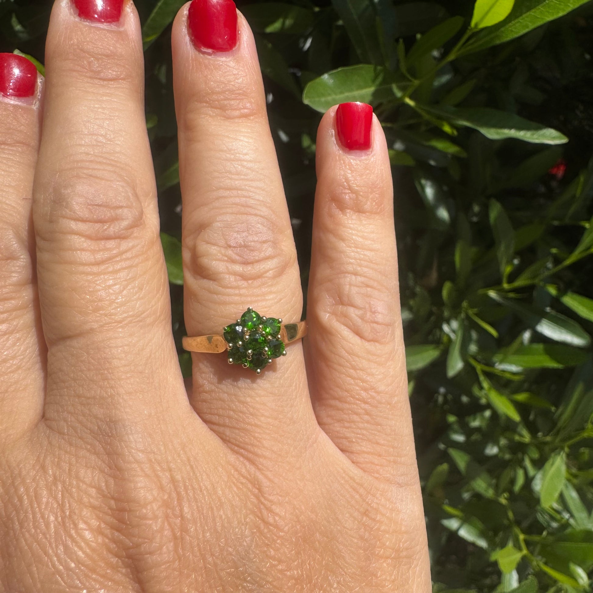טבעת זהב צהוב 10 קראט משובצת באבני חן ירוקות נוצצות מסודרות בצורת פרח עדין.