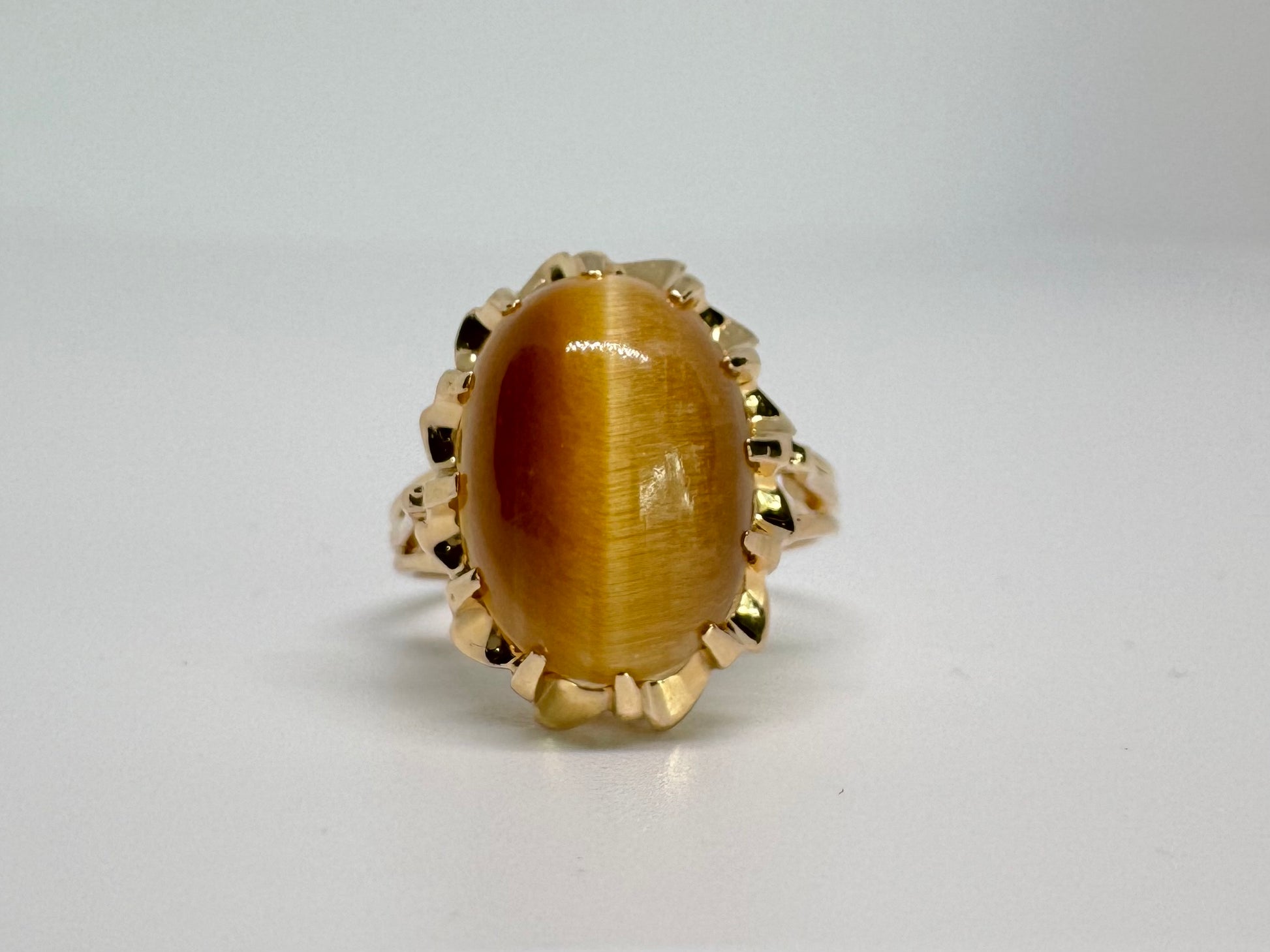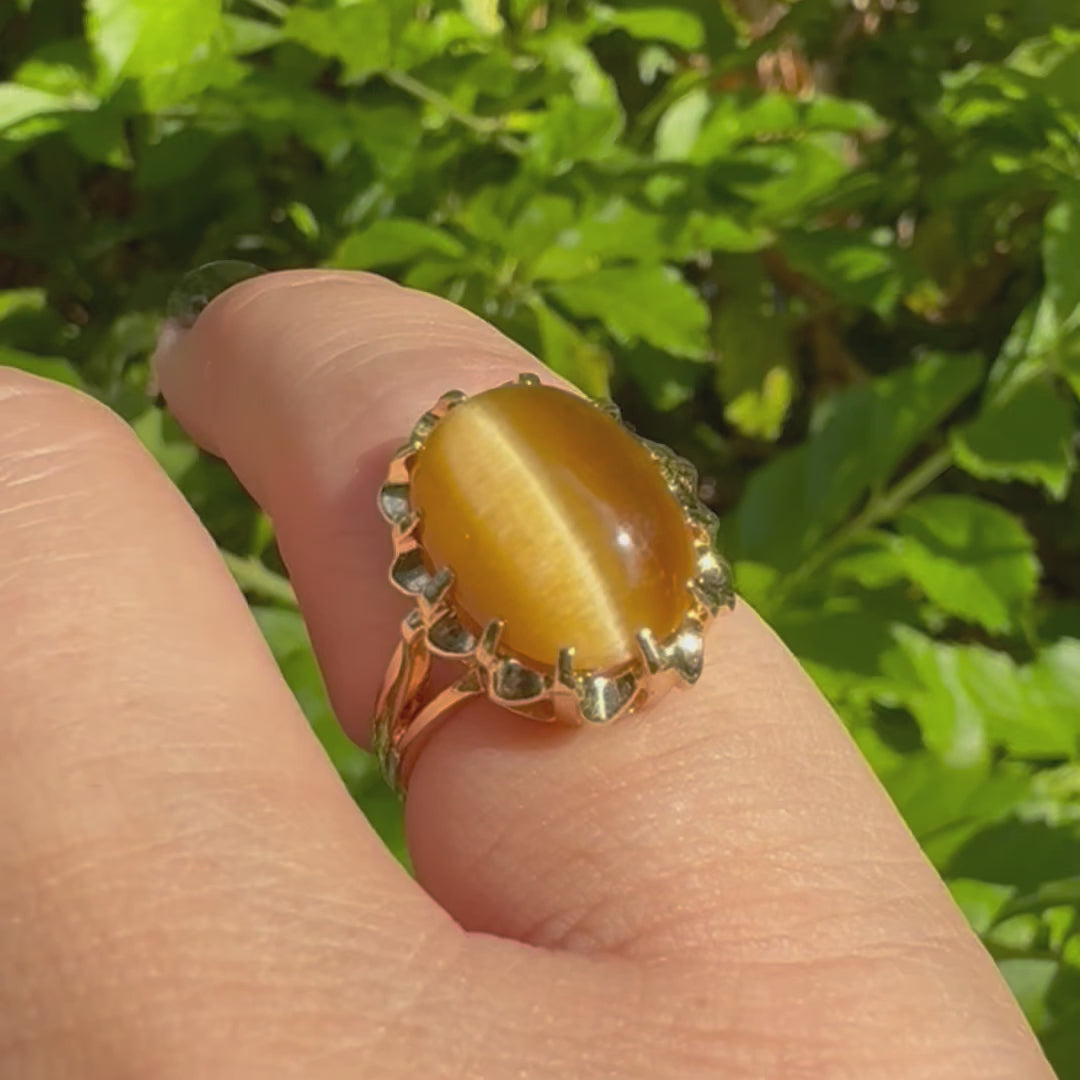 14K yellow gold ring set with a yellow Tiger’s Eye cabochon