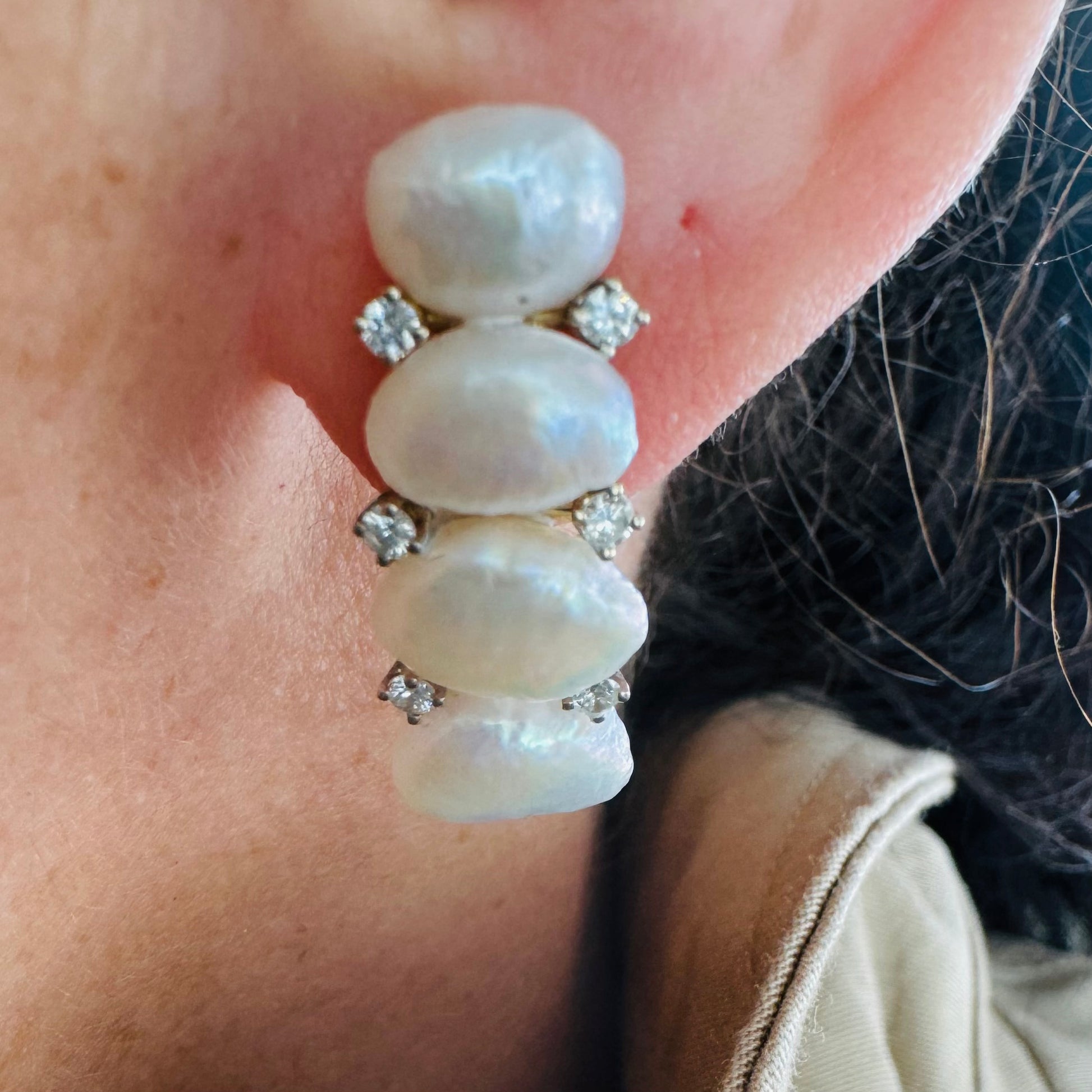 עגילי זהב לבן 14 קראט קליפס משובצים פנינים ויהלומים