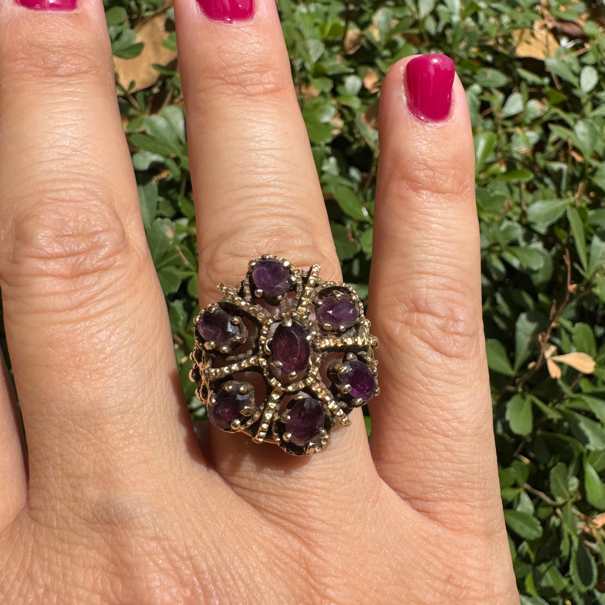 14K gold cocktail ring set with a stunning cluster of deep purple Garnet stones in marquise cuts.