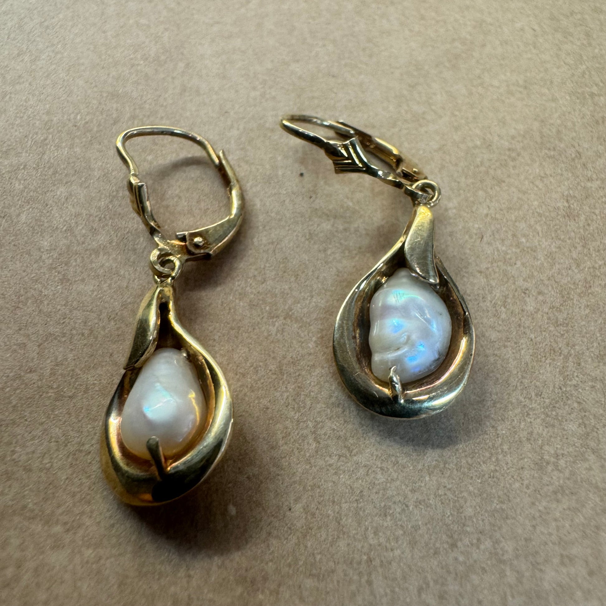 14K gold drop earrings featuring baroque Pearls set in fluid, organic shape