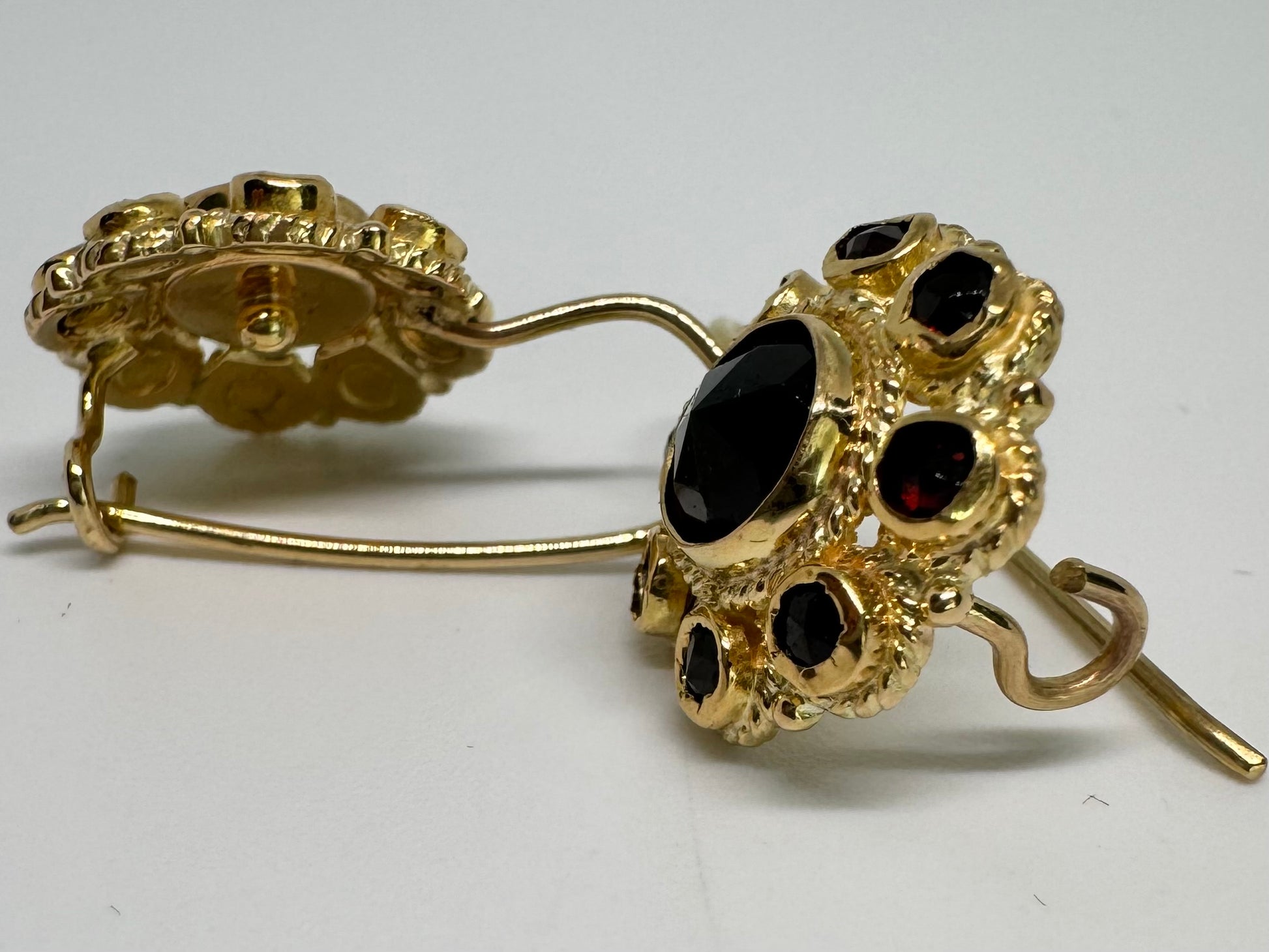 14K yellow gold drop earrings set with deep red Garnets arranged in a bold circular design