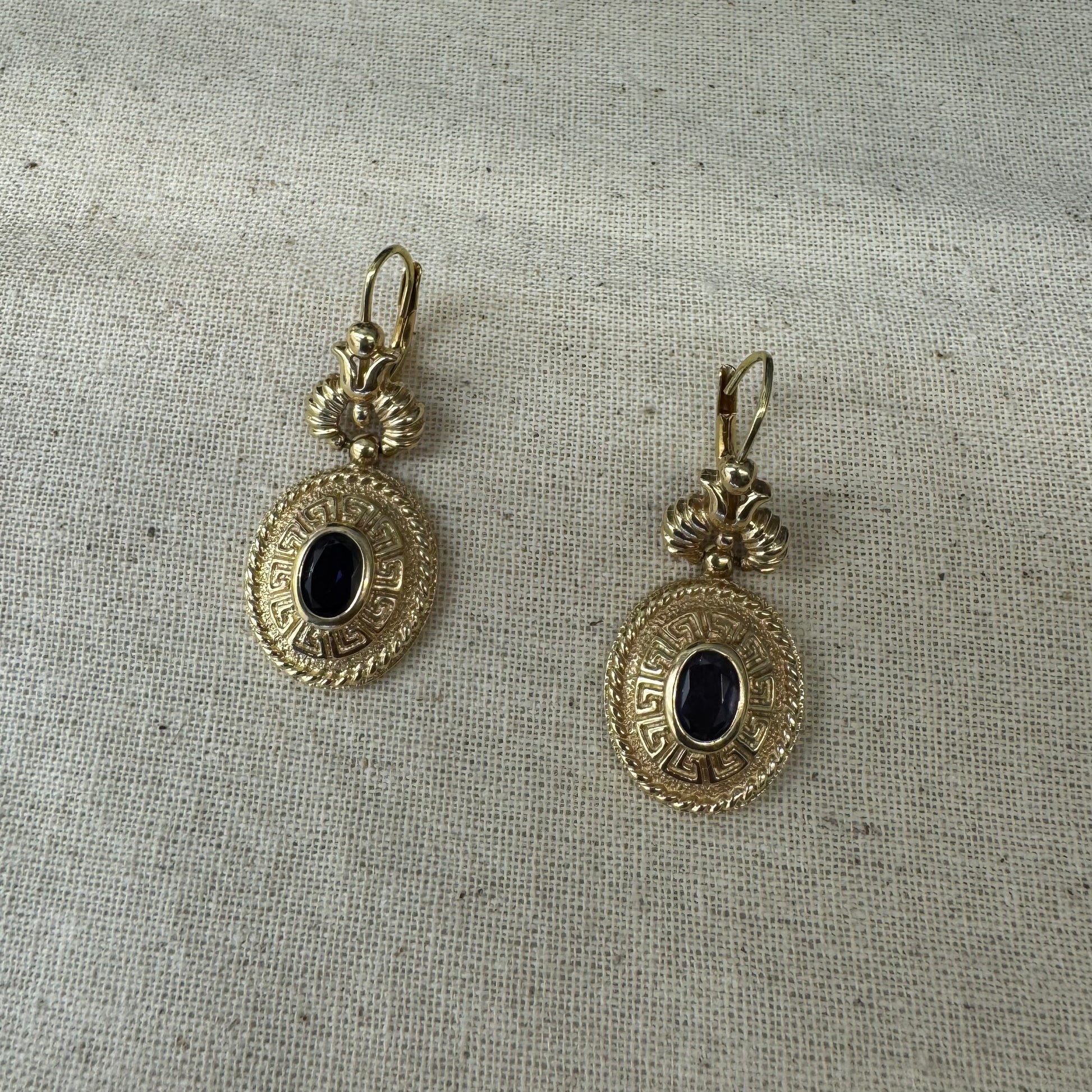 14K gold drop earrings set with Tanzanite in ornate medallion