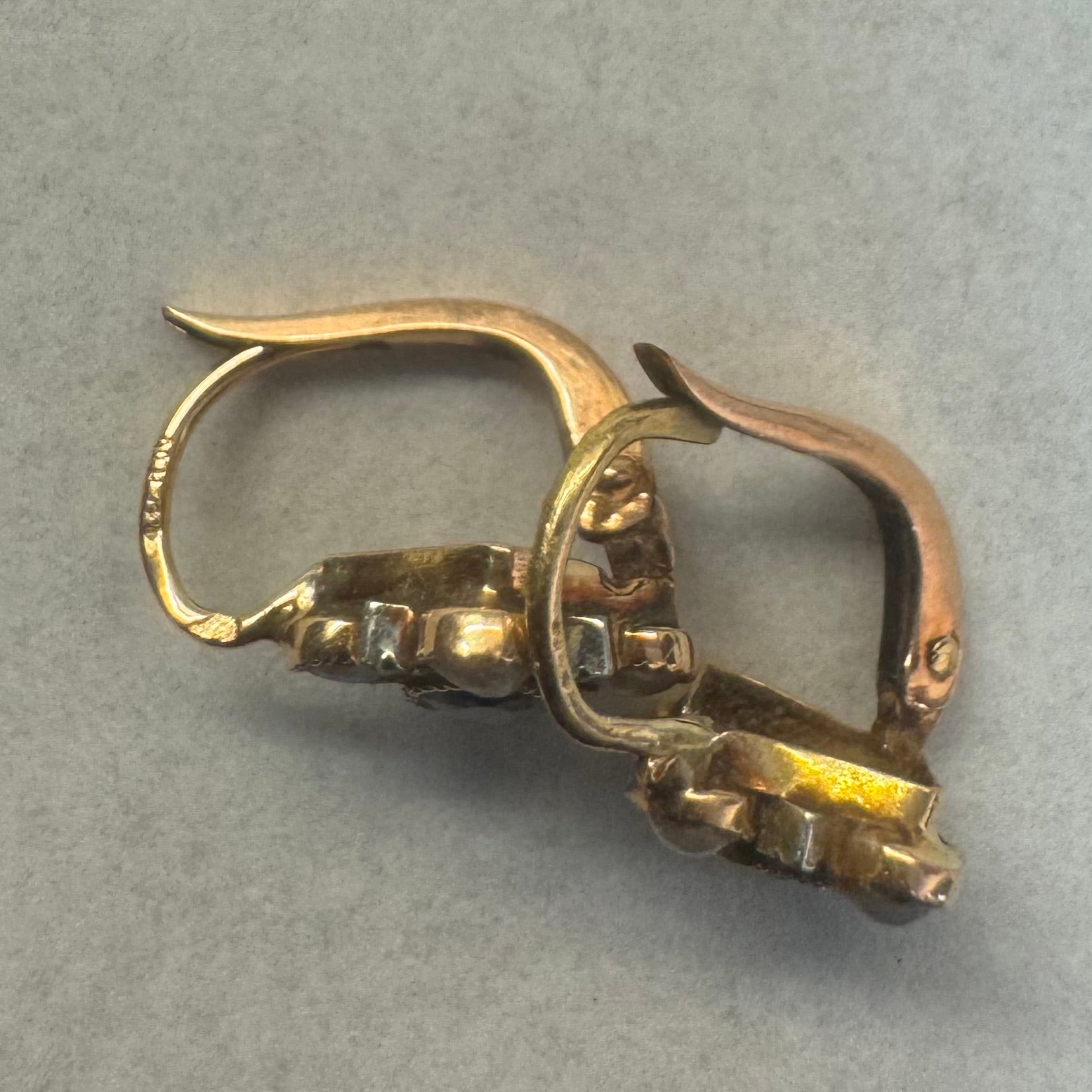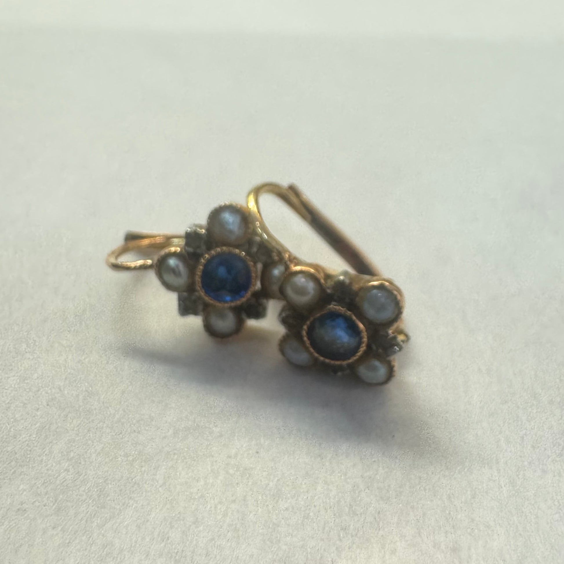 עגילי זהב 14 קראט משובצים אבן ספיר במרכז וסביבה משובצות פנינים קטנות בעיצוב פרחוני
