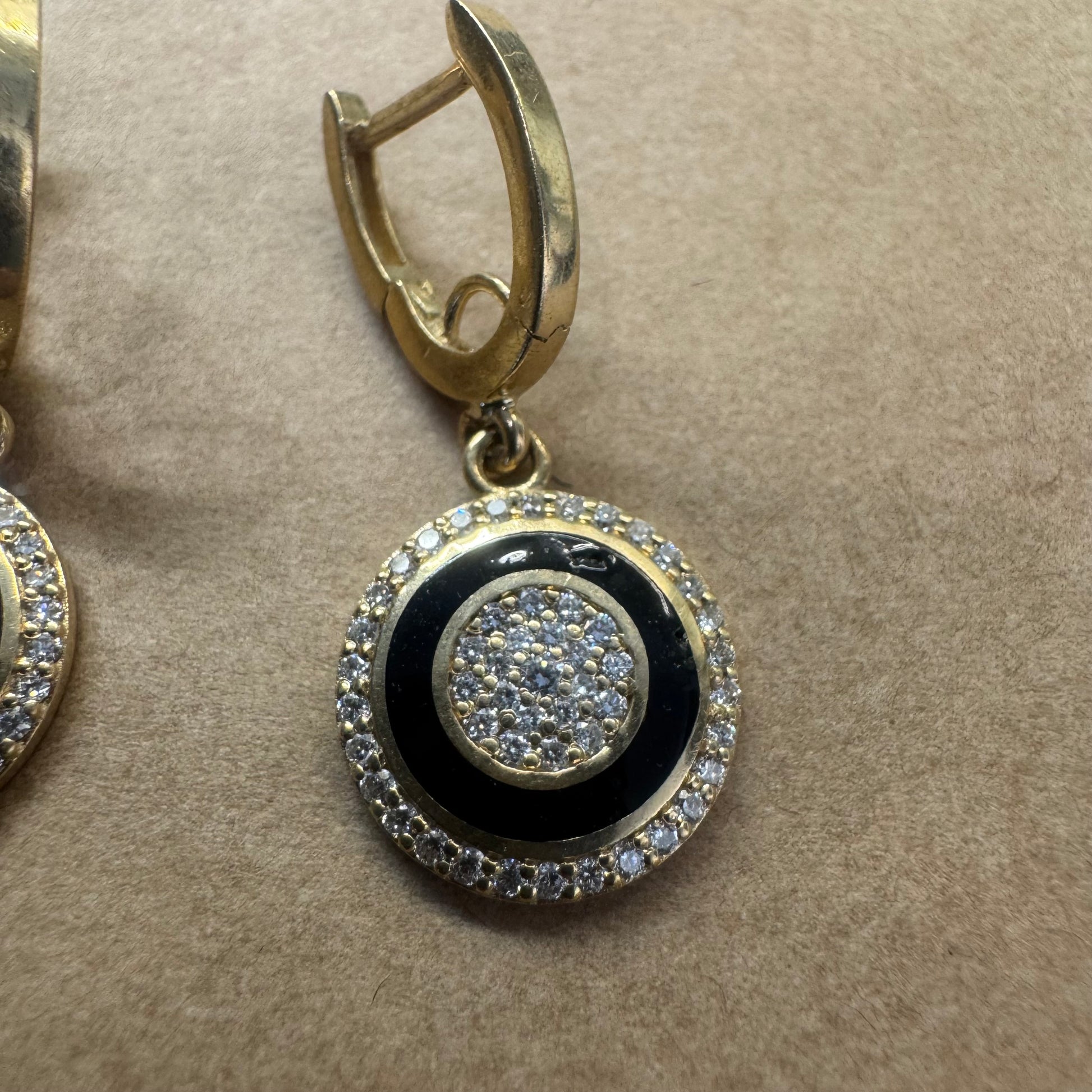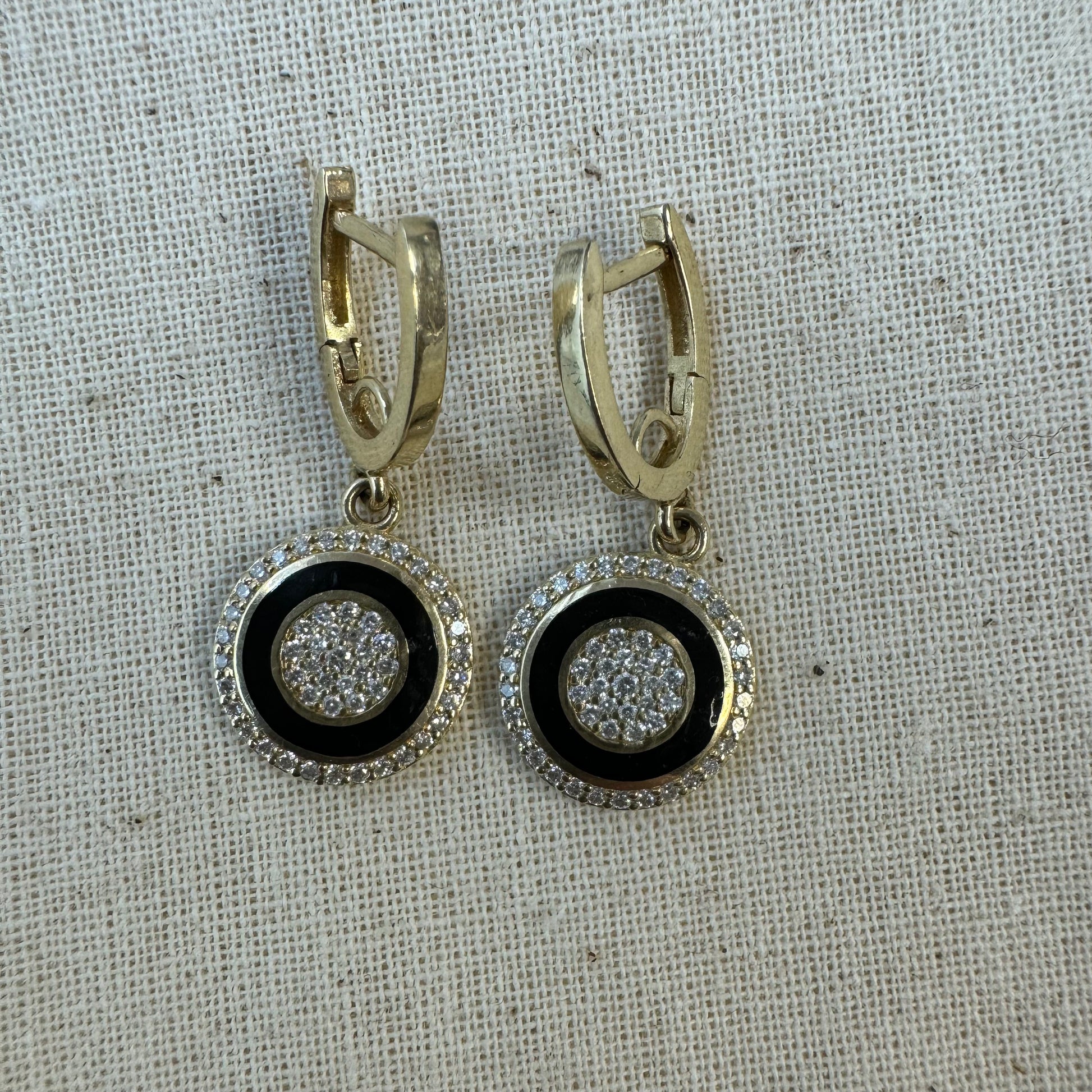 14K yellow gold drop earring with a round black enamel centerpiece, accented by a circle of sparkling pavé Diamonds in the center and a border of pavé Diamonds around the edge.