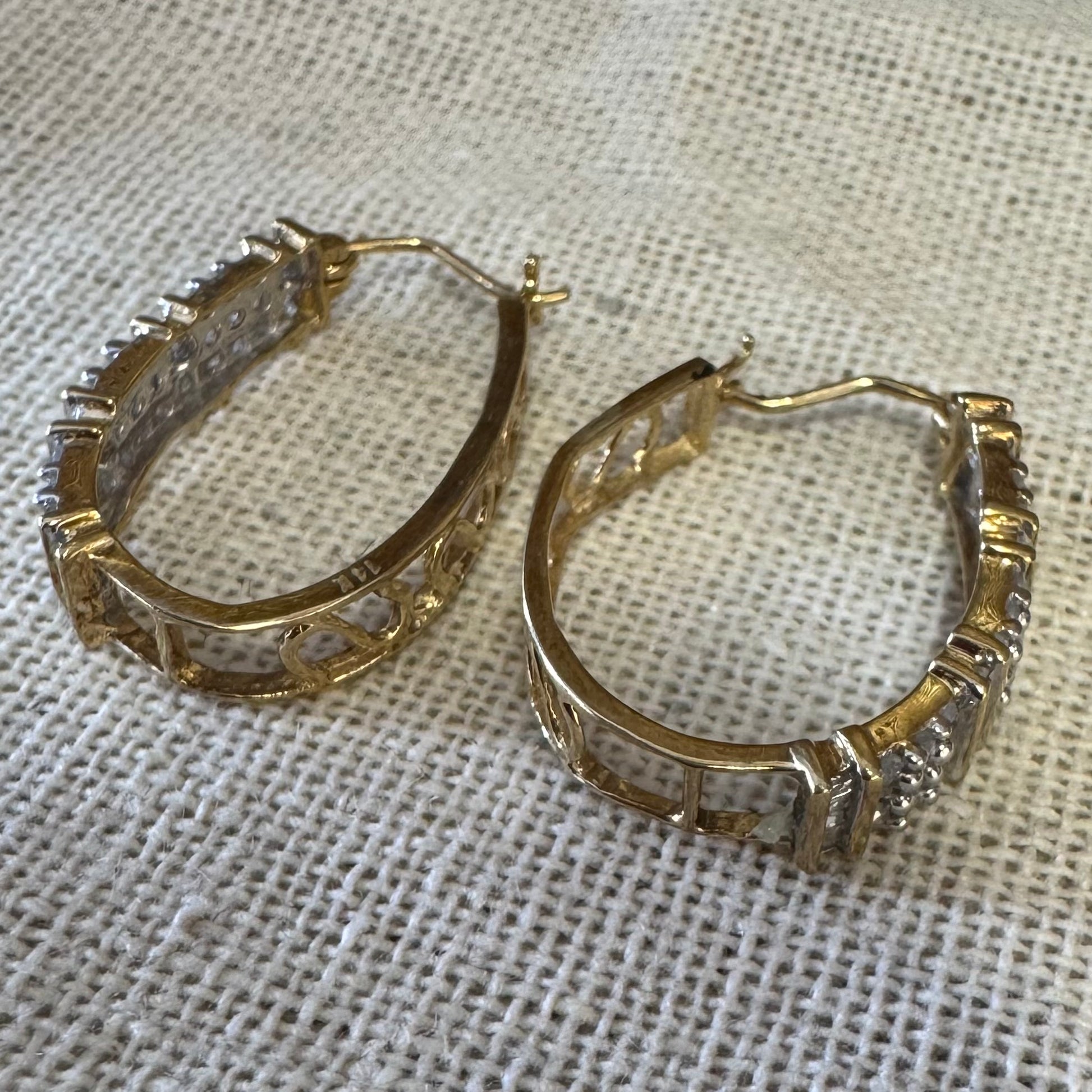 עגילי זהב צהוב 14 קראט, חישוקים גדולים, משובצים יהלומים