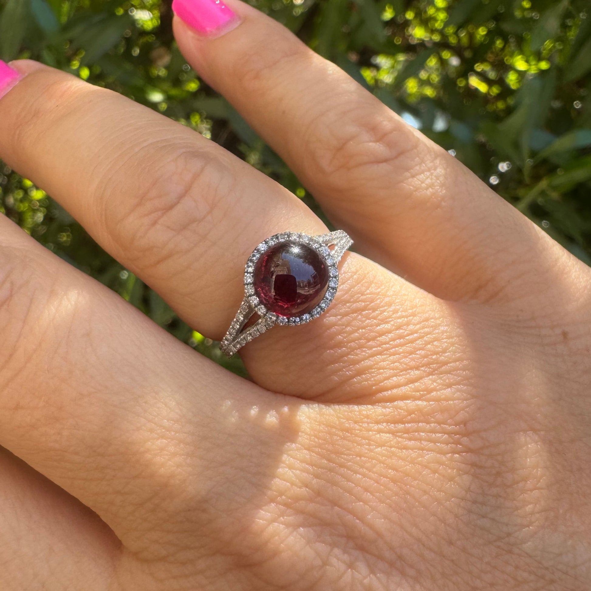 14K white gold ring set with a deep red cabochon Garnet, surrounded by a halo of sparkling Diamonds