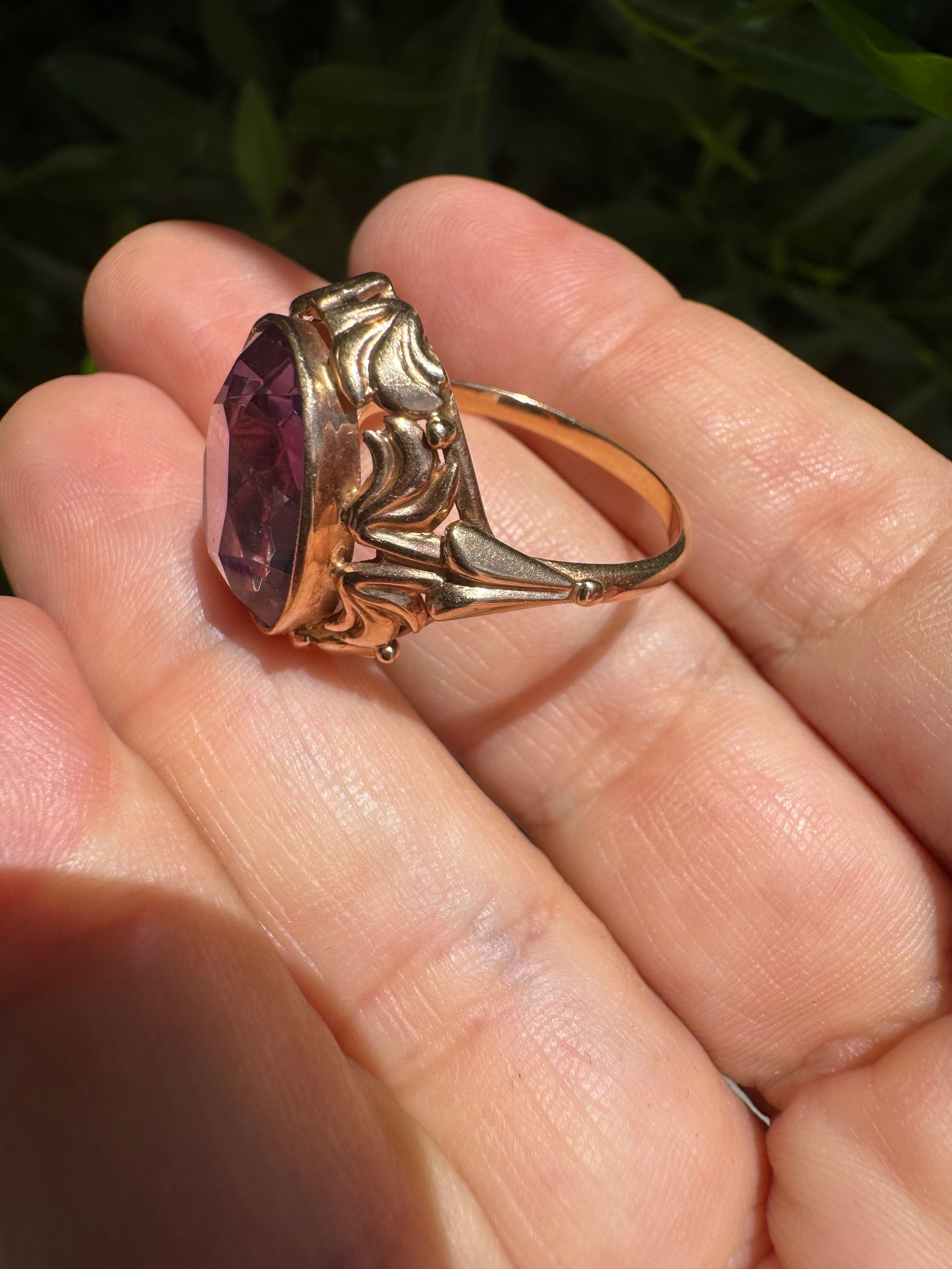 טבעת זהב אדום משובצת אמטיסט בגוון סגול עמוק .