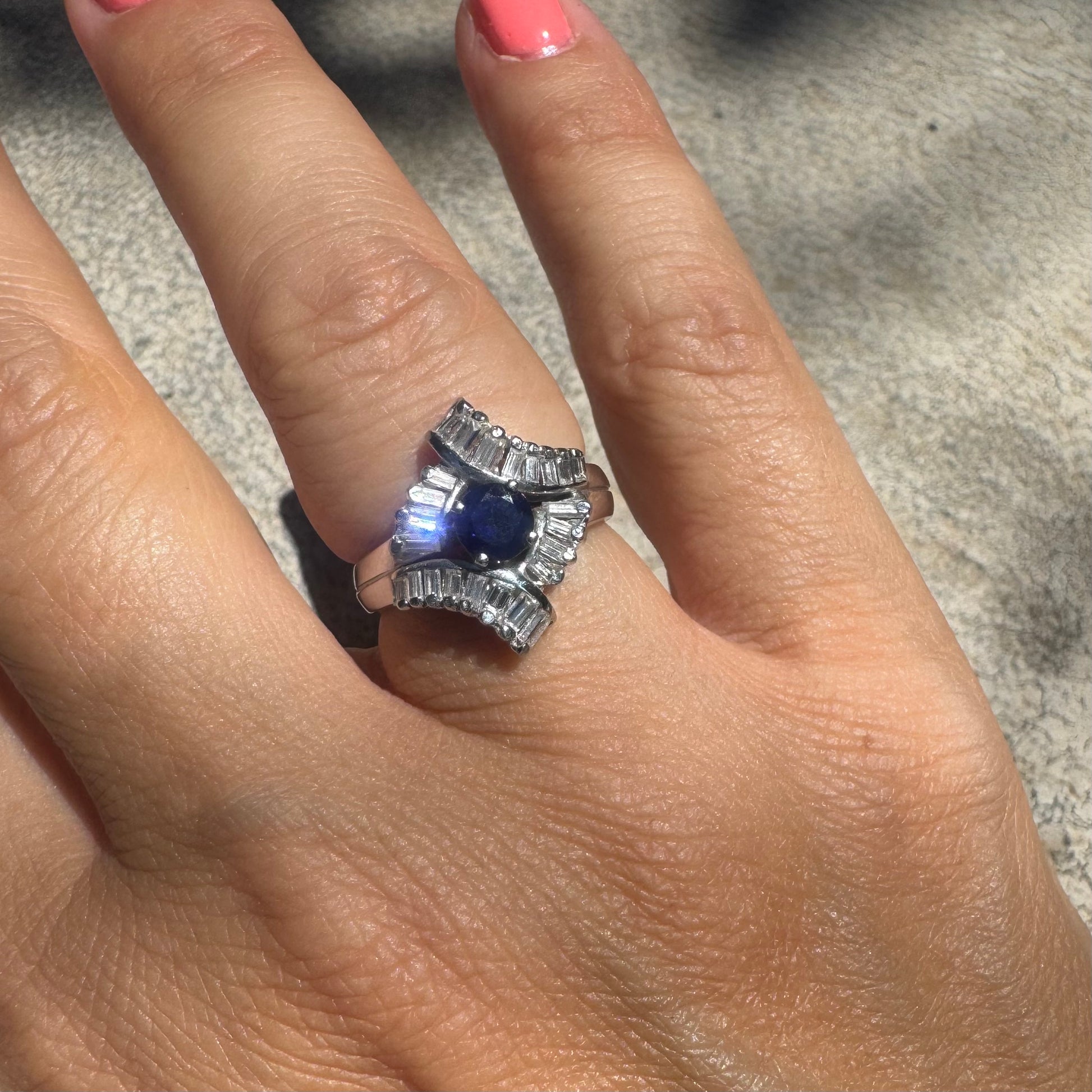 טבעת זהב לבן 14 קראט משובצת אבן ספיר בצבע כחול כהה בחיתוך מרקיזה ומסביב משובצים יהלומים