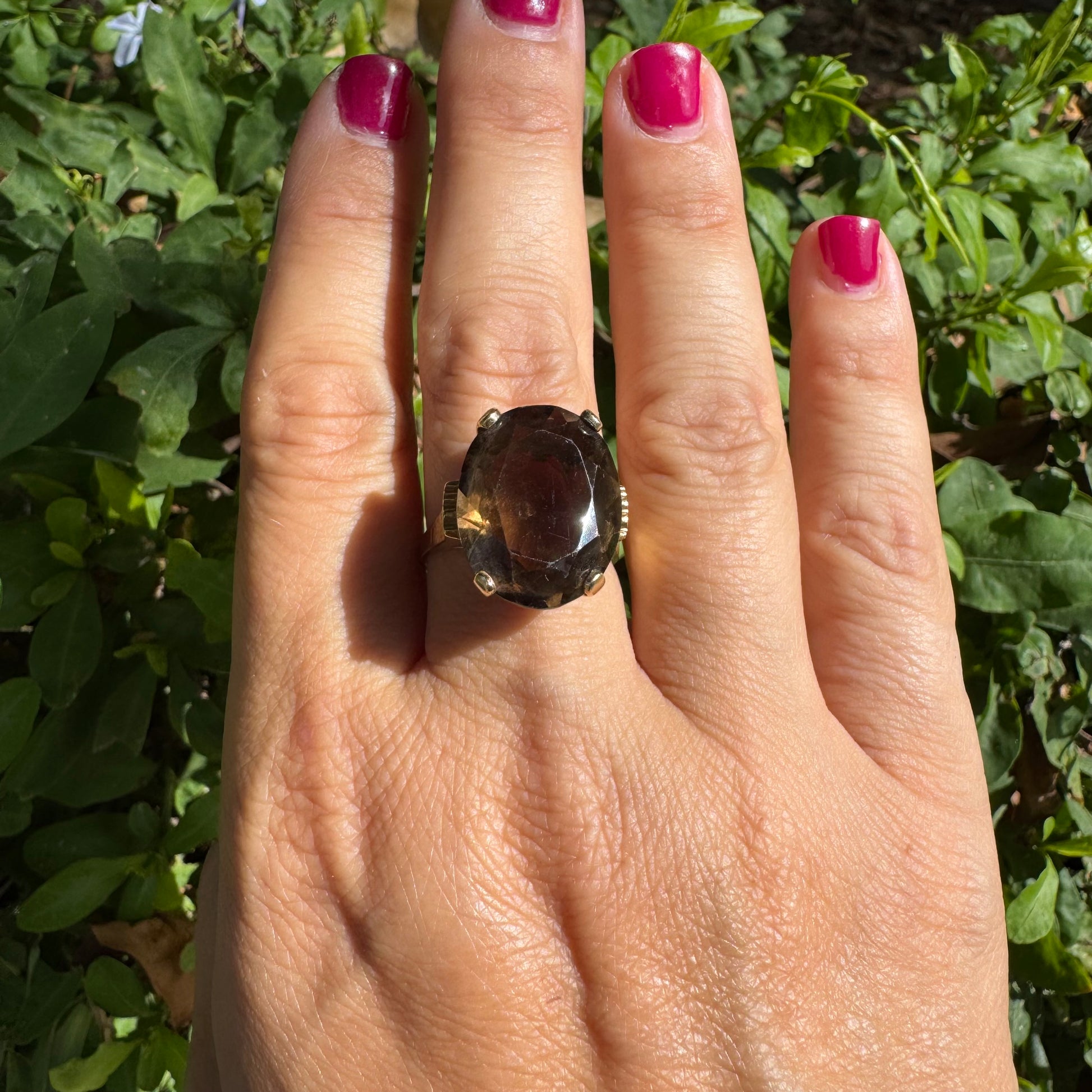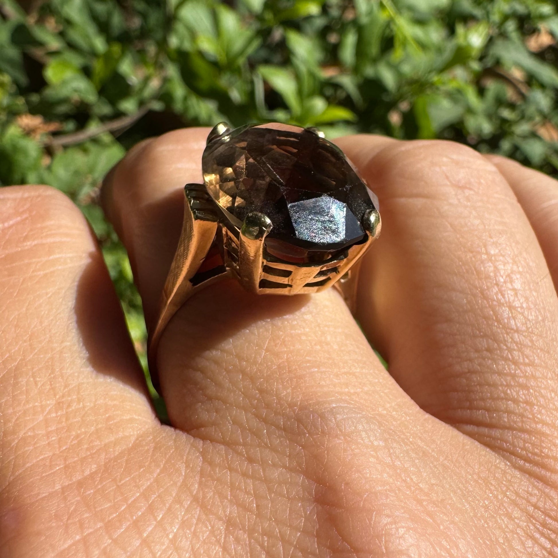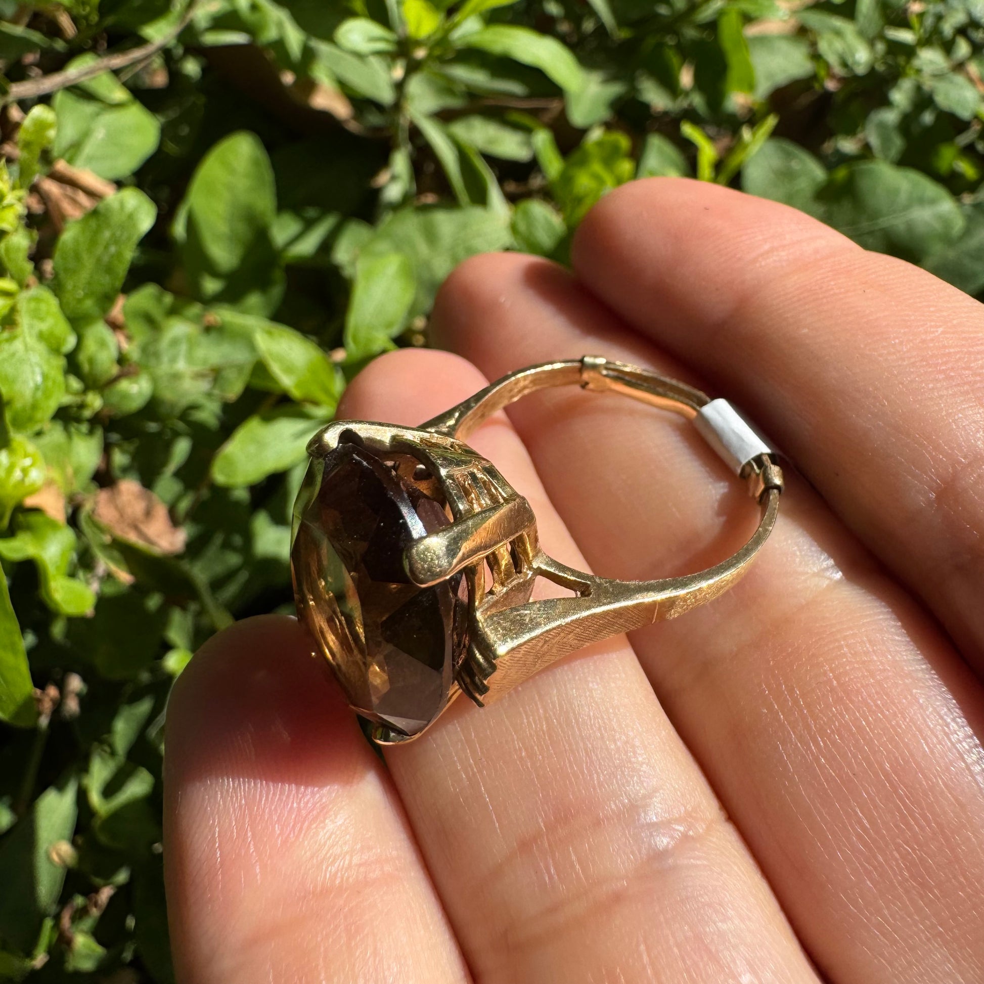 טבעת זהב צהוב 14 קראט משובצת אבן סמוקי קוורץ בגוון חום עמוק ומסתורי.
