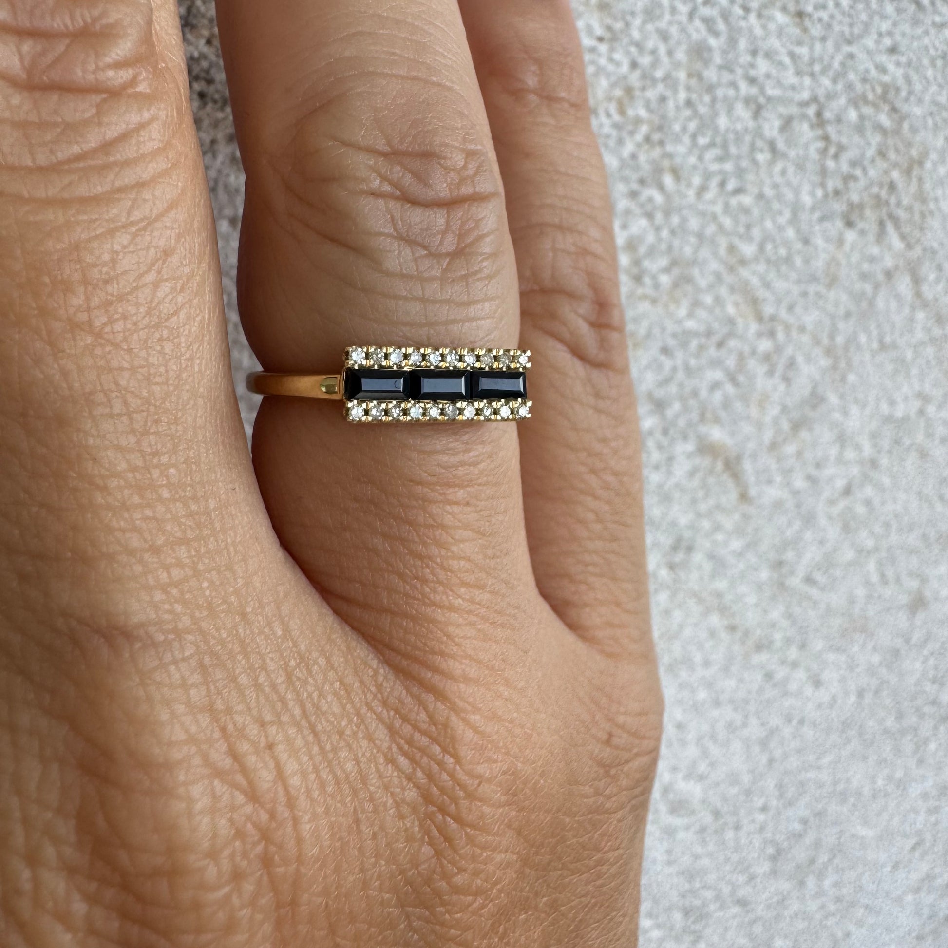 טבעת זהב צהוב 14 קראט משובצת אבני ספיר בצבע כחול כהה בחיתוך באגט, מוקפות יהלומים נוצצים – עיצוב גיאומטרי נועז שמשלב אלגנטיות מודרנית עם נגיעת וינטג׳