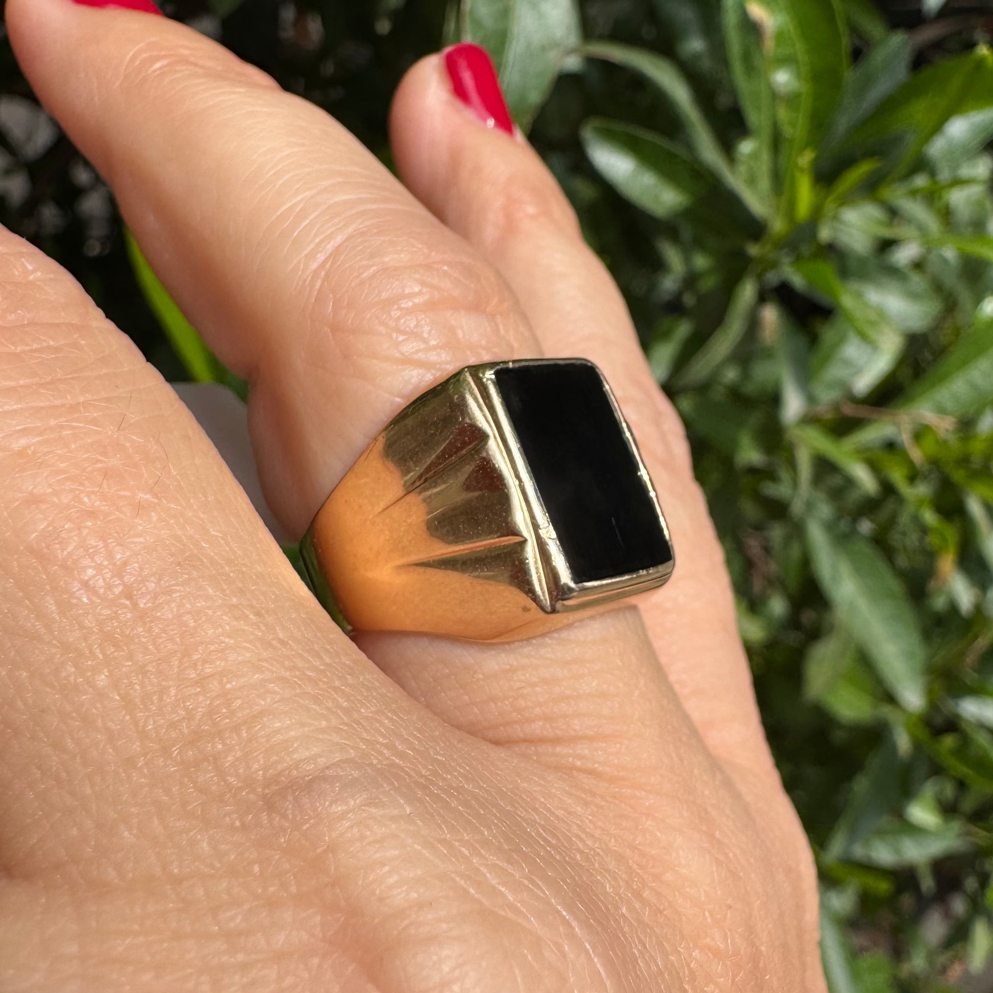 טבעת זהב צהוב 14 קראט משובצת אבן אוניקס שחורה מלבנית