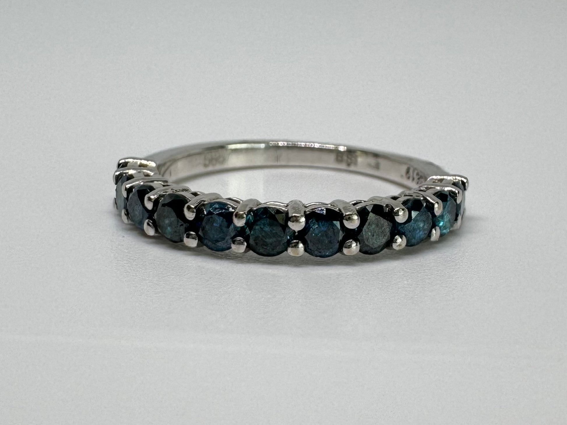 טבעת זהב לבן 14 קראט משובצת יהלומים בצבע כחול