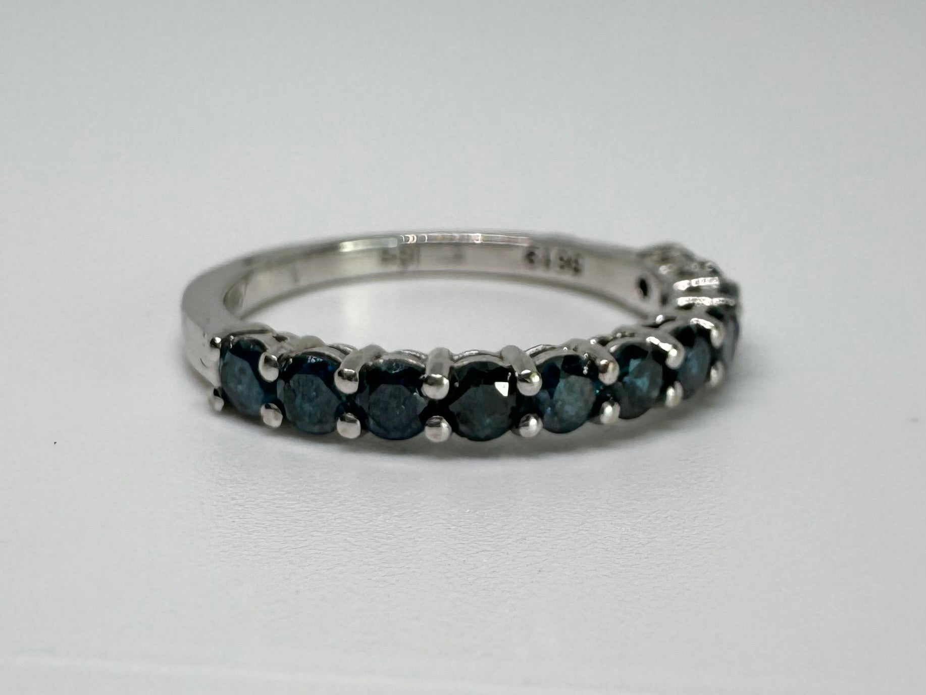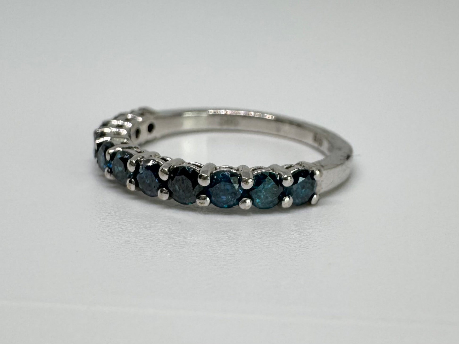 טבעת זהב לבן 14 קראט משובצת יהלומים כחולים