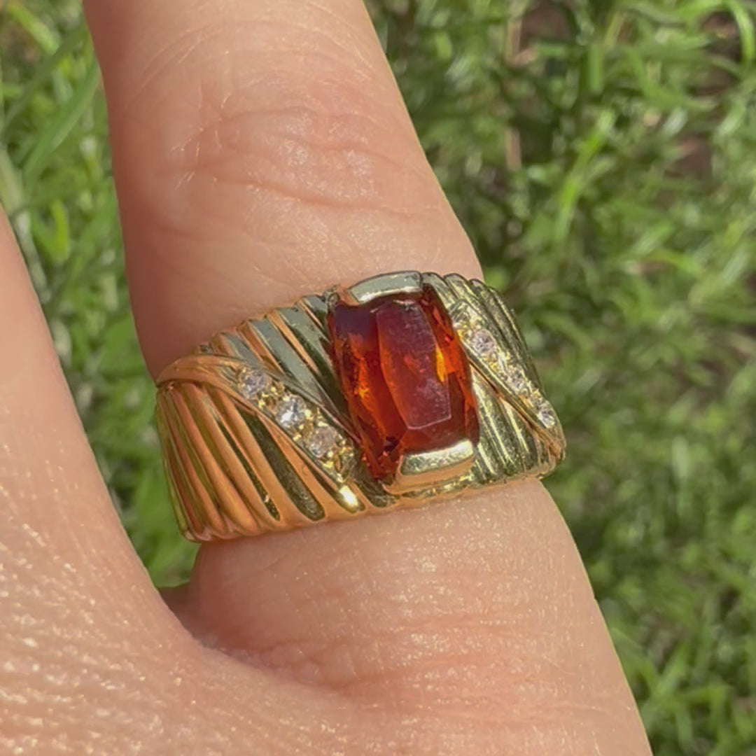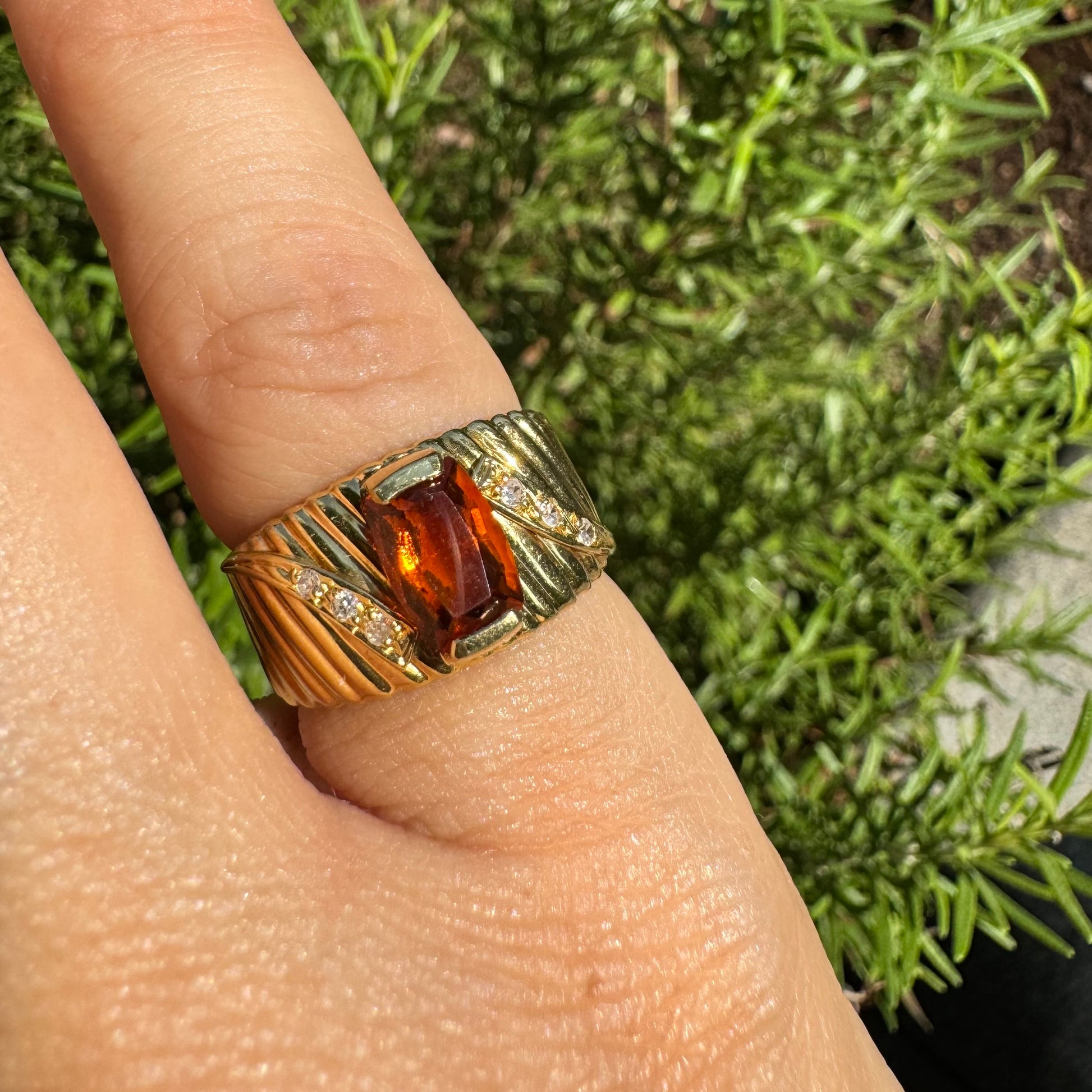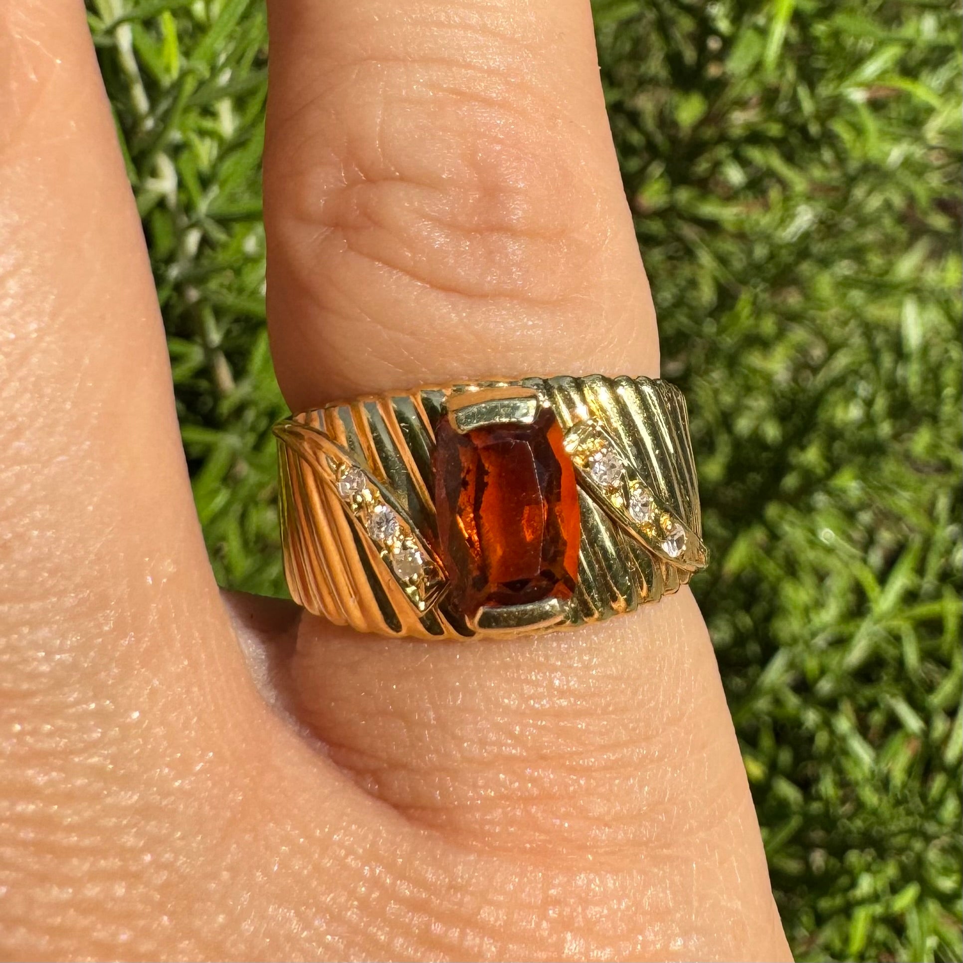 טבעת זהב צהוב 14 קראט, בעיצוב פיסולי עם טקסטורה גיאומטרית בולטת, משובצת אבן סיטרין בגוון כתום עמוק, ליטוש פנסיל ויהלומים משובצים משני צידי האבן המרכזית ומוסיפים לה ברק ועומק.