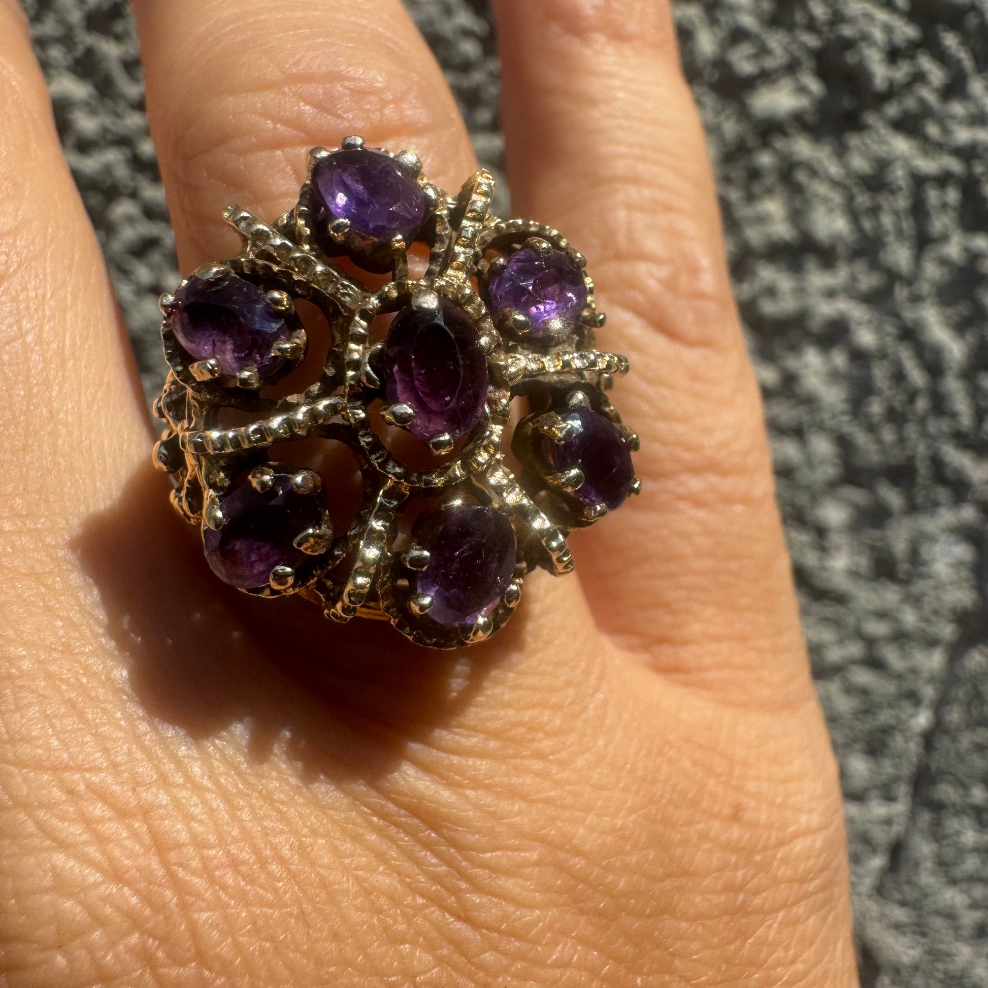 14K yellow gold ring set with deep purple amethysts in an ornate floral design.