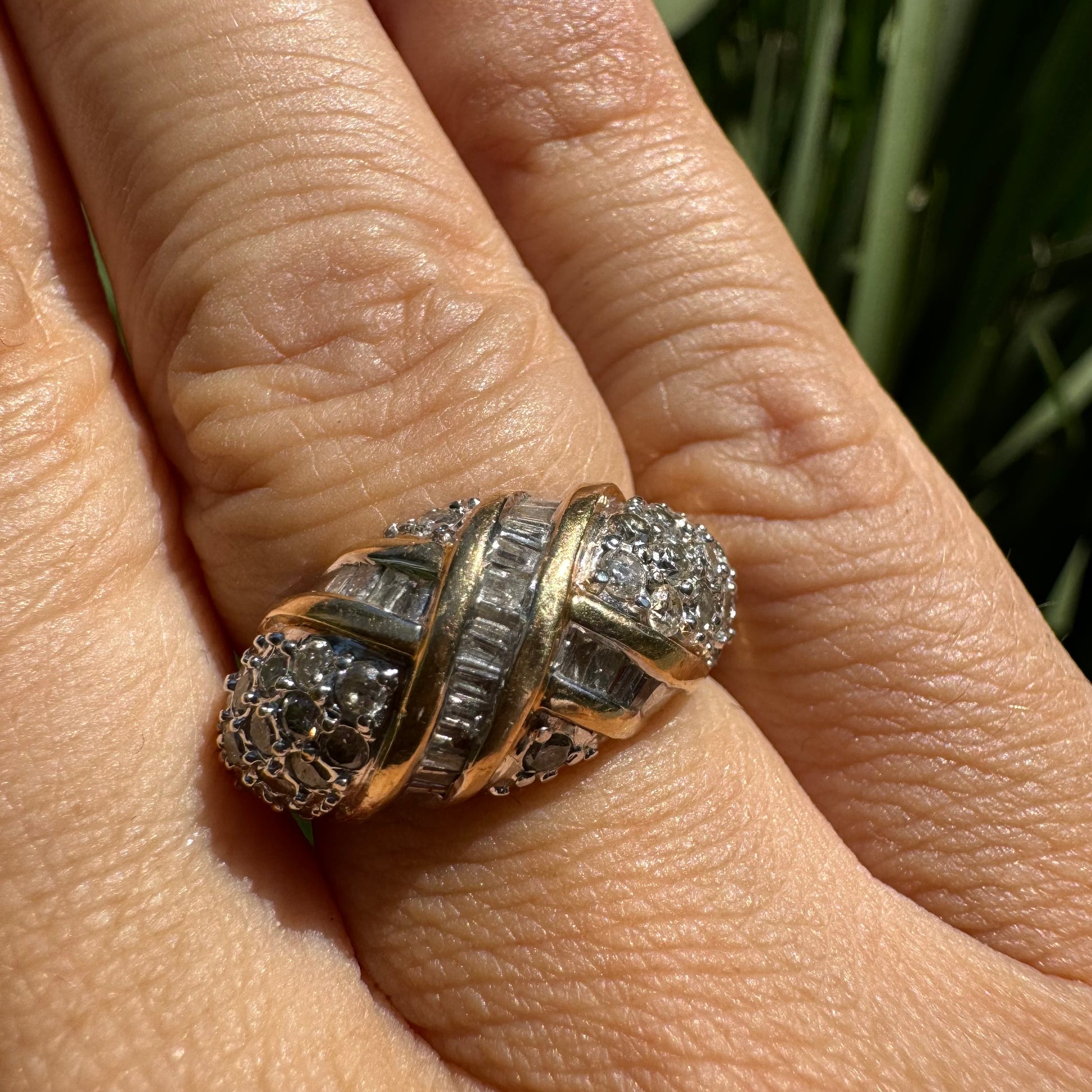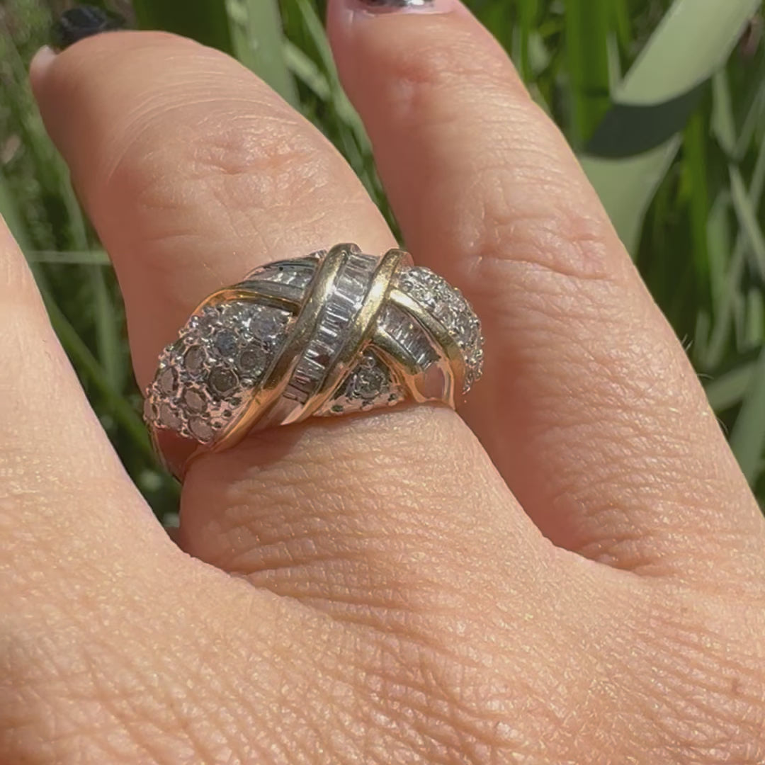 טבעת זהב צהוב וזהב לבן משובצת יהלומים בחיתוכים שונים (באגט ועגול)