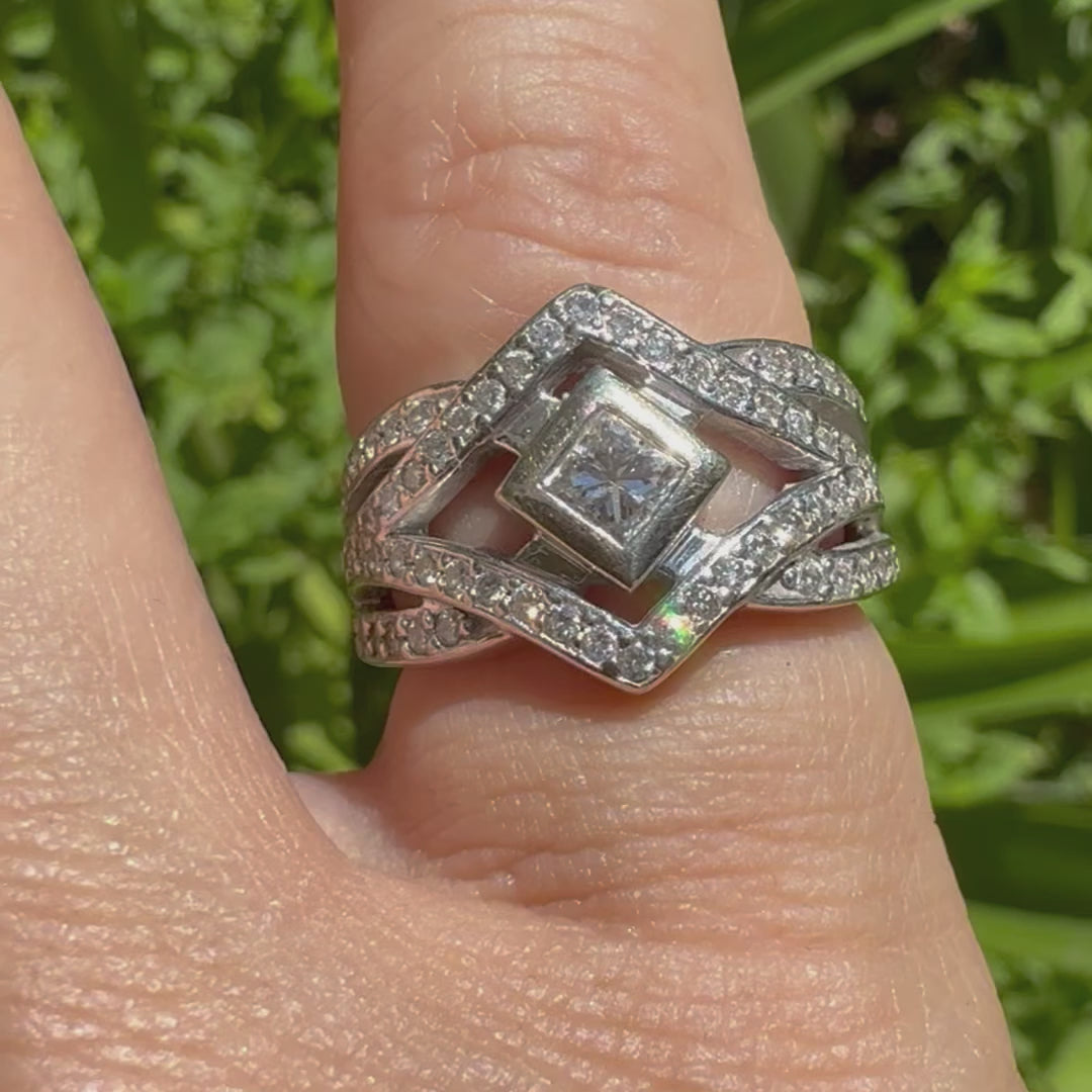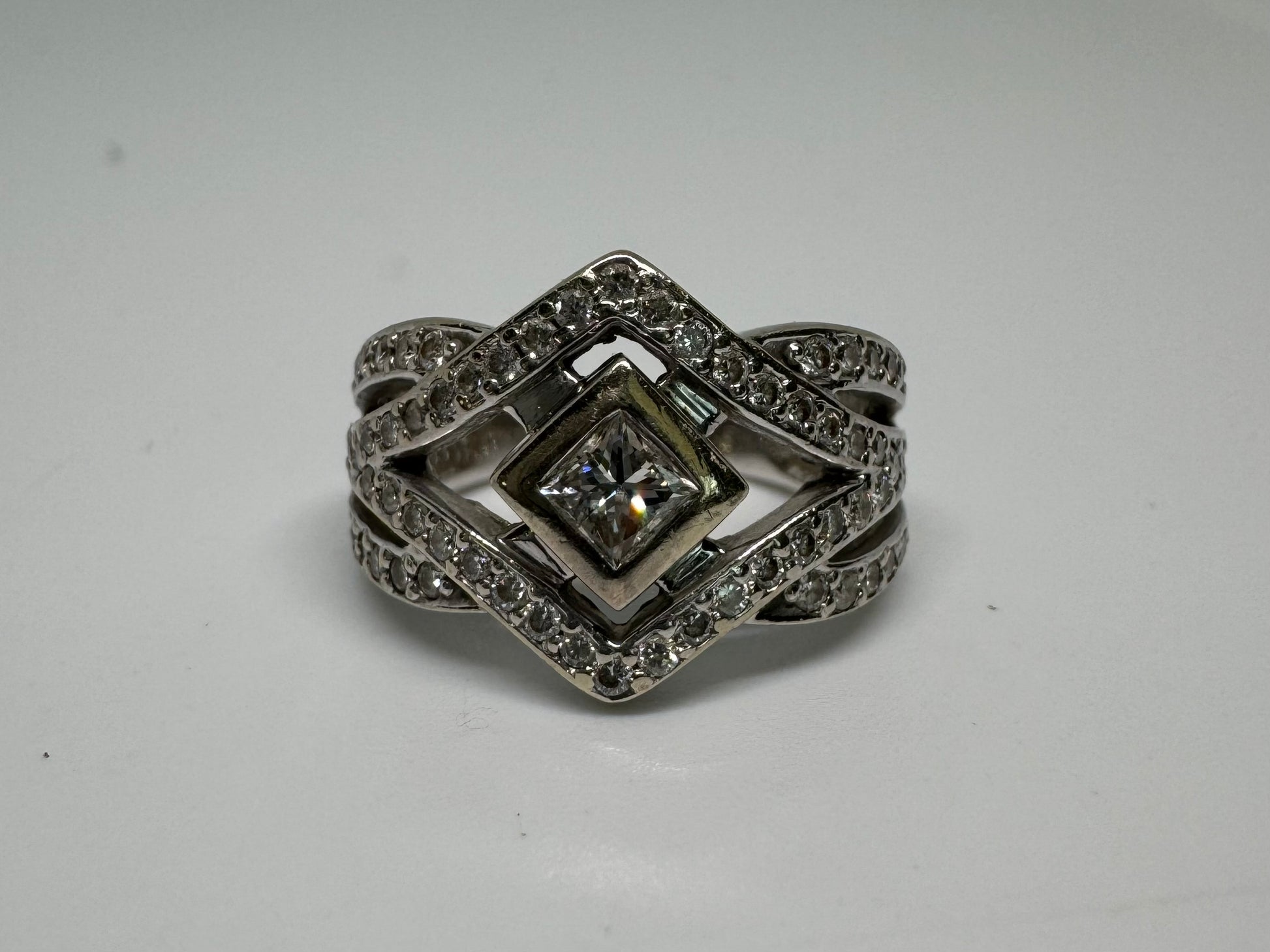טבעת זהב לבן 14 קראט משובצת יהלום מרכזי בחיתוך מרובע וסביבו משובצים יהלומים