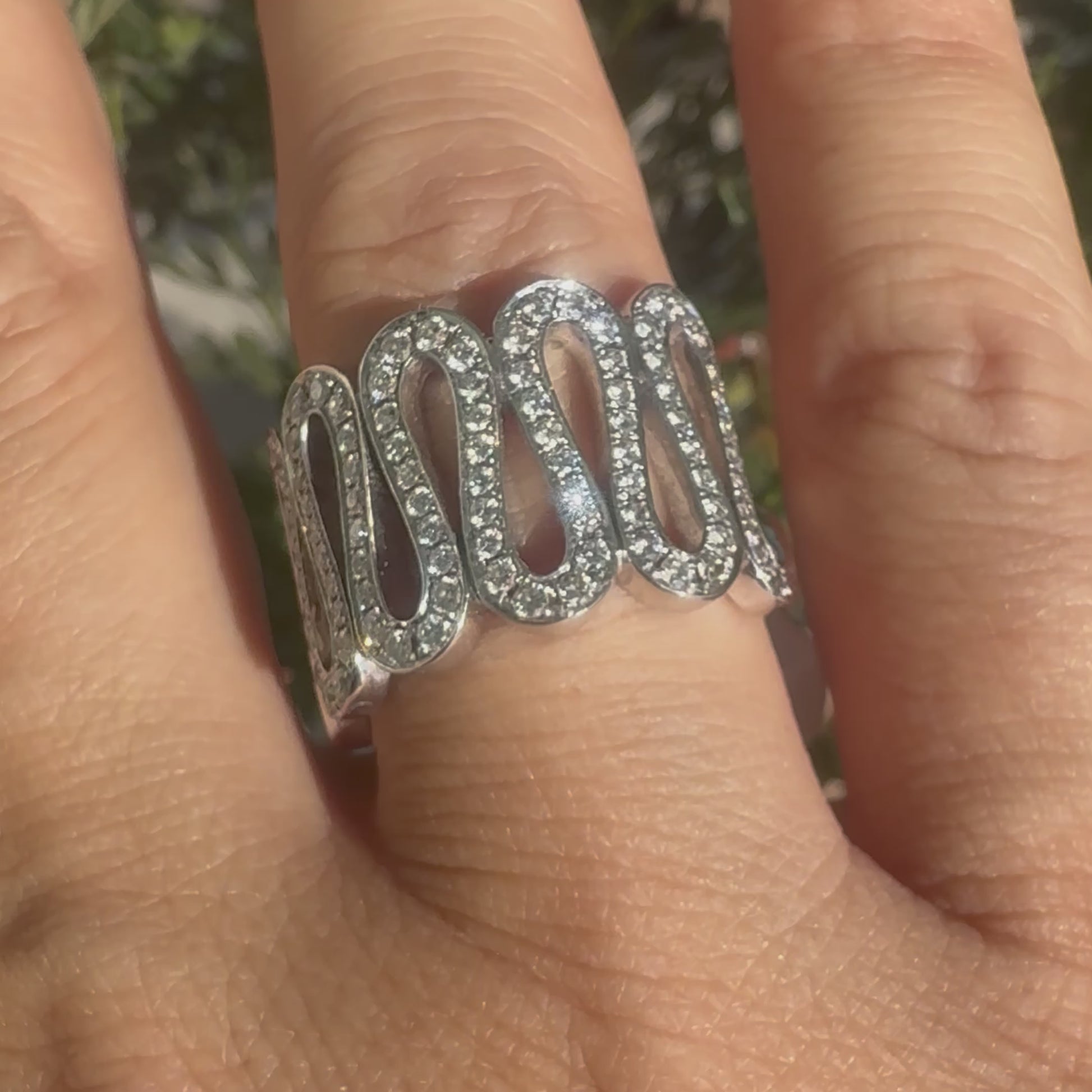טבעת זהב לבן 14 קראט משובצת יהלומים נוצצים בעיצוב גל מתפתל- פריט נועז ואלגנטי שמאיר את היד מכל זוית