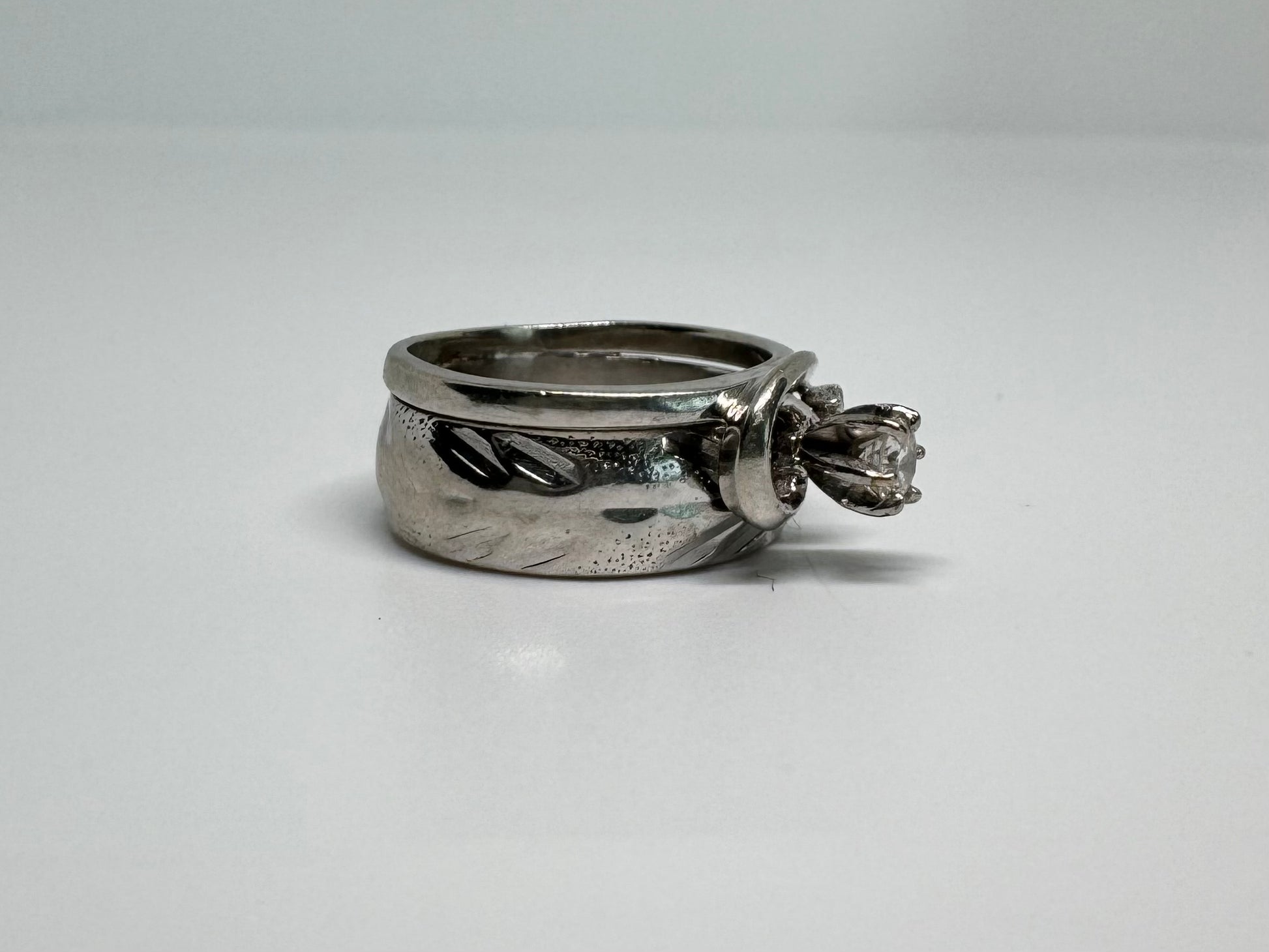 טבעת זהב לבן 14 קראט משובצת יהלום מרכזי בשיבוץ גבוה ולצידו יהלומים נוספים