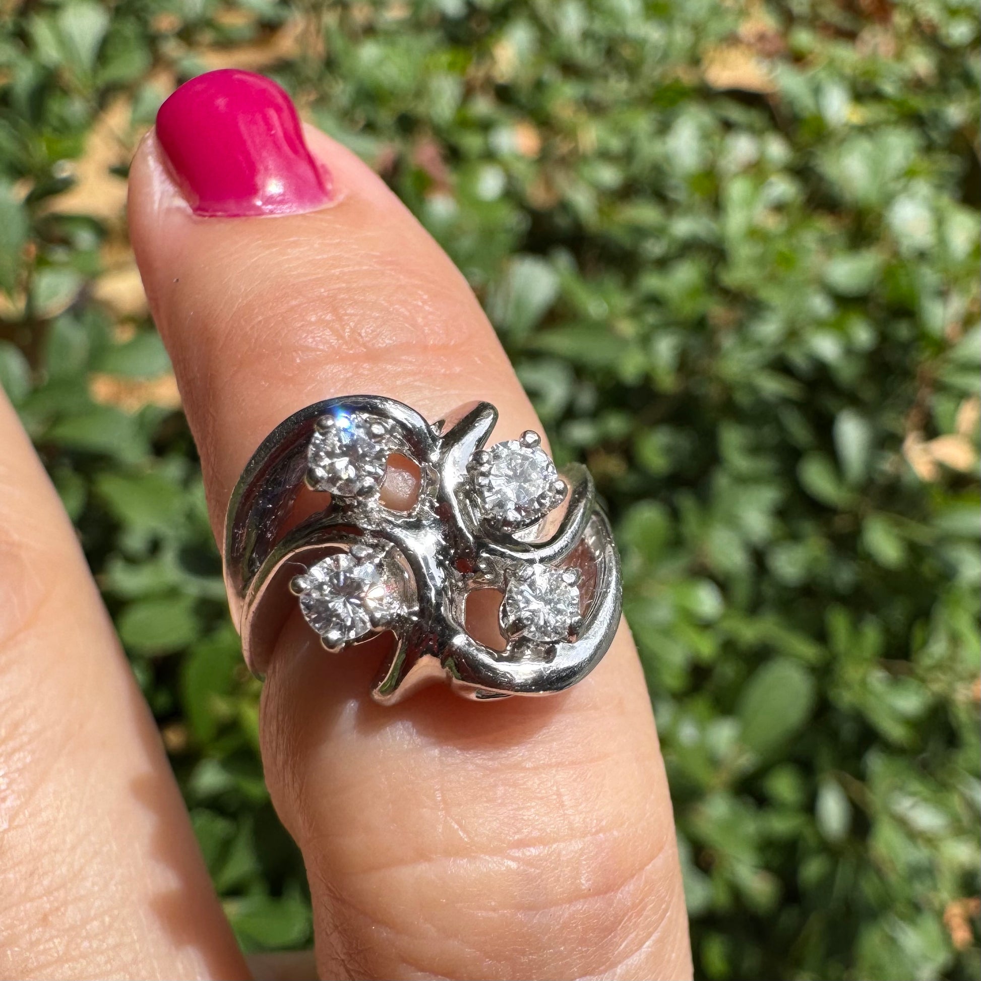 טבעת זהב לבן 14 קראט בעיצוב מודרני-פיסולי, משובצת בארבעה יהלומים נוצצים בשיבוץ חופשי המדמה תנועה אלגנטית של עלים.