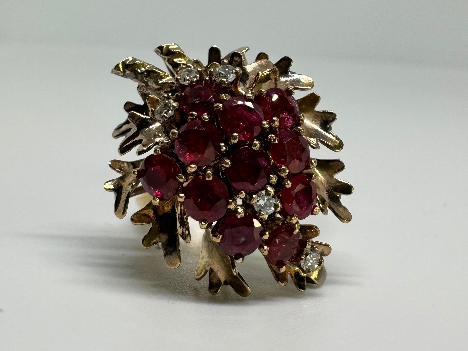 14K gold ring set with a vibrant cluster of deep red rubies and sparkling diamonds.