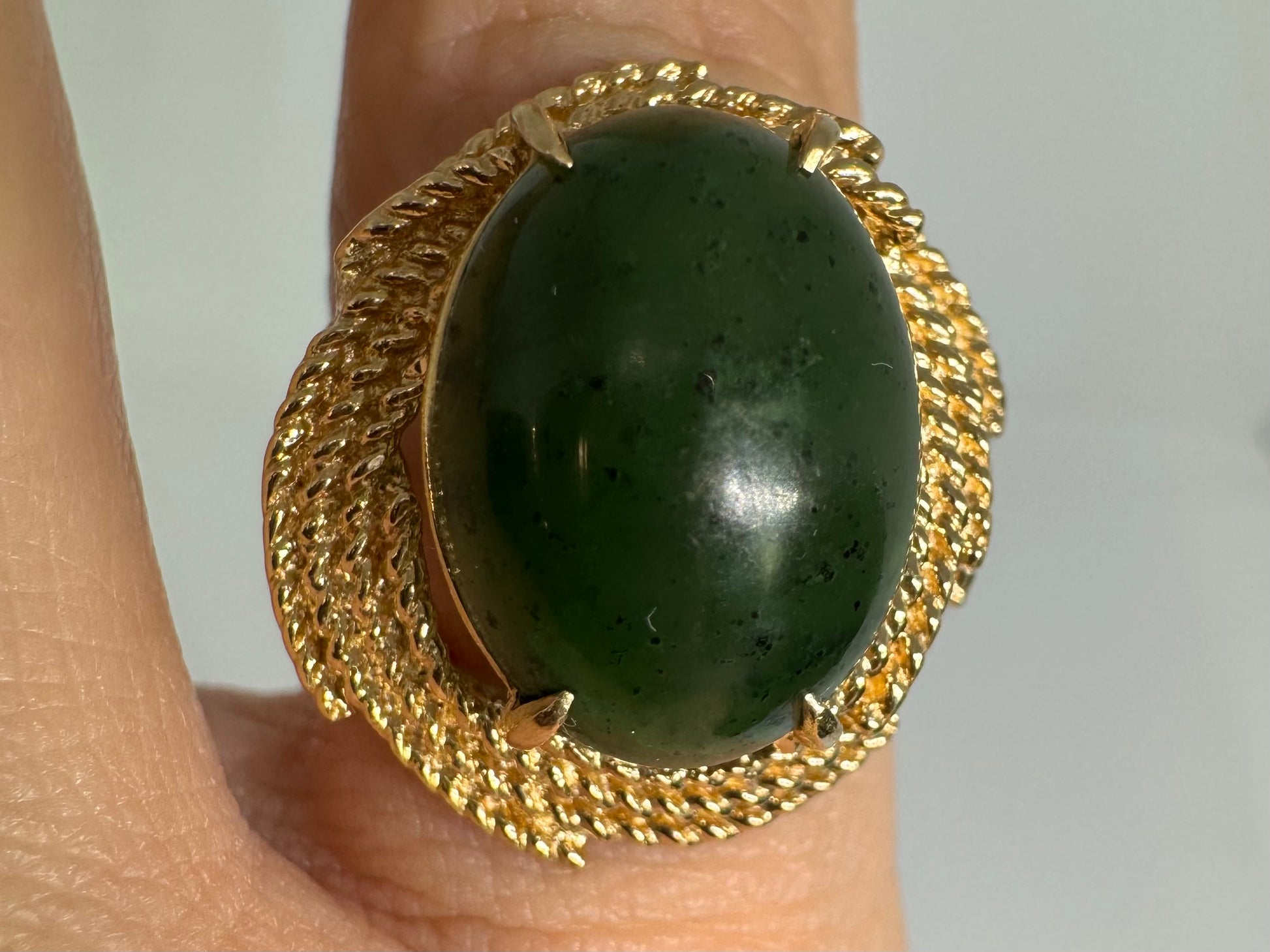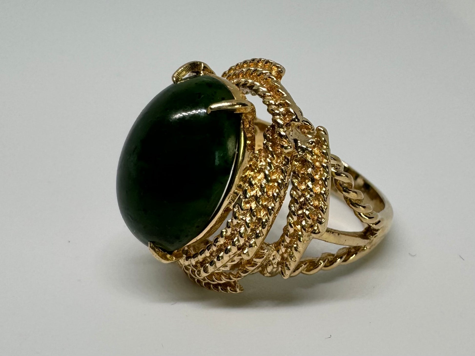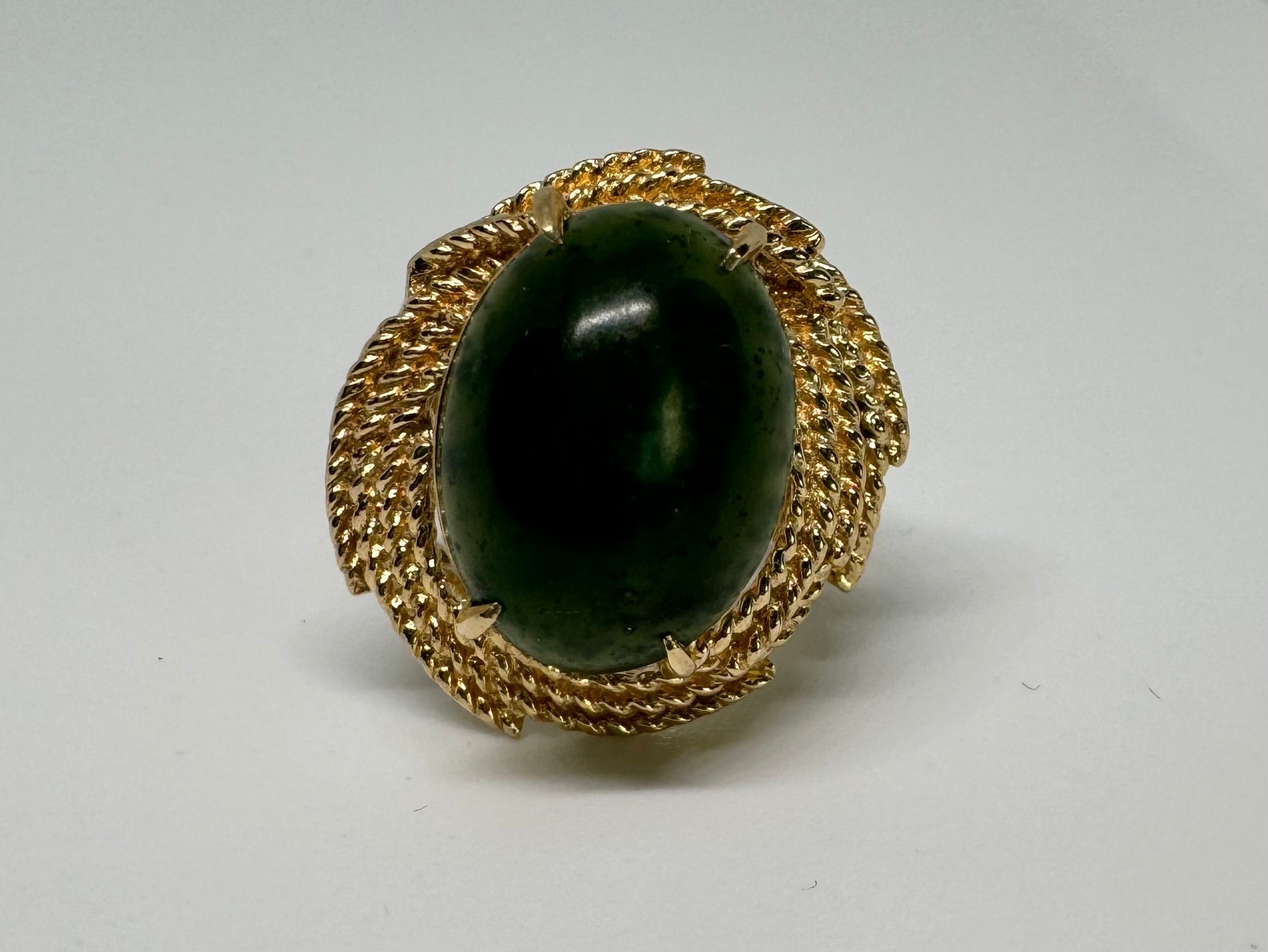 טבעת זהב צהוב 14 קראט משובצת אבן ג'ייד ירוקה