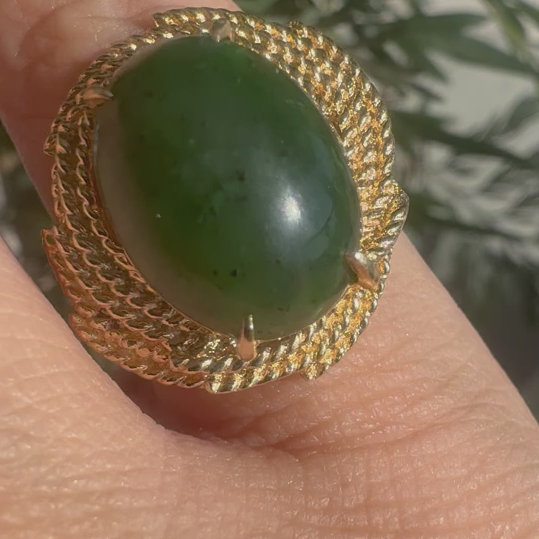 טבעת זהב צהוב 14 קראט משובצת אבן ג׳ייד בצבע ירוק במסגרת זהב מעוצבת