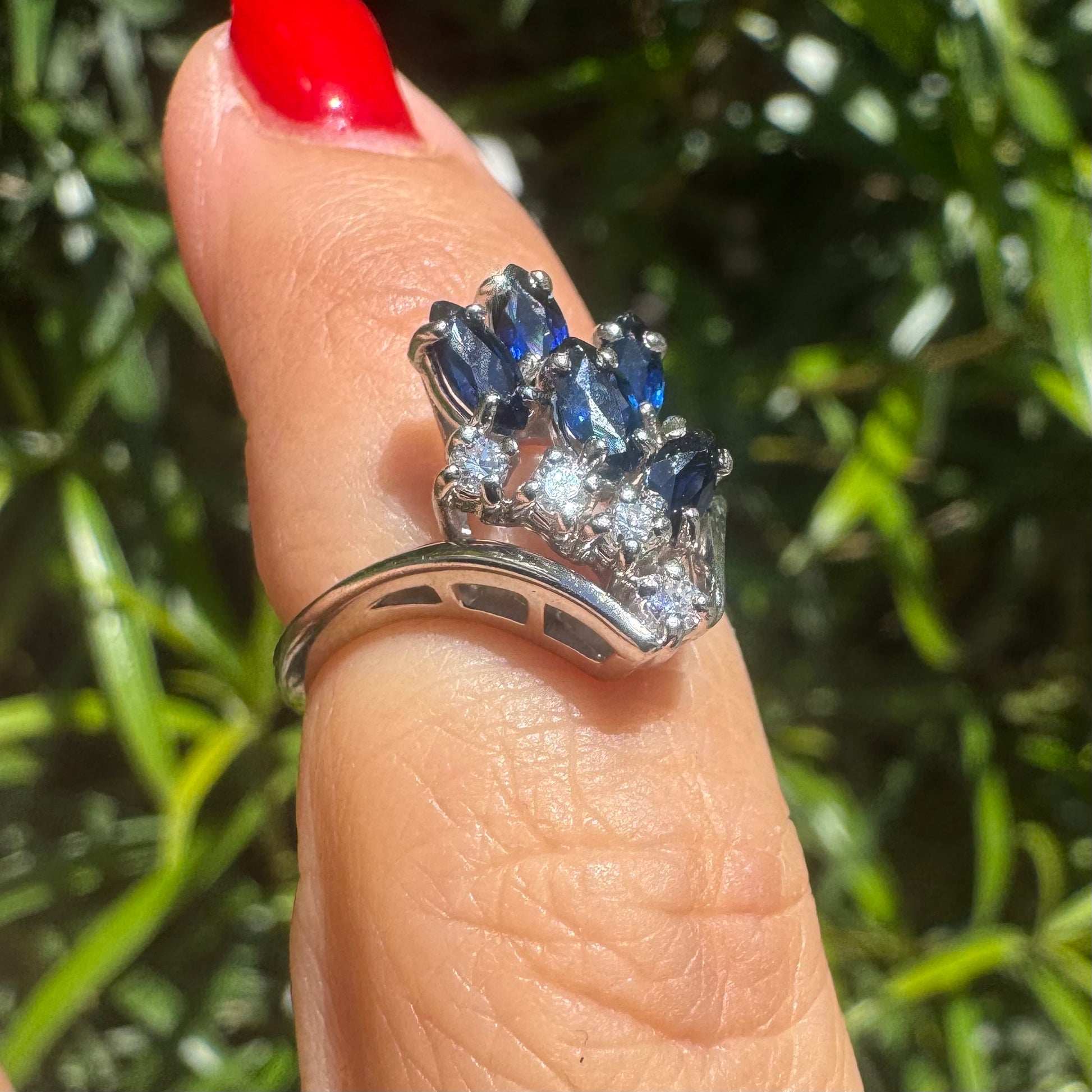 14K white gold ring set with marquise-cut deep blue sapphires & Diamonds
