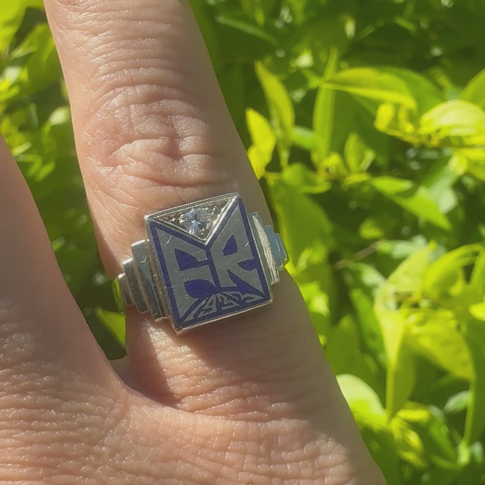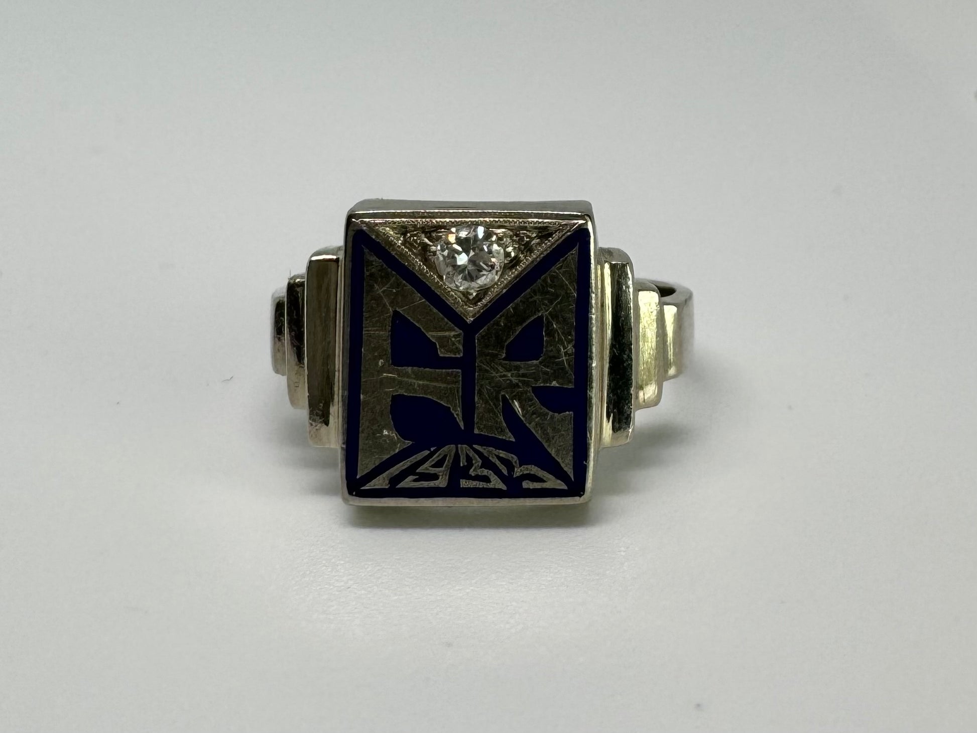 טבעת זהב לבן 14 קראט משובצת יהלום ואותיות FR
