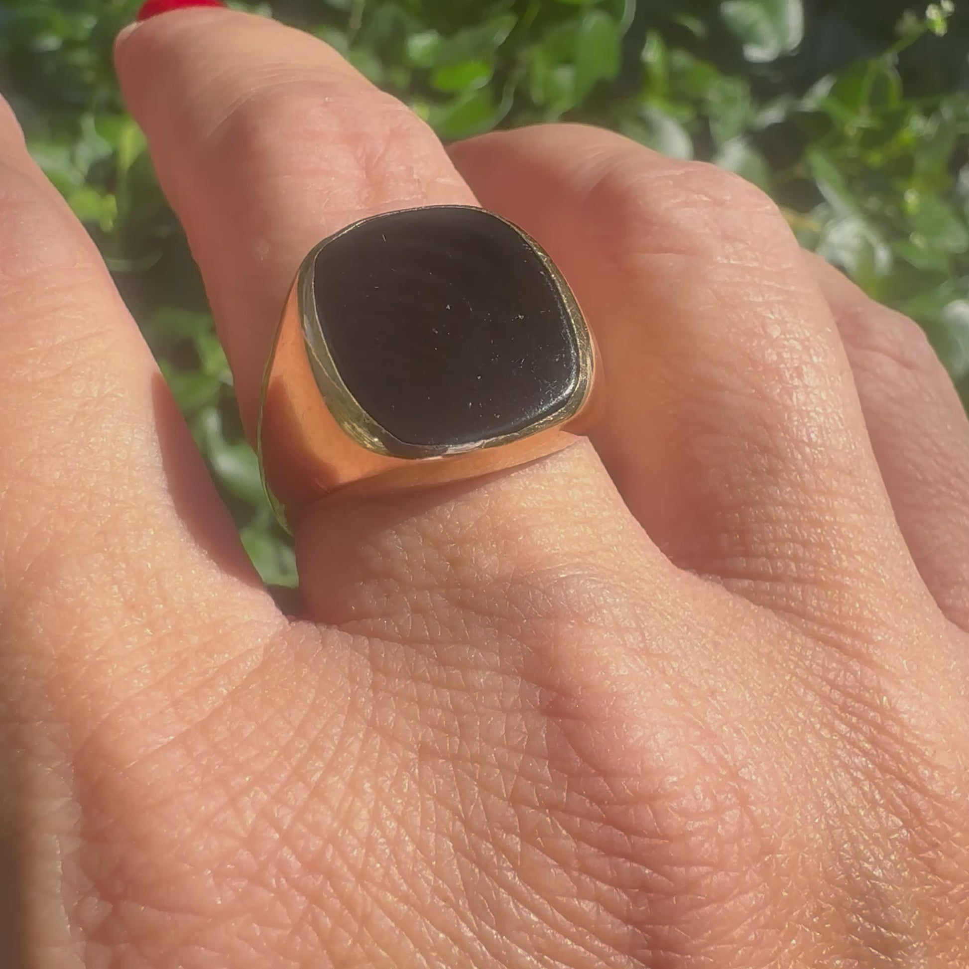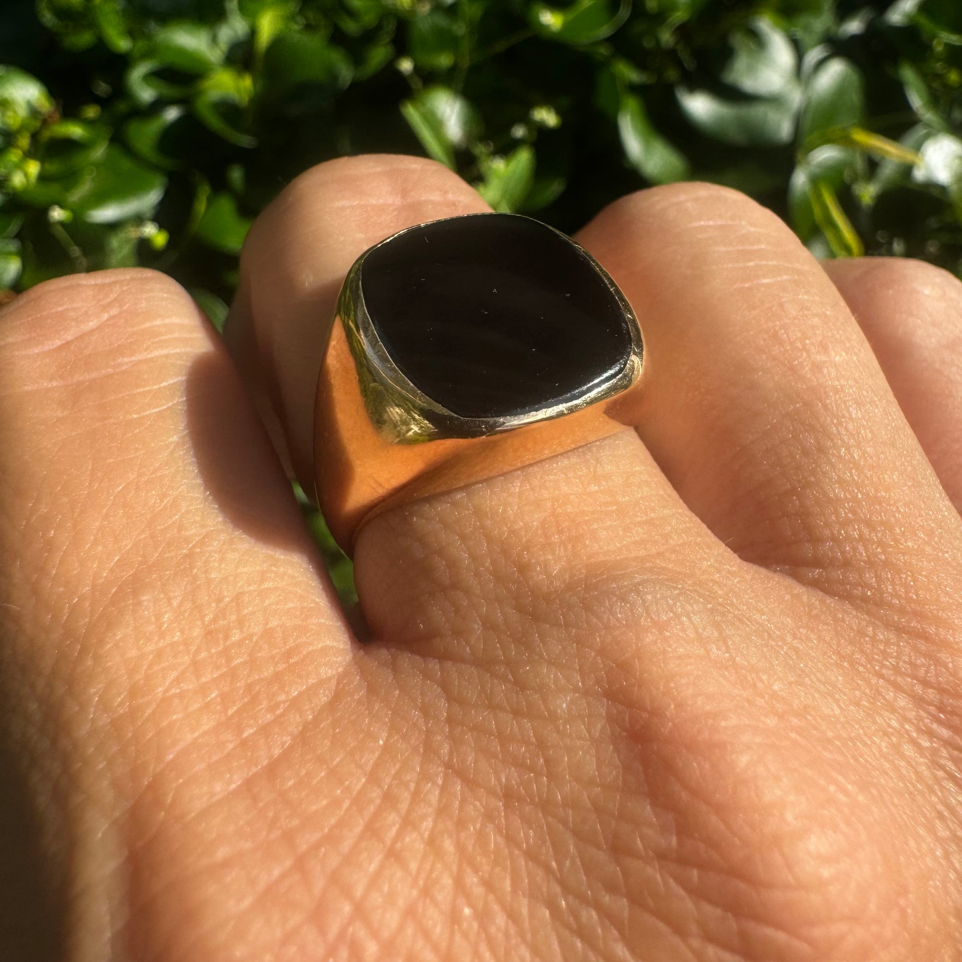 טבעת זהב צהוב 14 קראט משובצת אבן אוניקס שחורה מרובעת ומבריקה