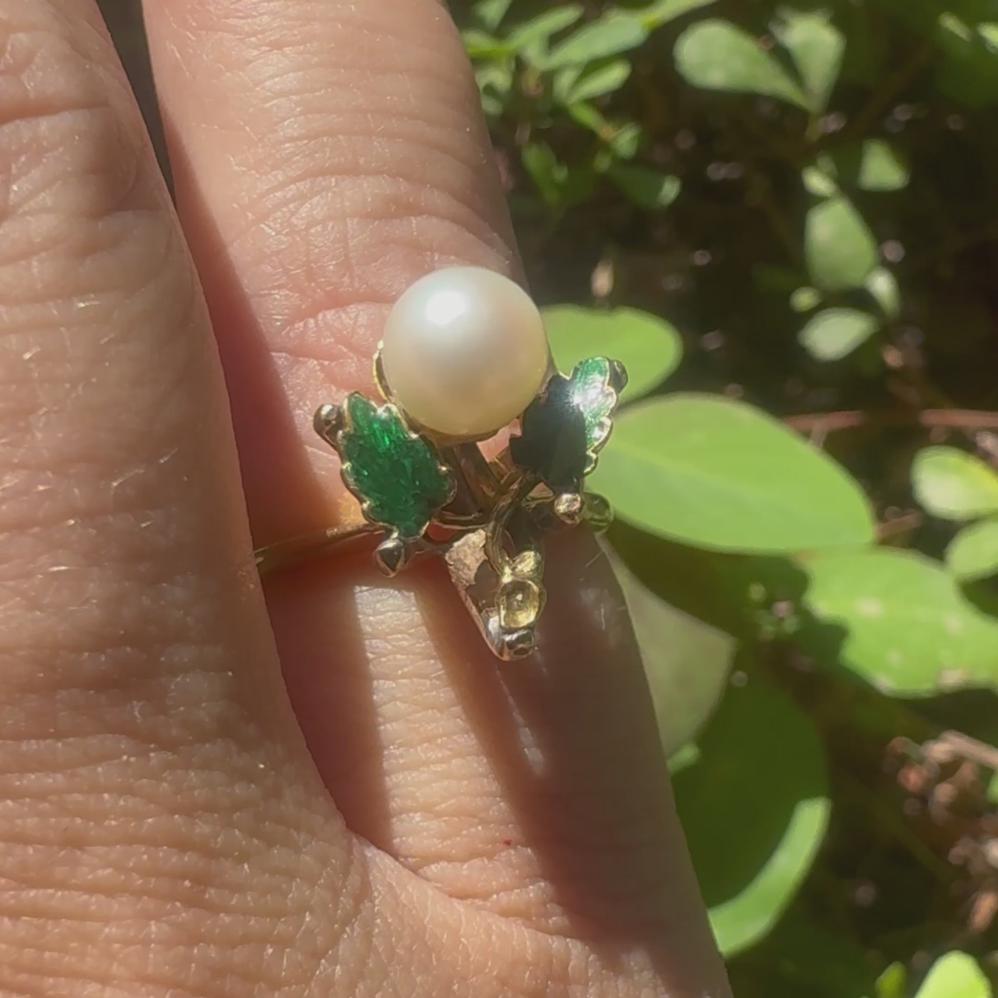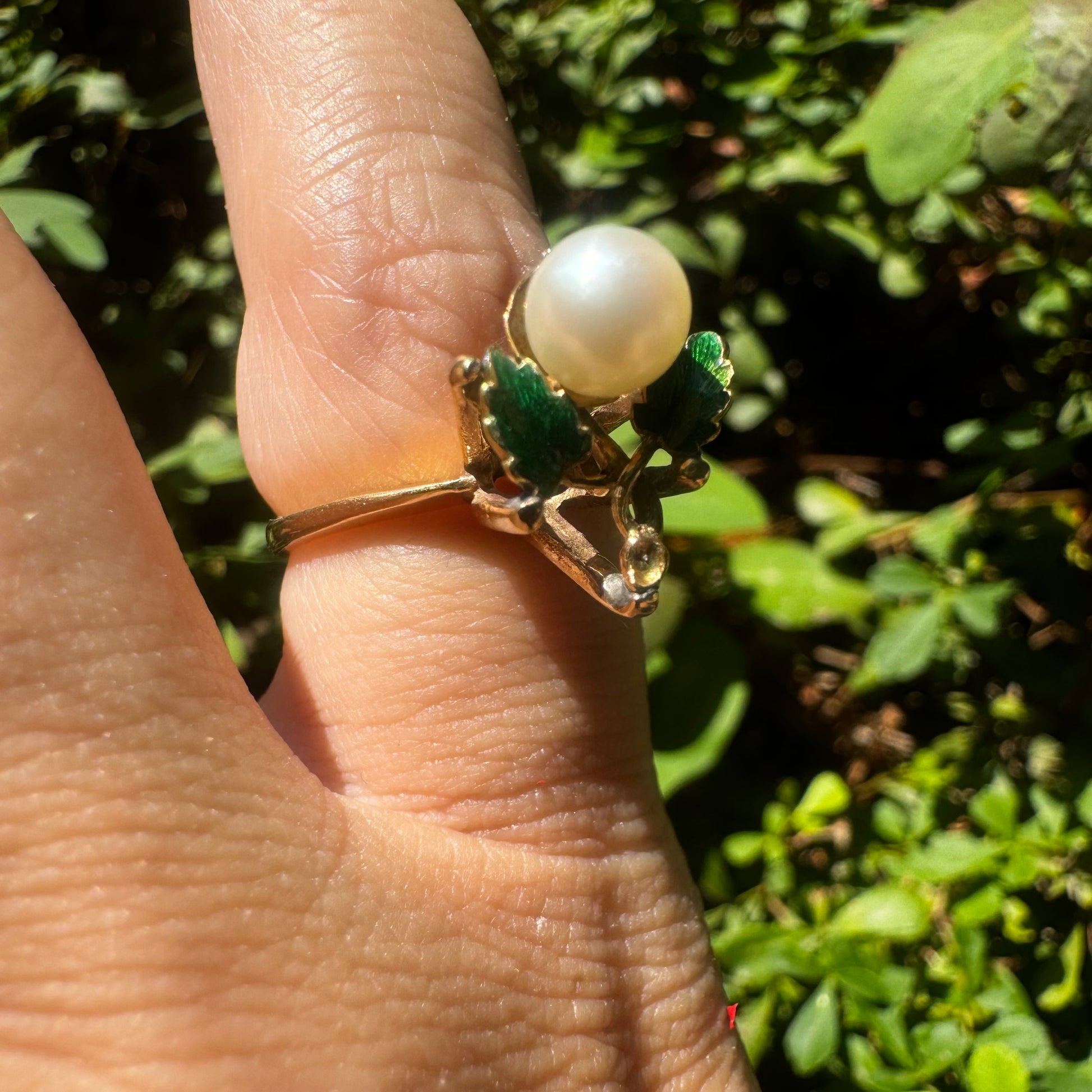טבעת זהב צהוב 14 קראט משובצת פנינה ואמייל ירוק