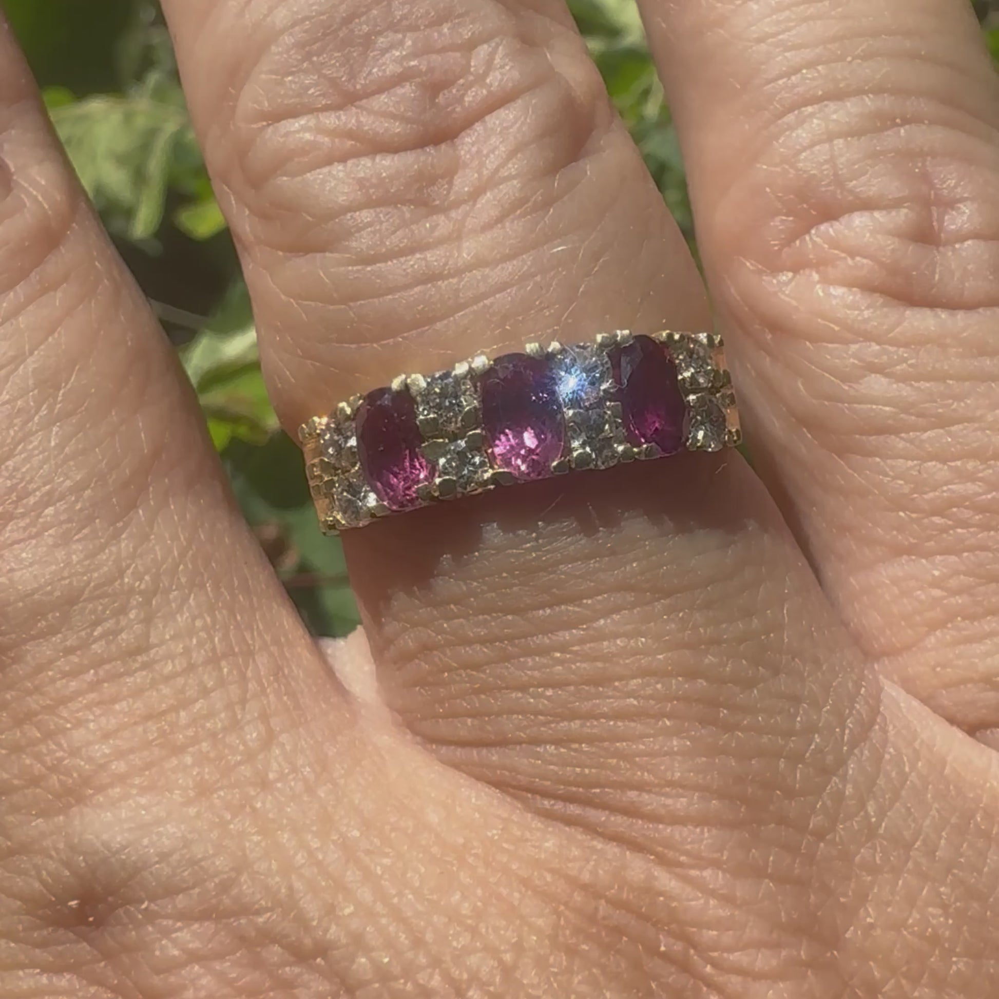 טבעת זהב צהוב 14 קראט משובצת בשורות של אבני טורמלין בצבע ורוד אובליות ונוצצות, כשביניהן שיבוצים של יהלומים עגולים שמוסיפים לה ברק וזוהר.