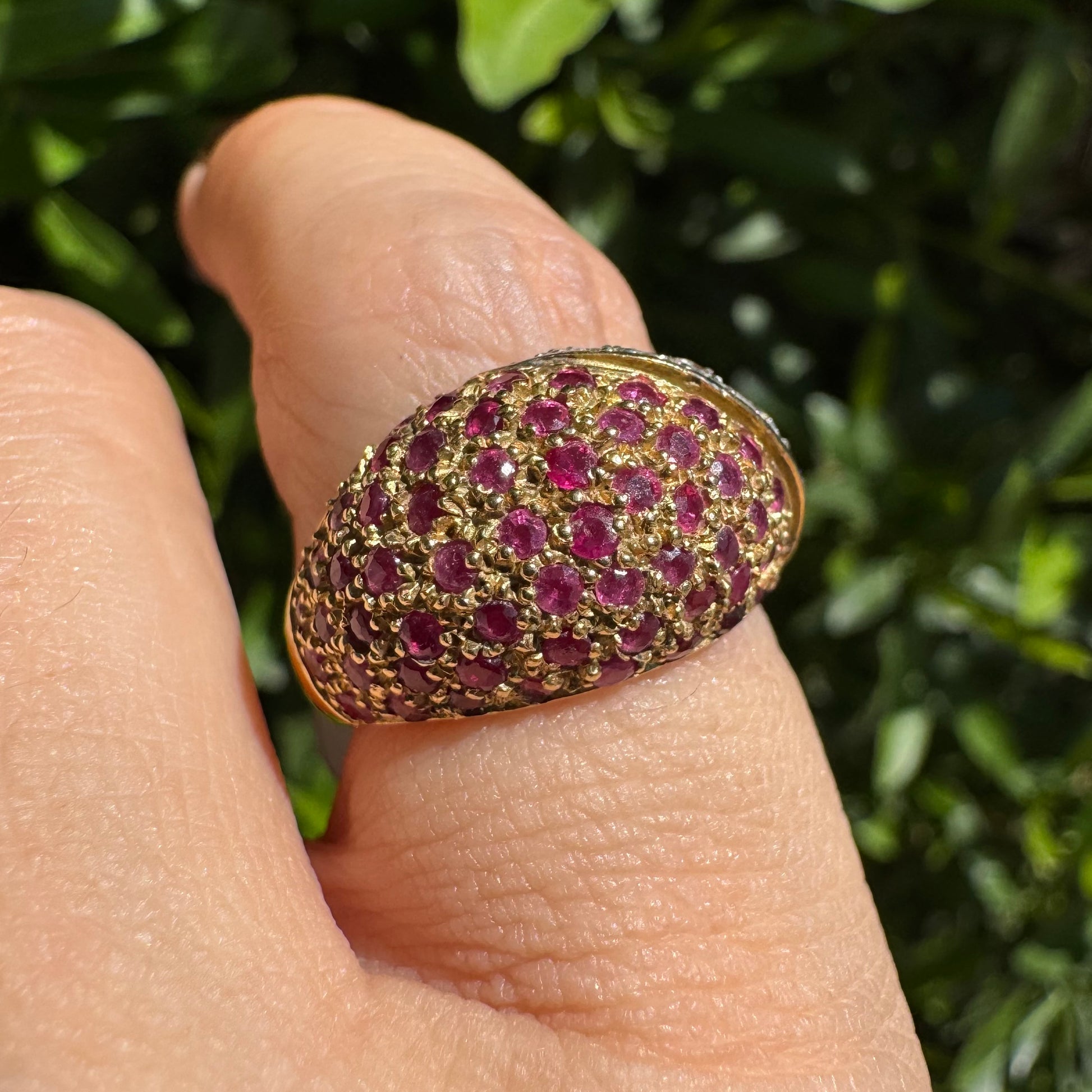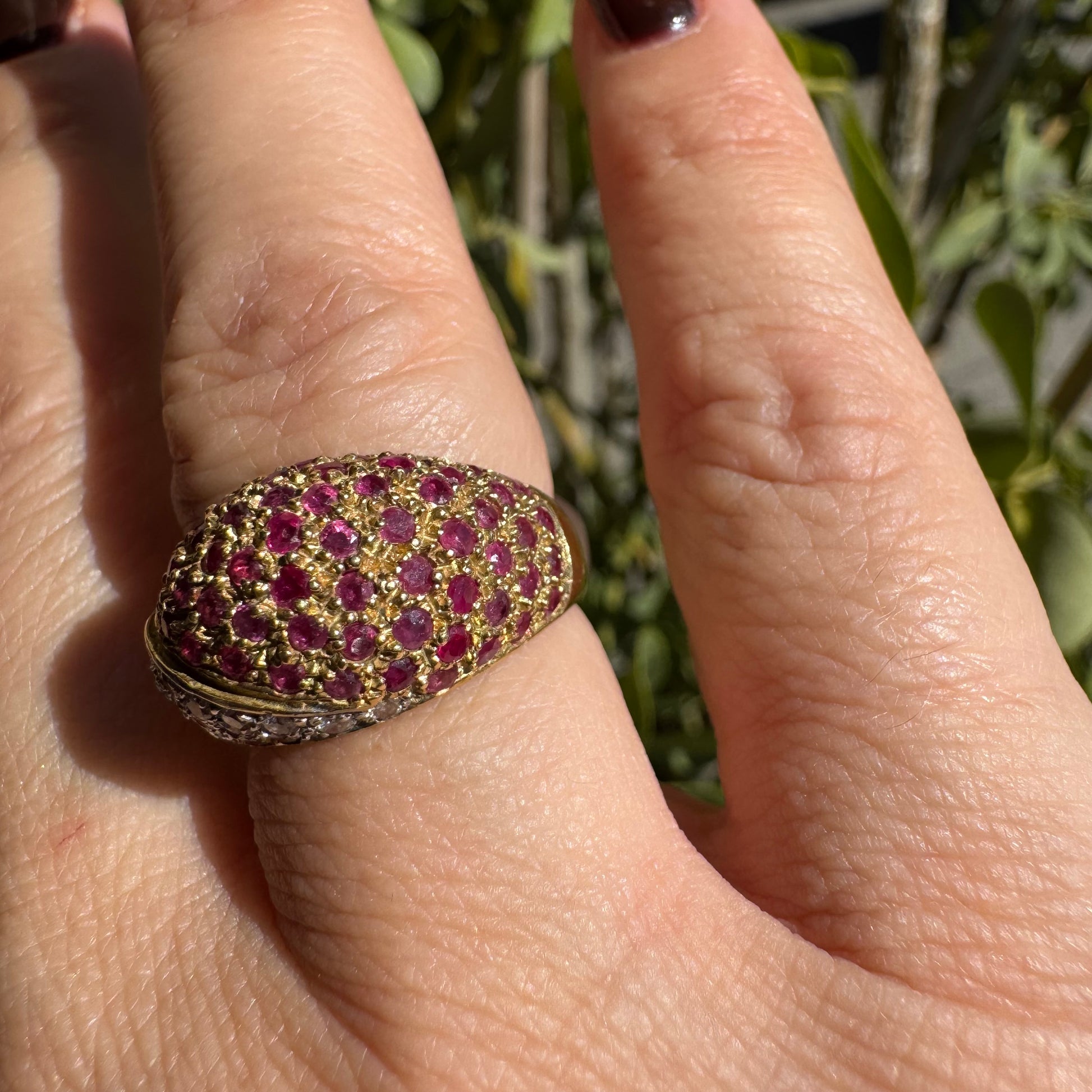 14K yellow gold dome ring pavé-set with Diamonds and vivid Rubies in a striking two-tone design