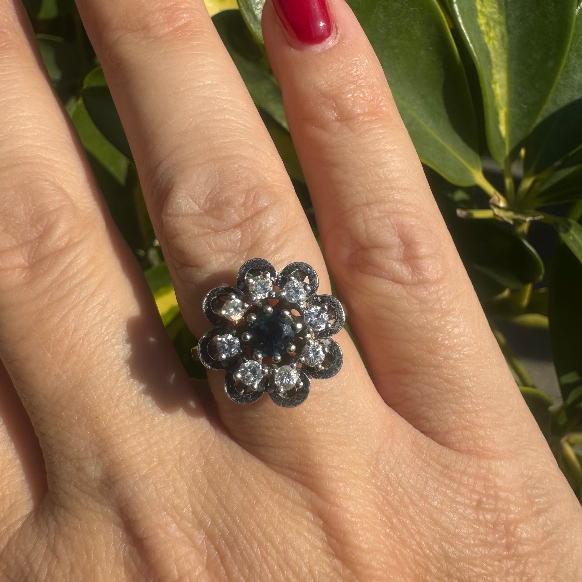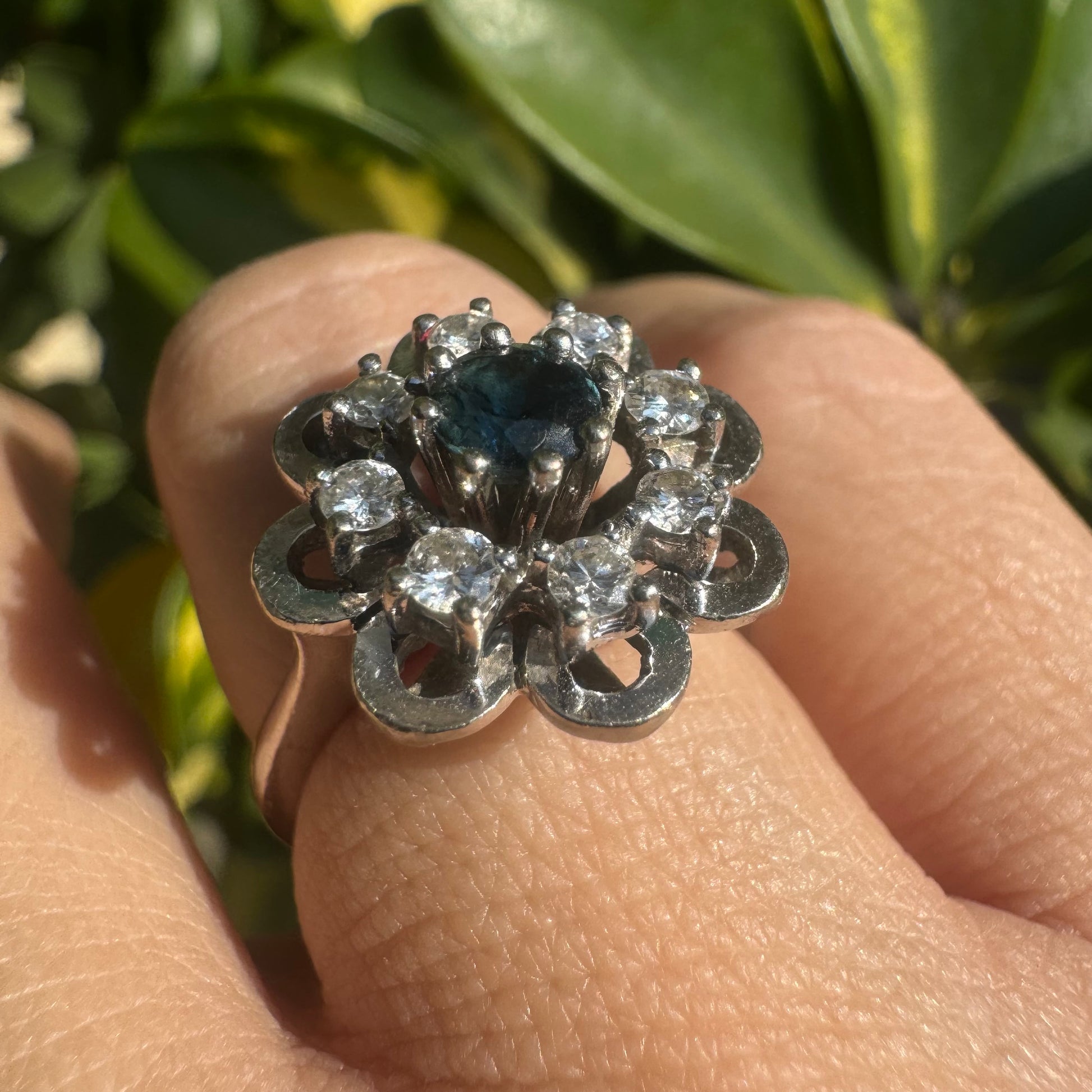 14K white gold floral ring set with a round deep blue Sapphire at its center & Diamonds