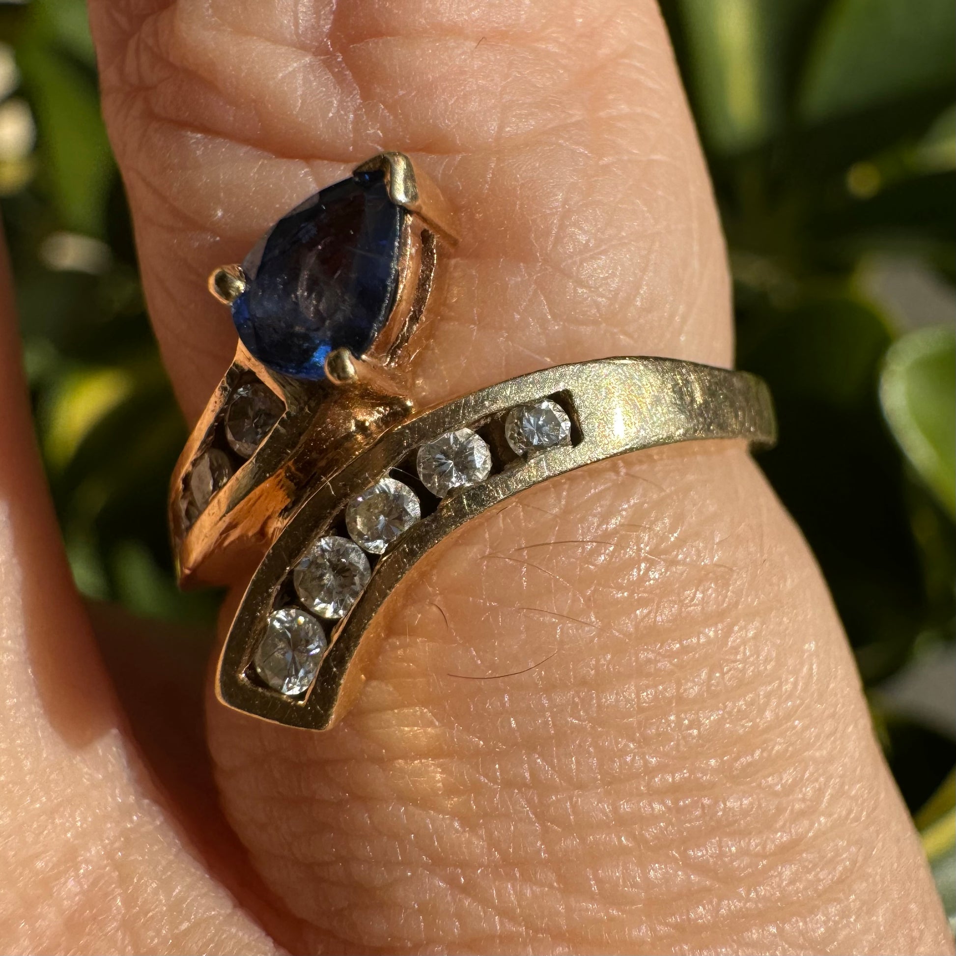 14K gold ring set with a teardrop-shaped Sapphire & Diamonds