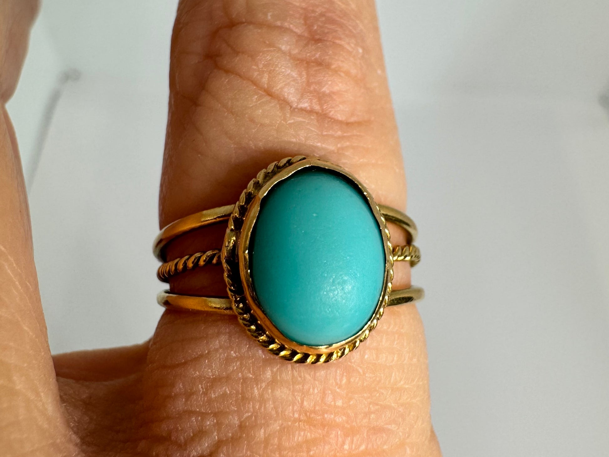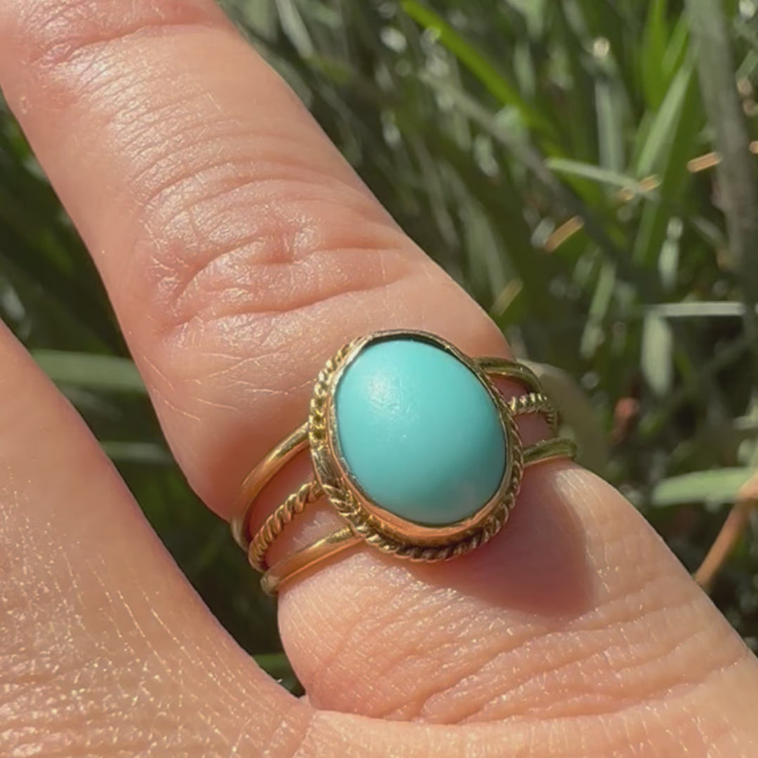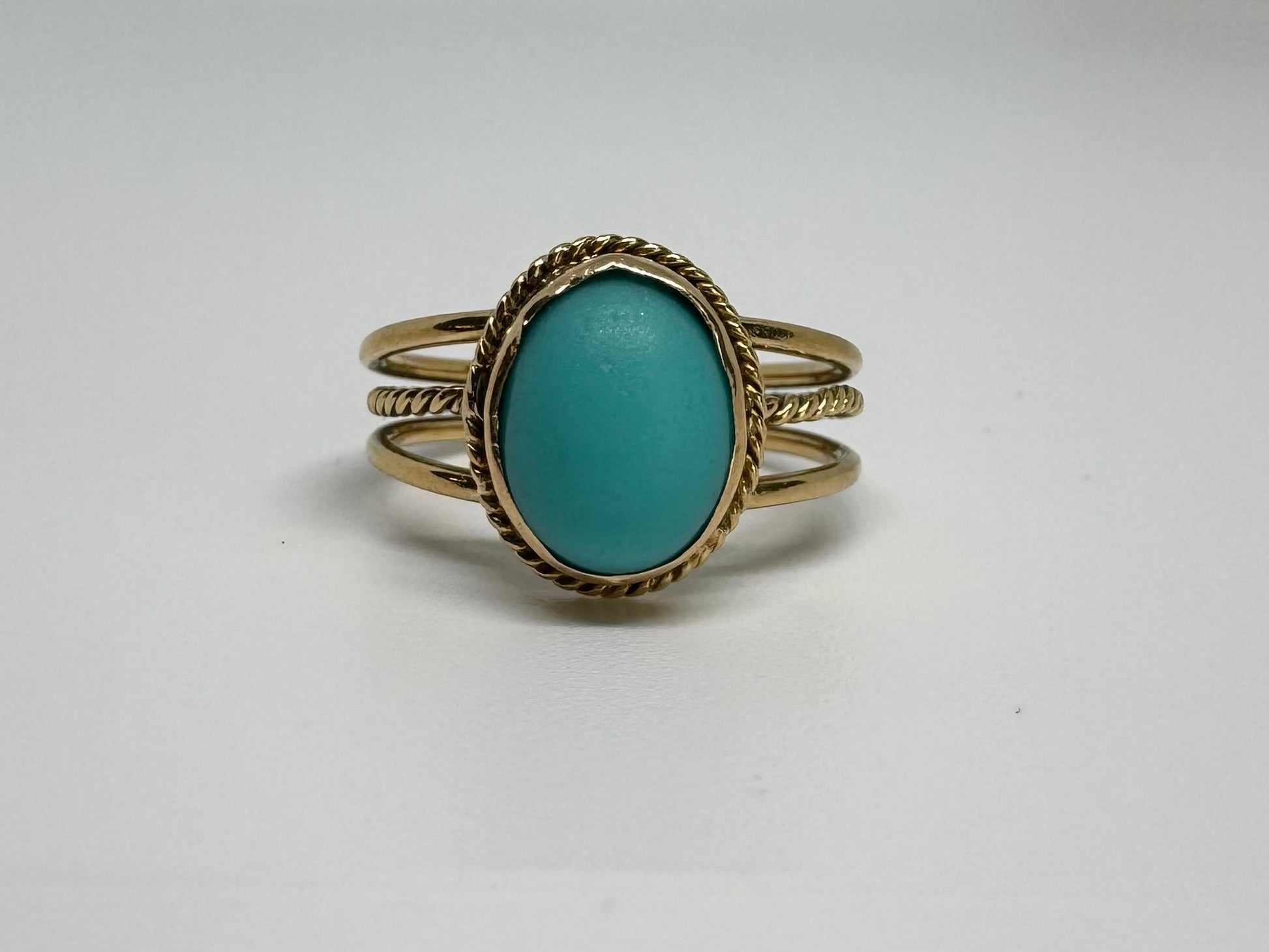 14K gold ring set with an oval Turquoise stone in a delicate rope-style bezel