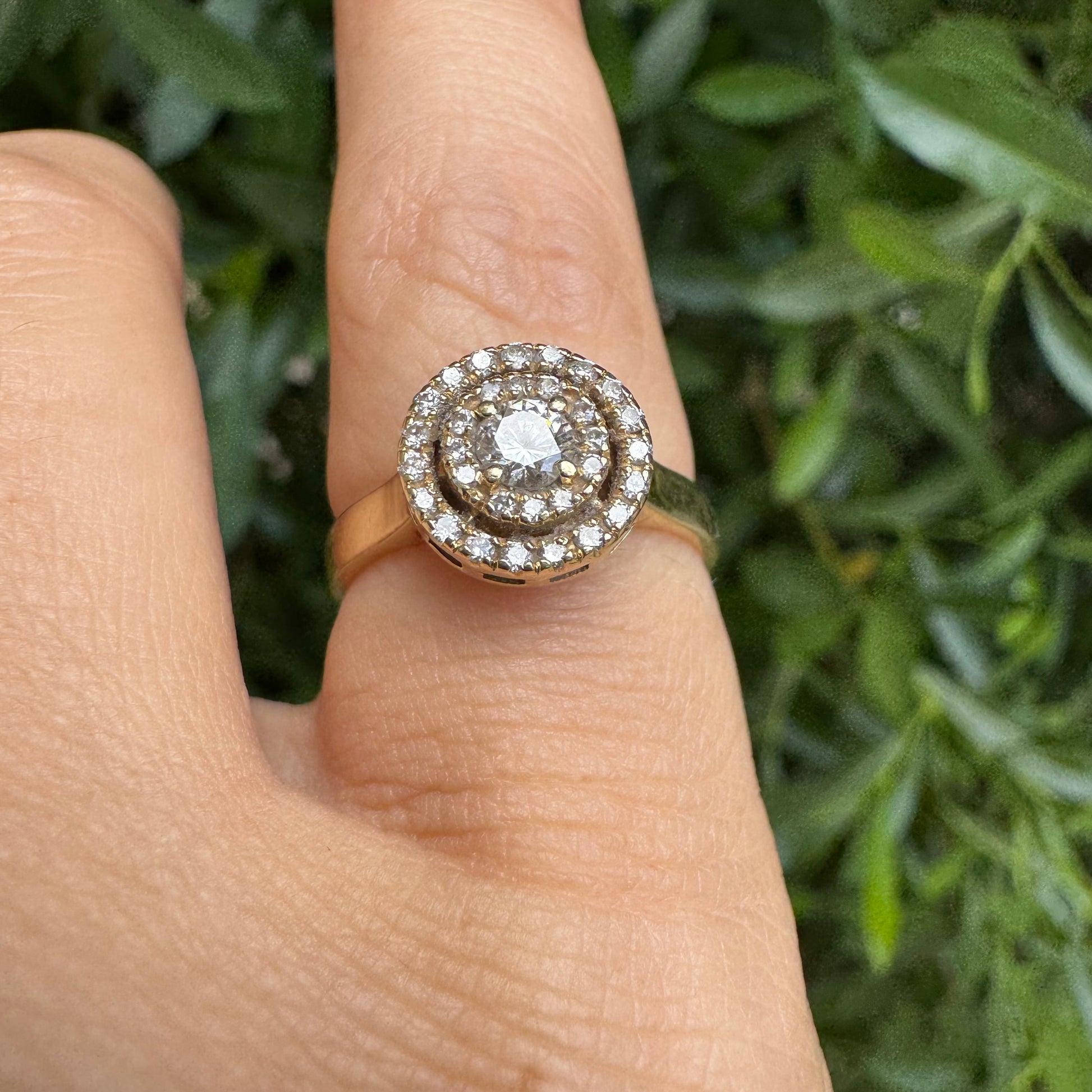טבעת זהב צהוב 14 קראט משובצת יהלום מרכזי עגול מוקף בשתי שכבות של יהלומים קטנים יותר, המעצימות את הברק והנוכחות של הטבעת