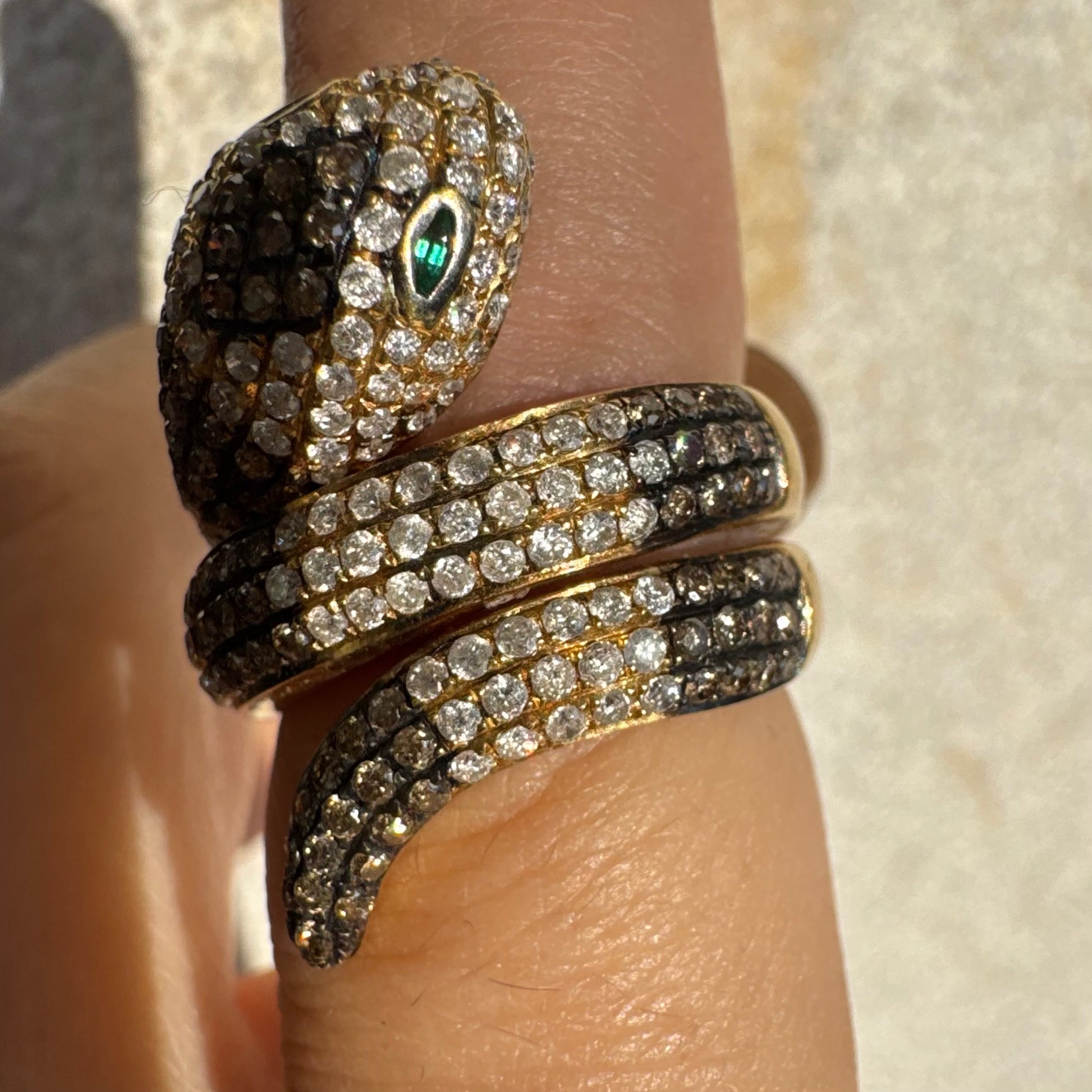 14K yellow gold snake ring fully set with white and black Diamonds, creating a striking contrast and luxurious sparkle.