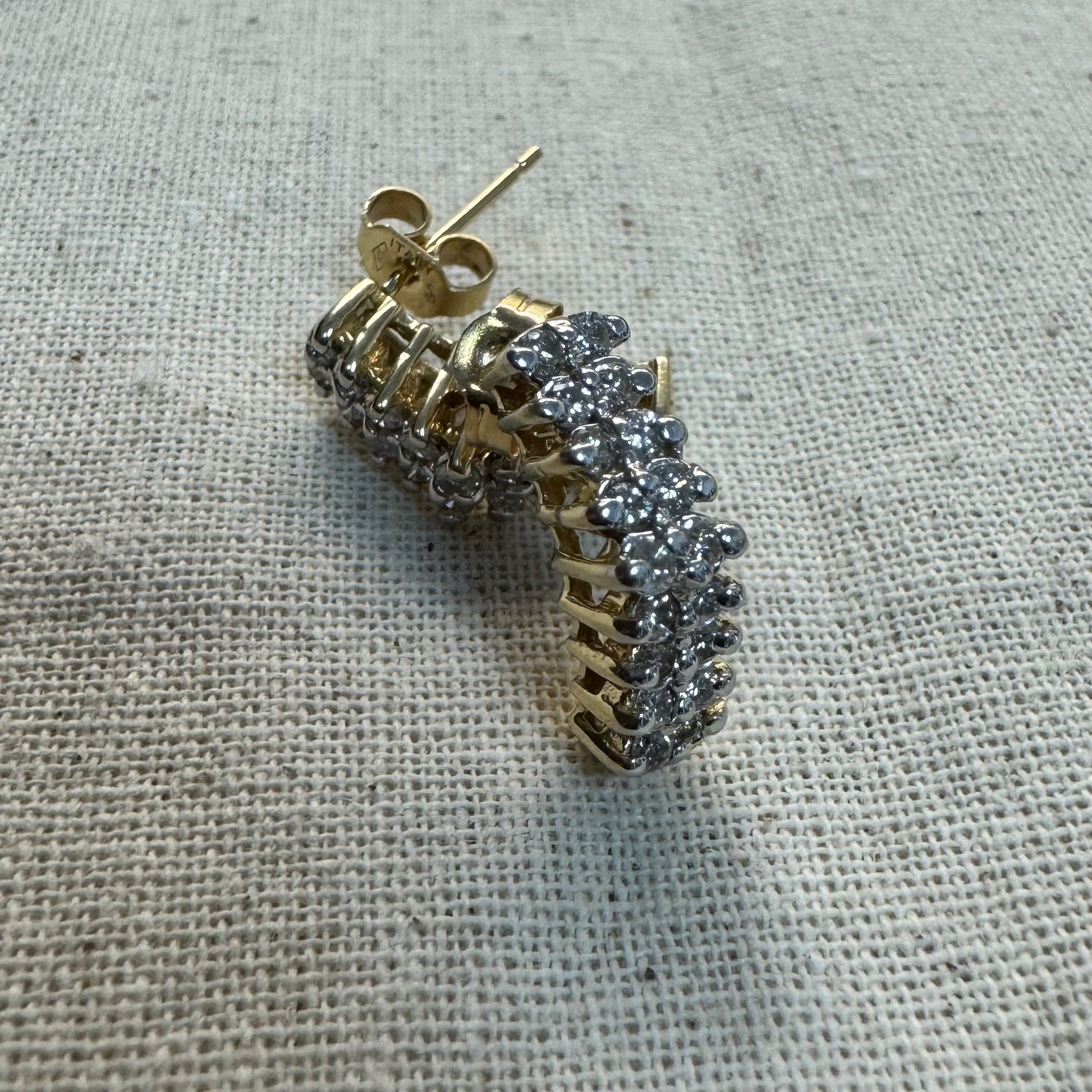 עגילי זהב צהוב 14 קראט בעיצוב חצי חישוק, משובצים יהלומים מנצנצים בשיבוץ צפוף המעניק מראה עשיר ונוכח.