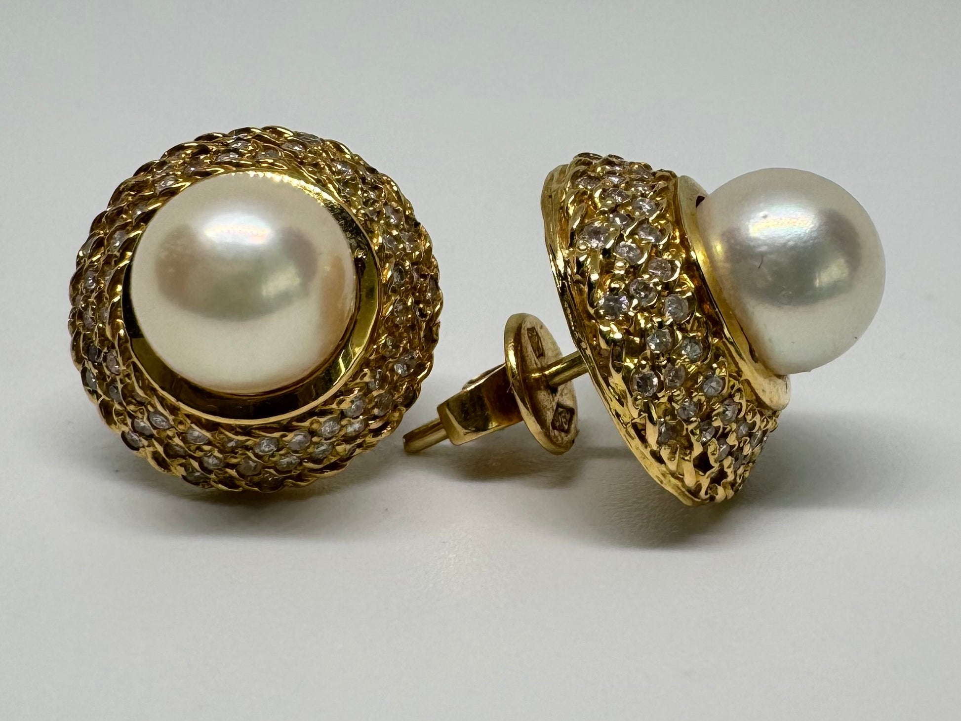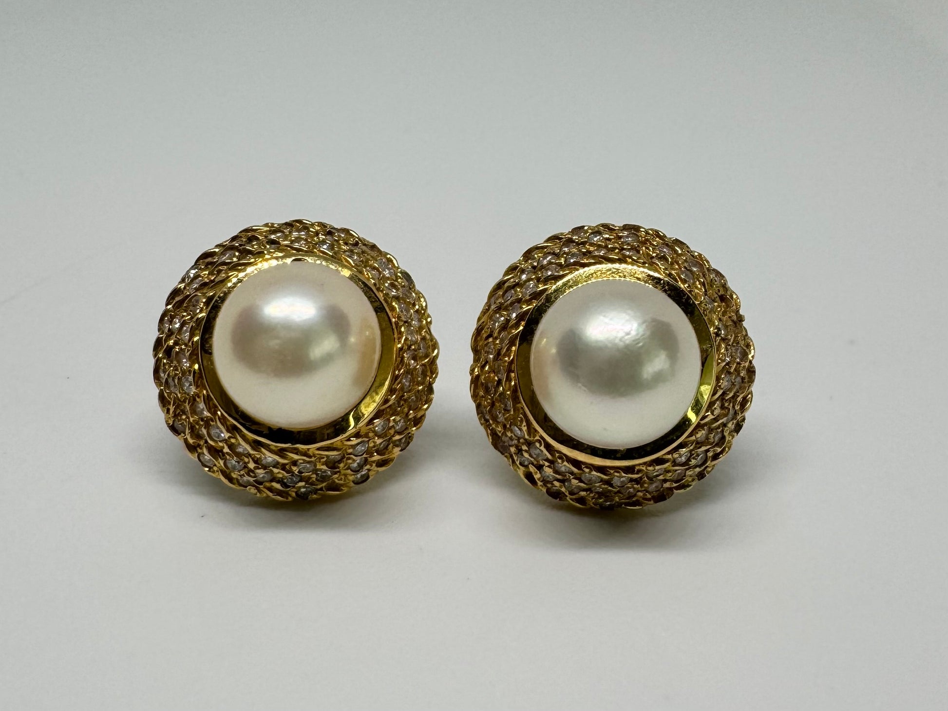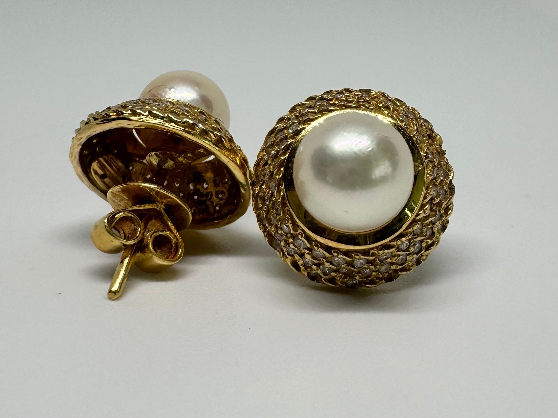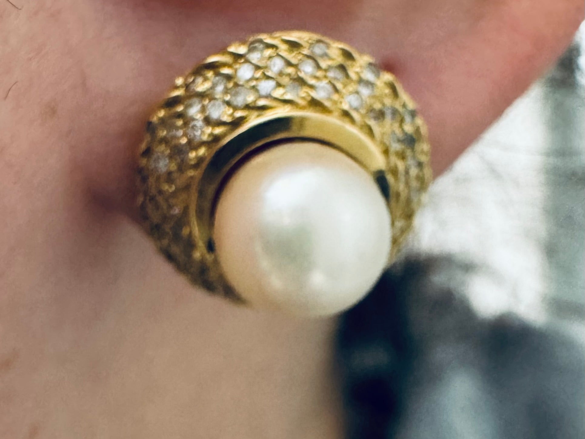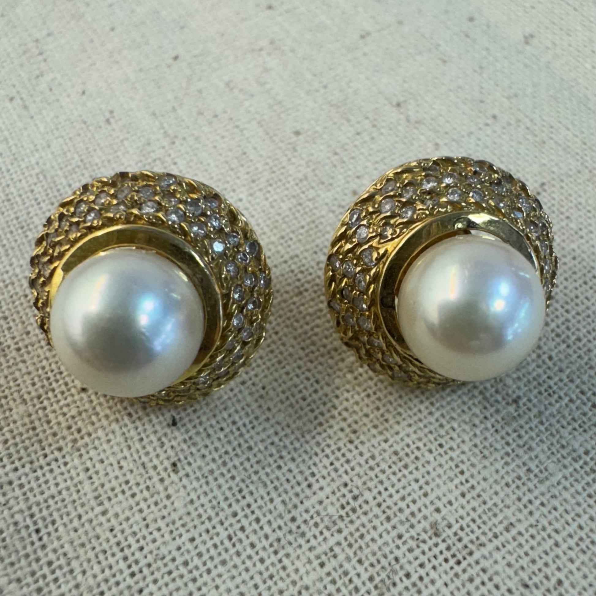 14K yellow gold Stud Earrings set with Pearl & Diamonds